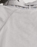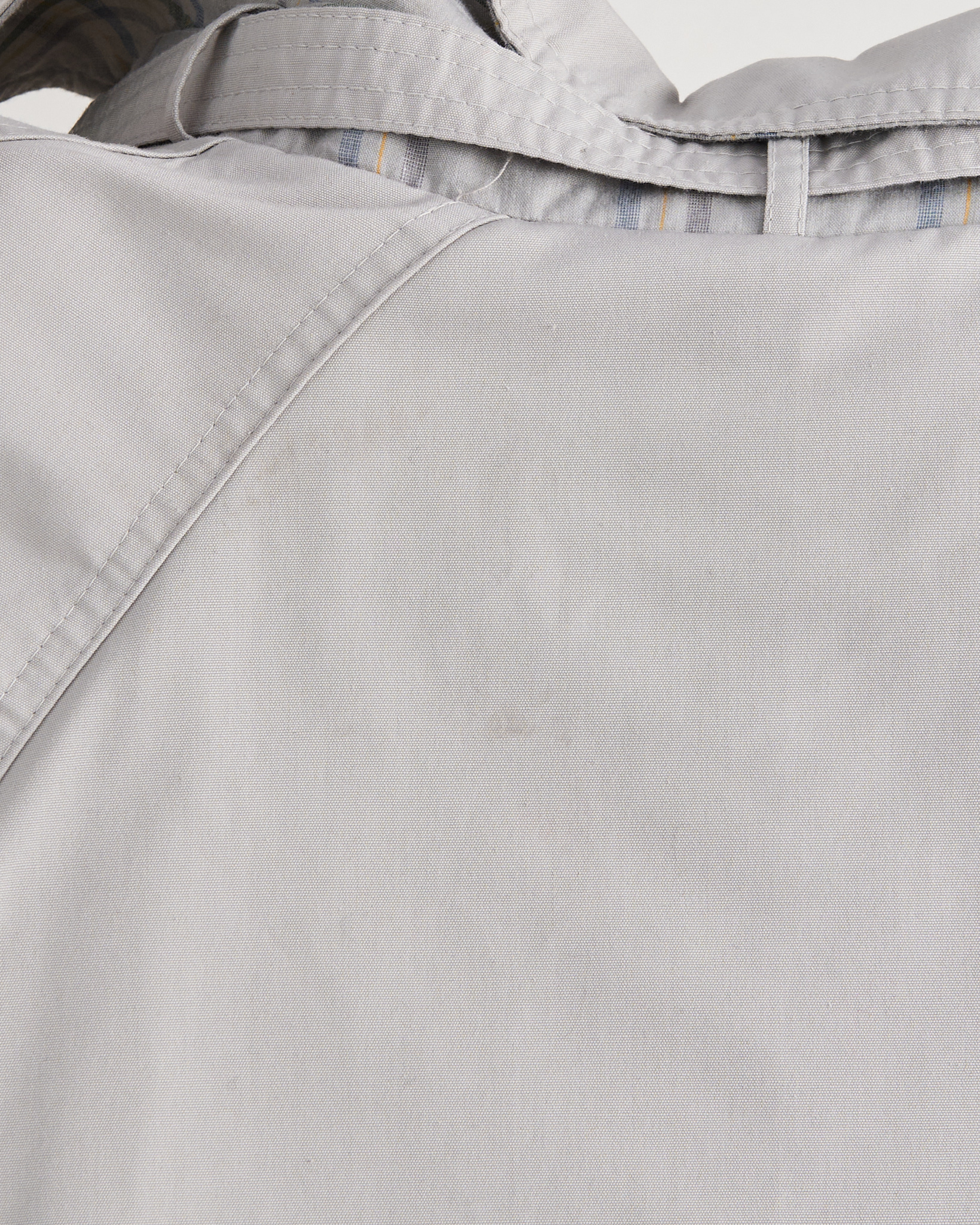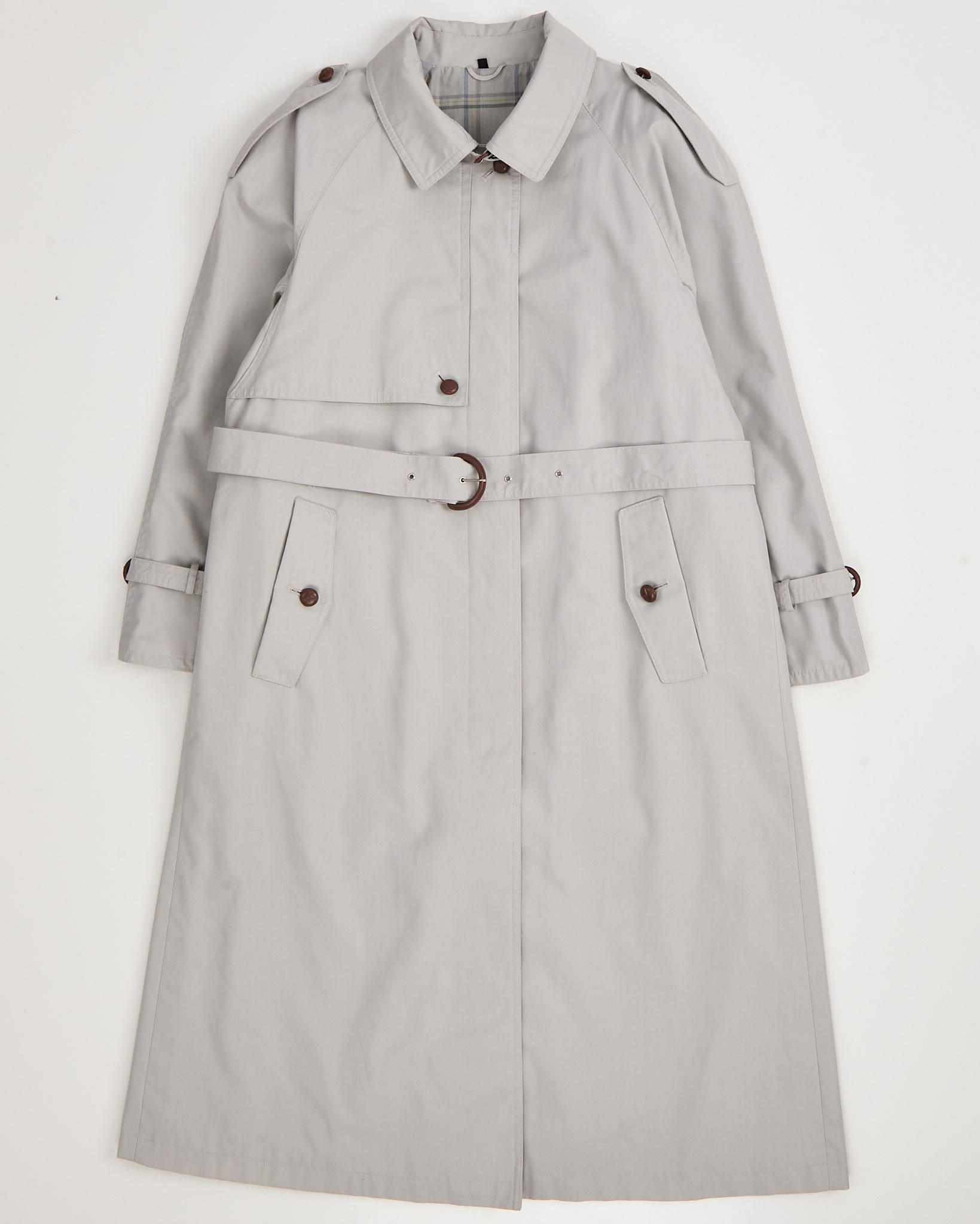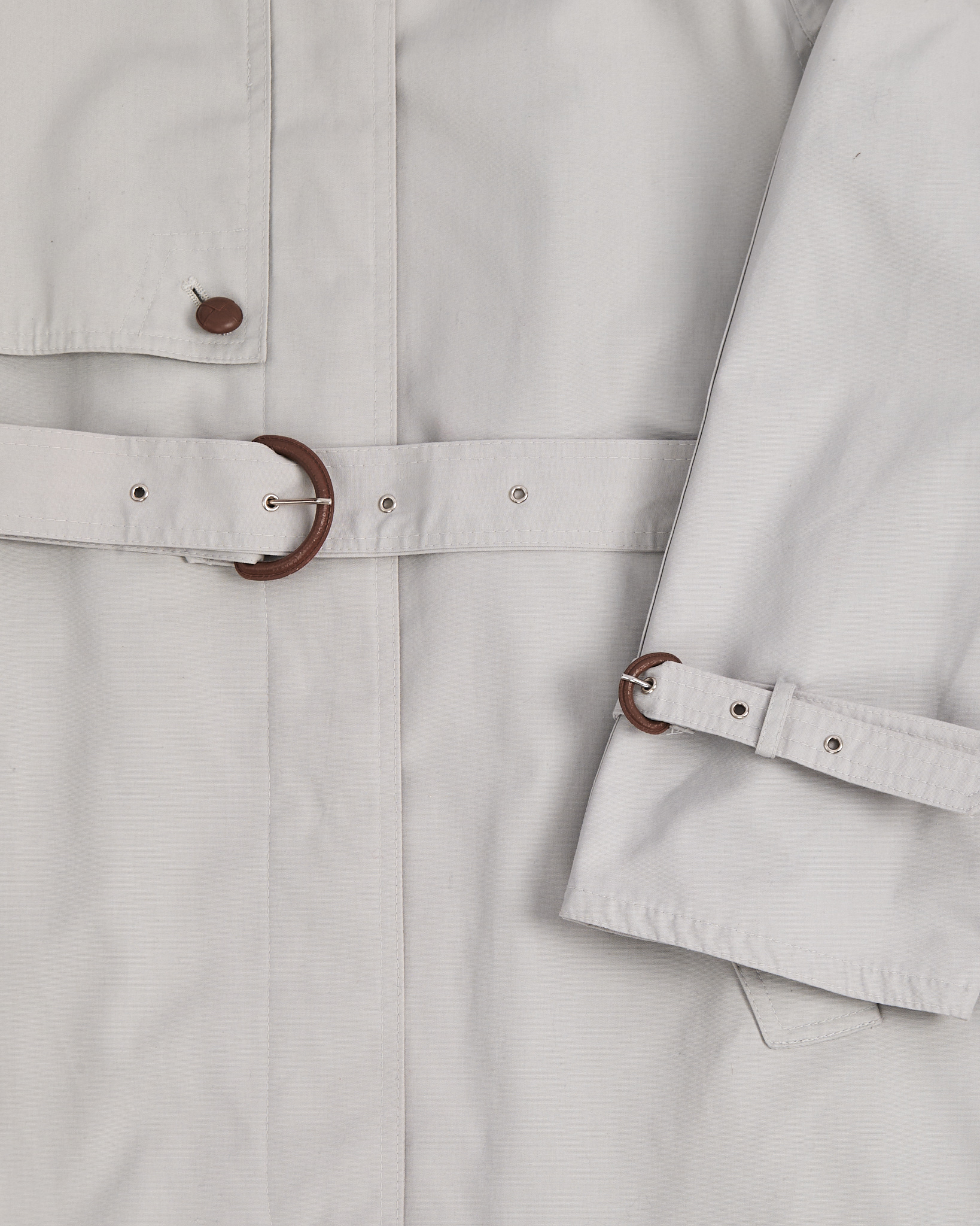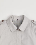 Светло-серый  тренч с поясом и аккуратной линией плеч. Свободная посадка, плотный материал с содержанием хлопка, внутренняя подкладка в клетку. Регулируемый пояс подчеркивает талию и позволяет менять посадку. Детали с кольцами и контрастными пуговицами.