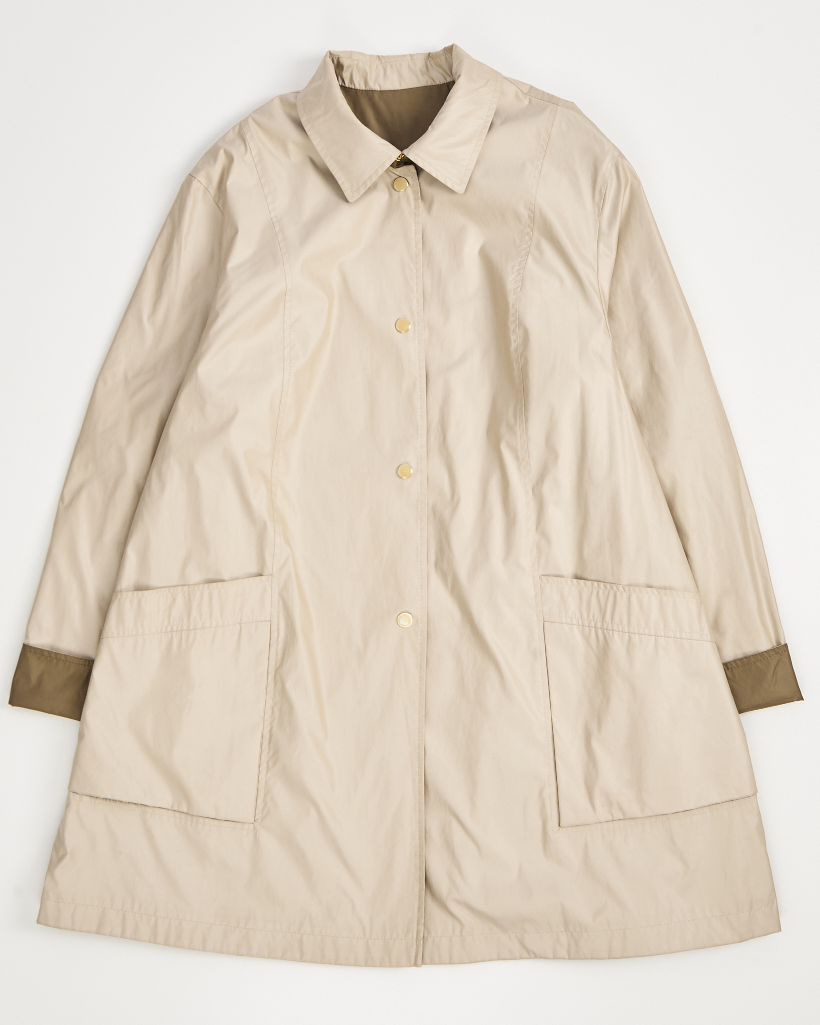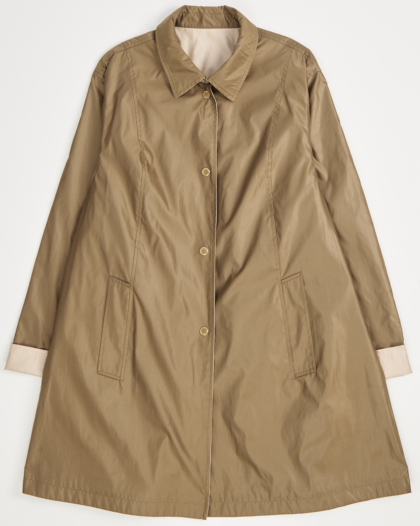 Тренч Elegance Paris двусторонний. Тренч из гладкой ткани с лёгким матовым блеском. Прямая посадка, двусторонняя модель-трансформер позволяет носить тренч в двух вариациях. Крупные накладные карманы и лаконичная линия воротника.