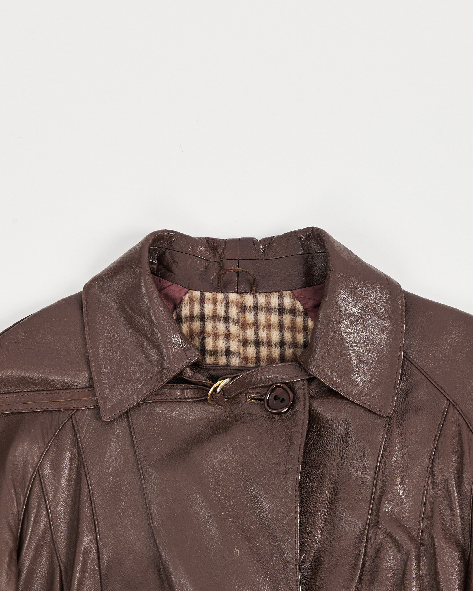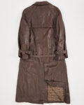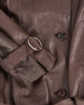 Плащ из 100% плотной натуральной кожи глубокого коричневого оттенка. Посадка приталенная, внутренняя подкладка из шерсти. Ремешки на рукавах и акцентная застежка на воротнике.