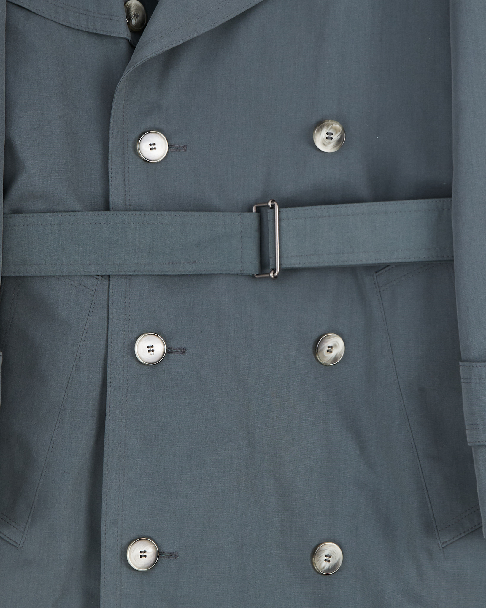 Плащ выполнен из плотной ткани с содержанием хлопка, съемная подкладка на молнии. Прямая посадка с поясом позволяет регулировать силуэт и подчёркивает линию талии. Двубортная застёжка, погоны и защитная кокетка.