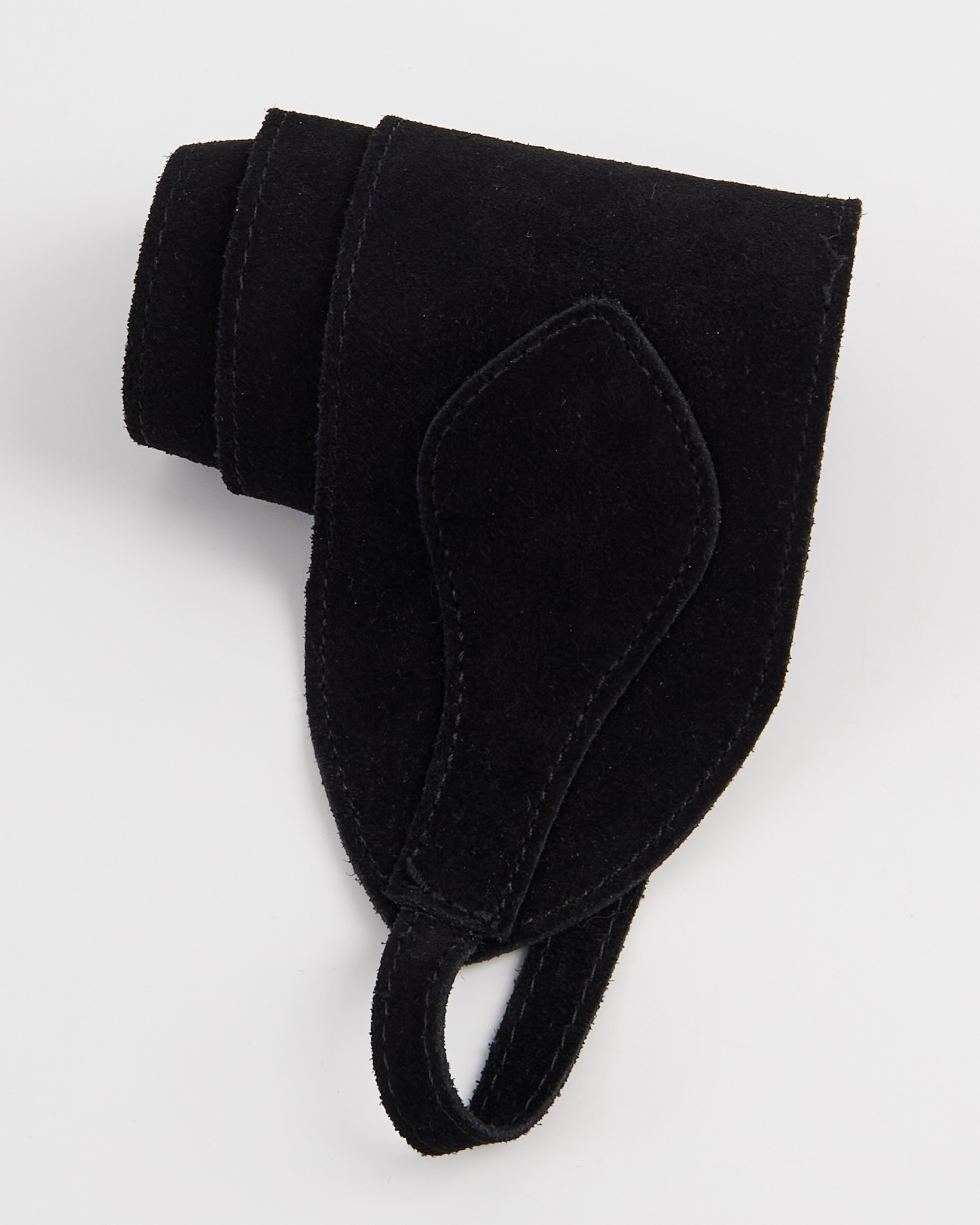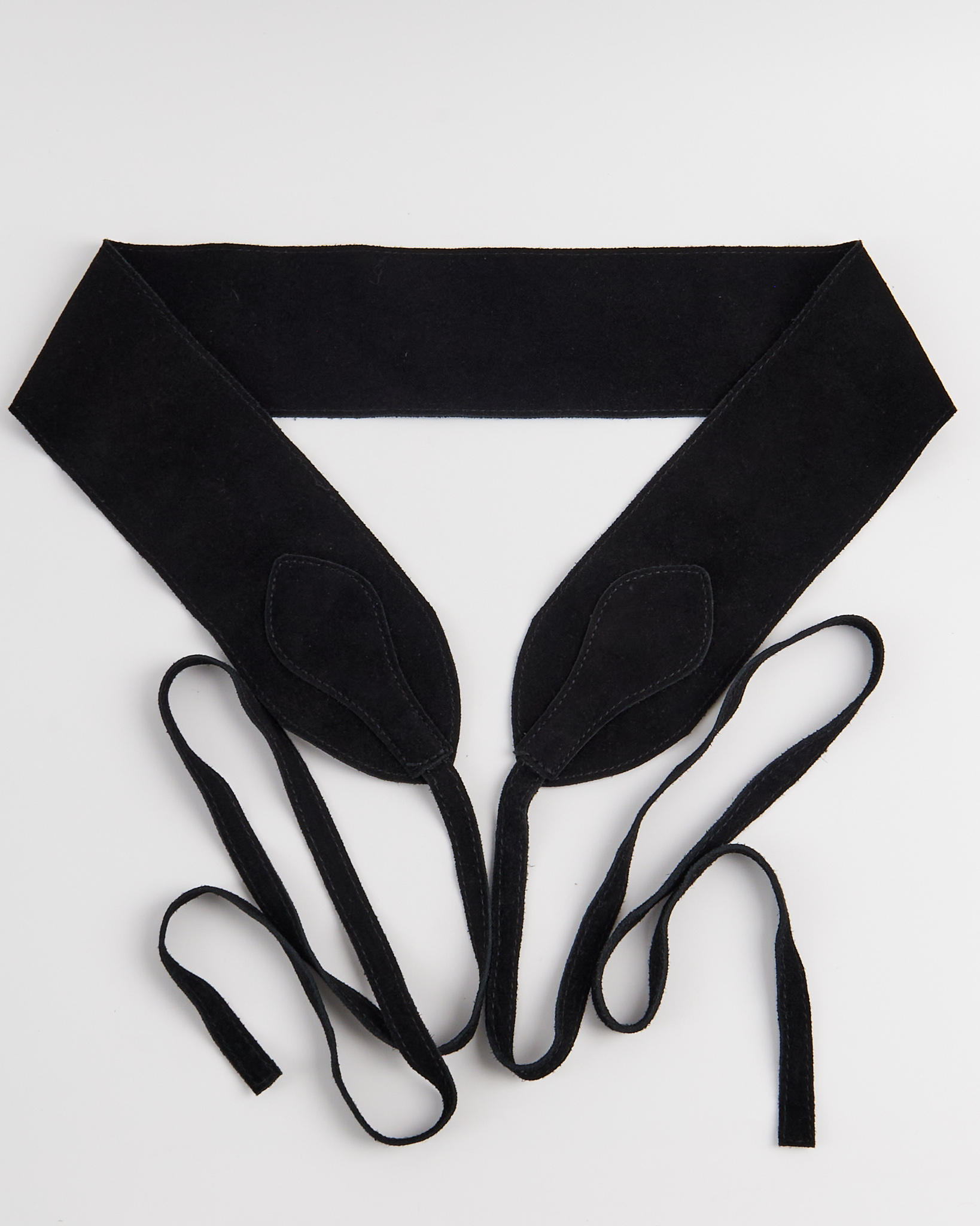 Пояс из мягкой натуральной замши глубокого чёрного оттенка. Аккуратная посадка на талии, длинные узкие завязки позволяют регулировать фиксацию и менять силуэт.