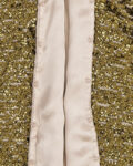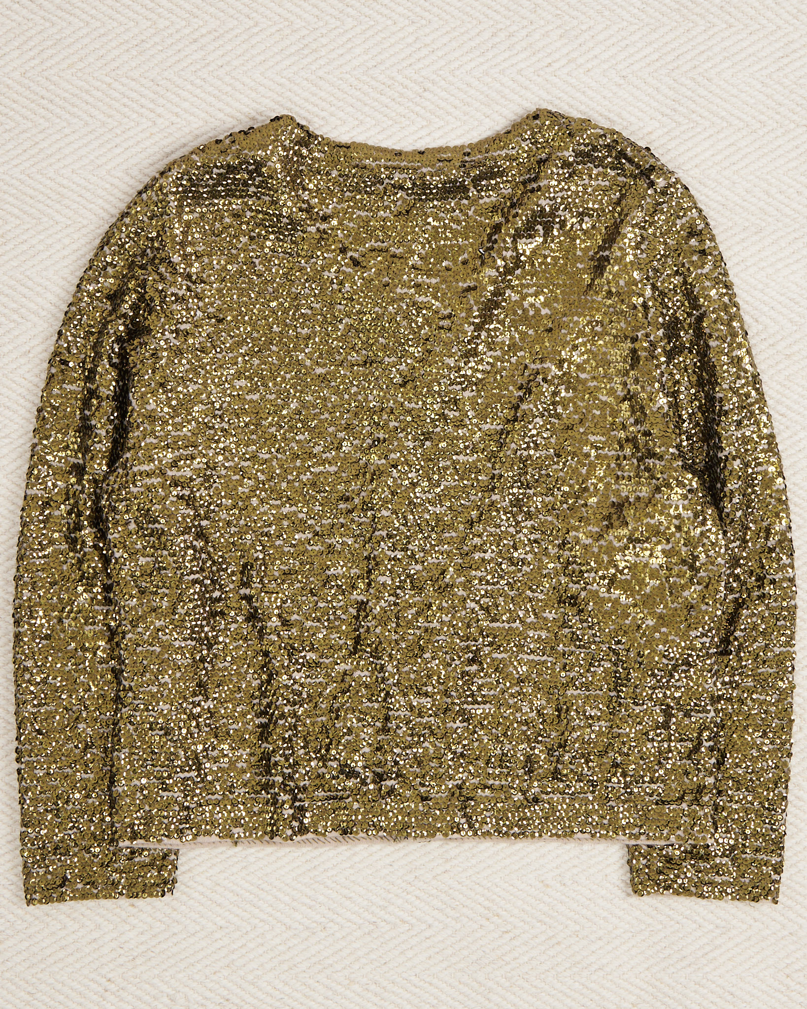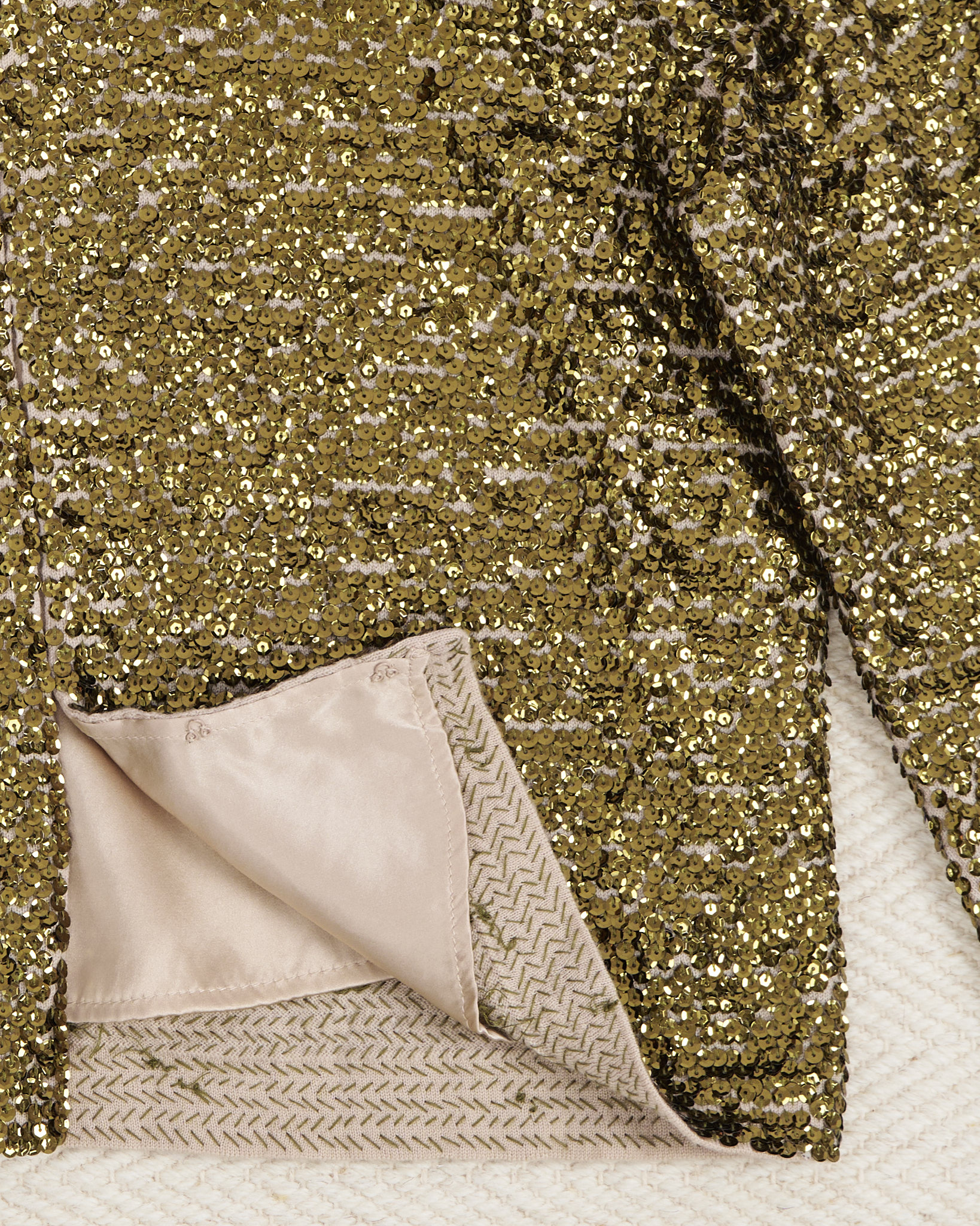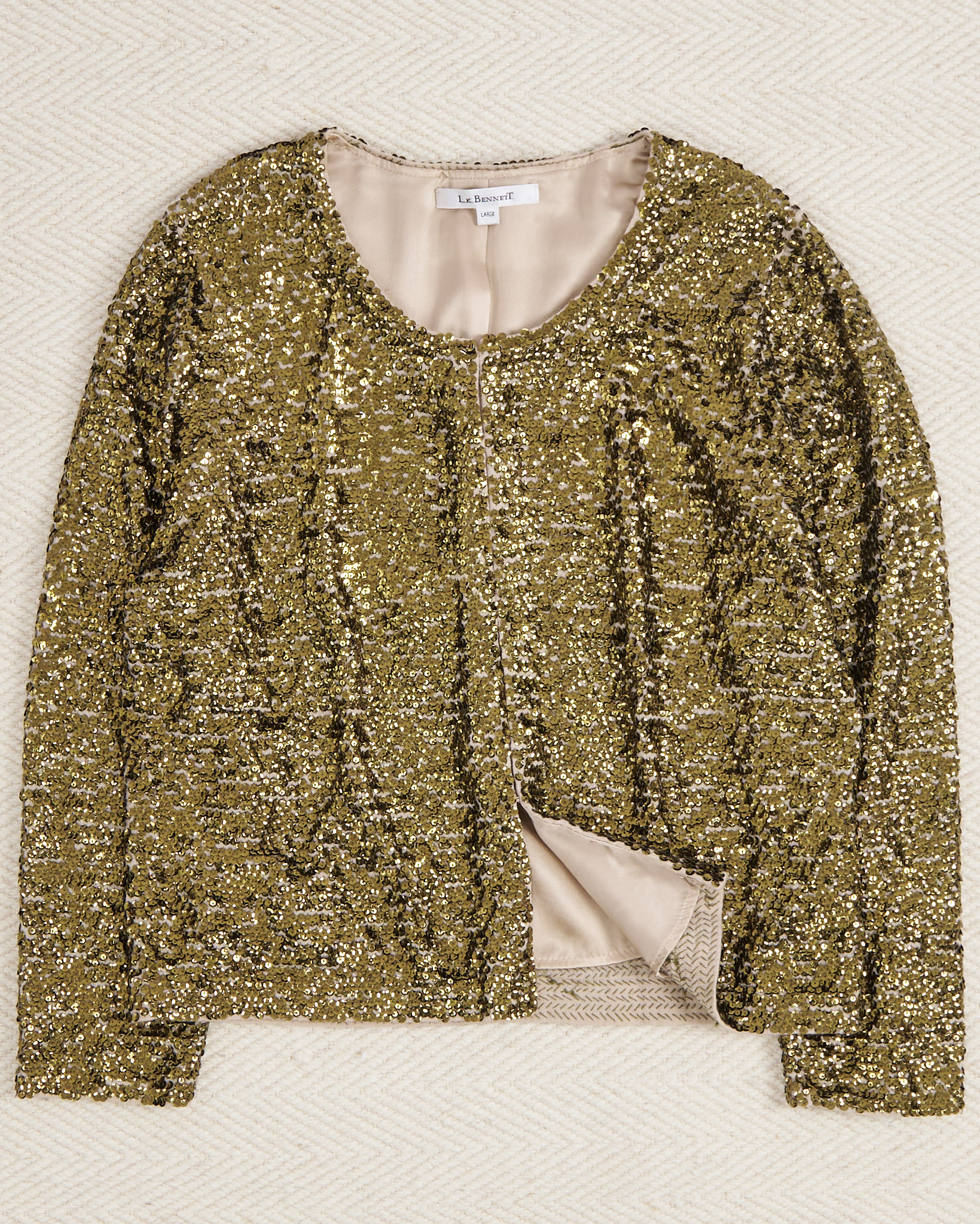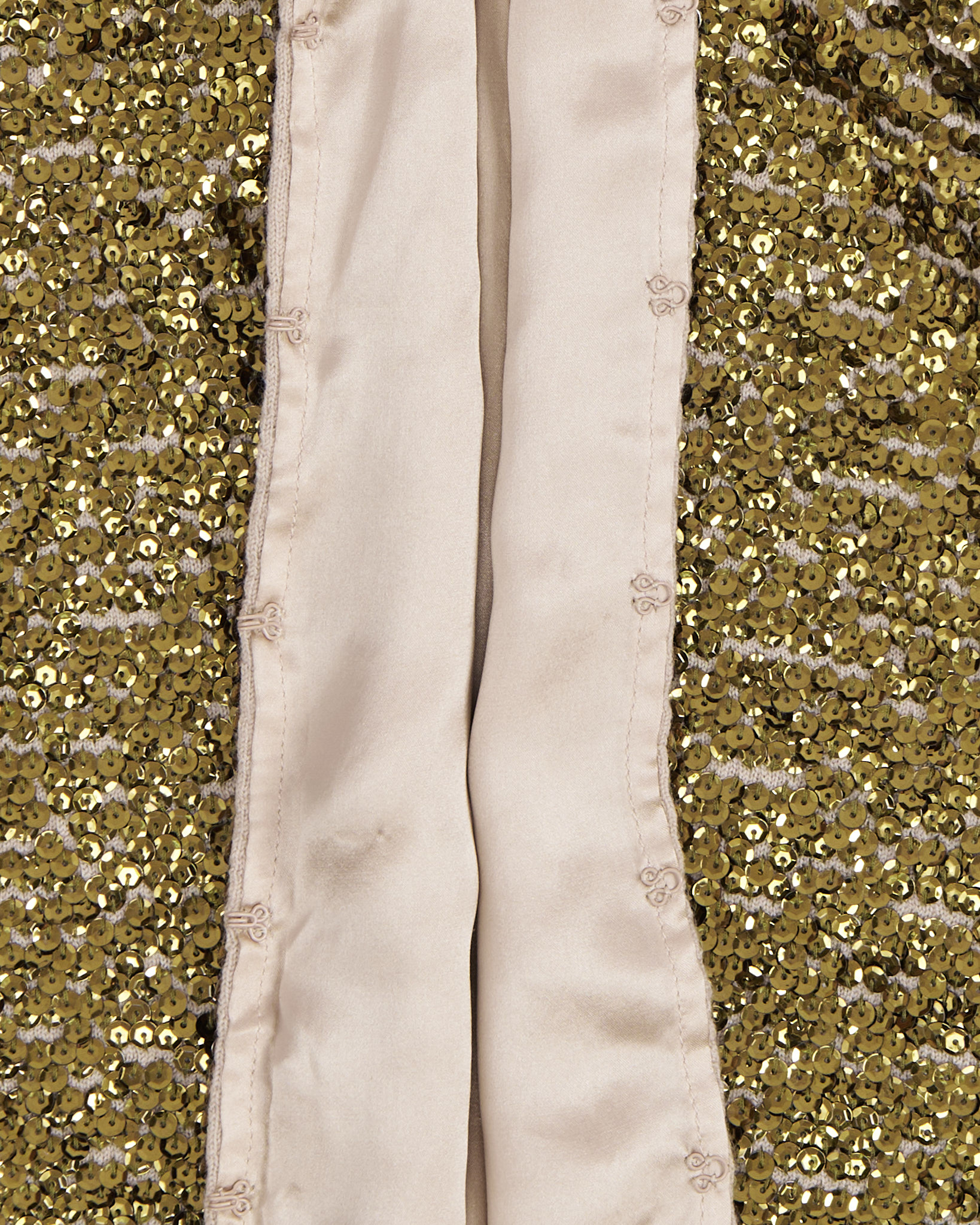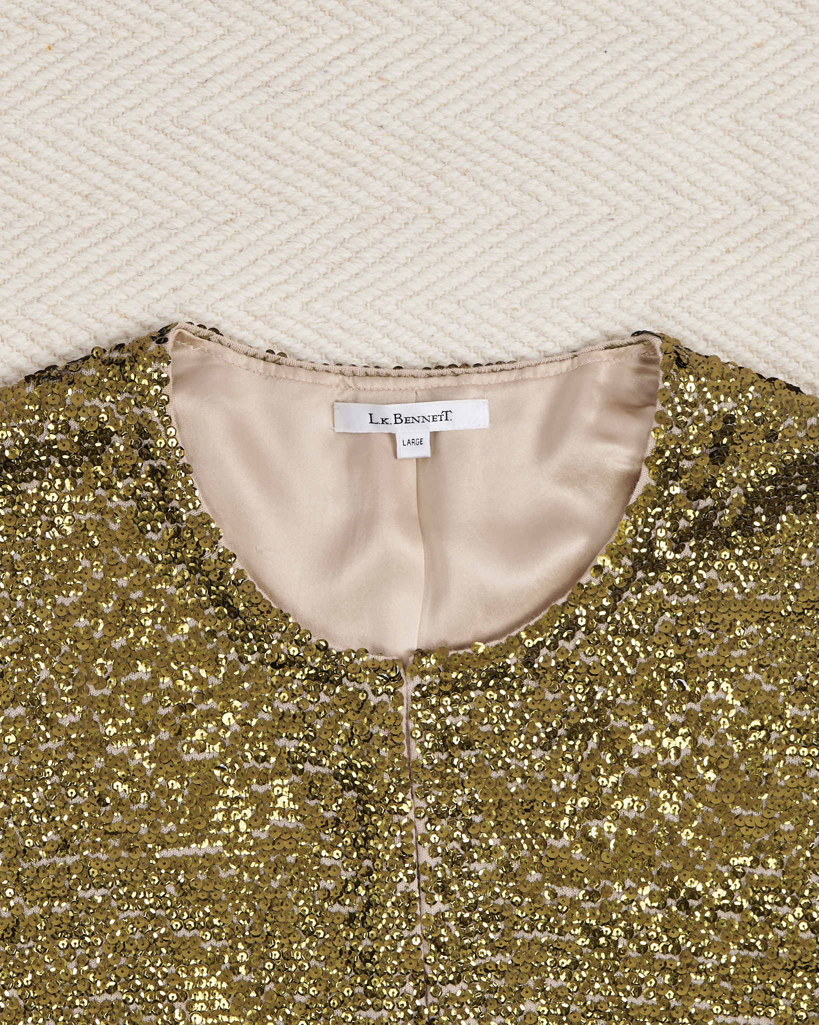 Золотой жакет L.K. Bennett с пайетками. Жакет выполнен из ткани, полностью расшитой золотыми пайетками, с подкладкой из 100% шелка. Посадка свободная, удобная застёжка на крючки.