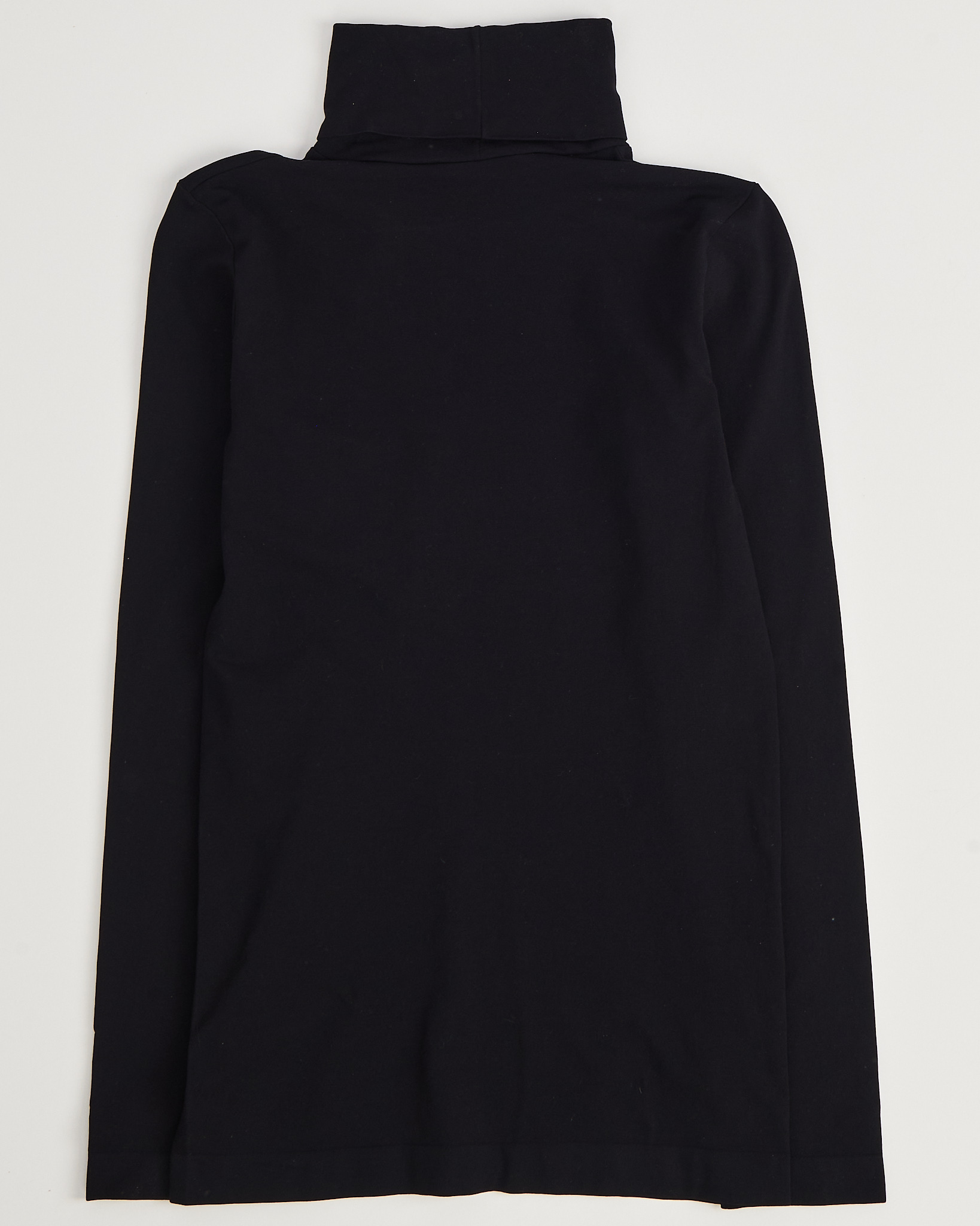 Водолазка глубокого черного цвета. Прямой силуэт и высоким воротом, который держит форму. Минималистичная деталь в виде металлического логотипа у низа