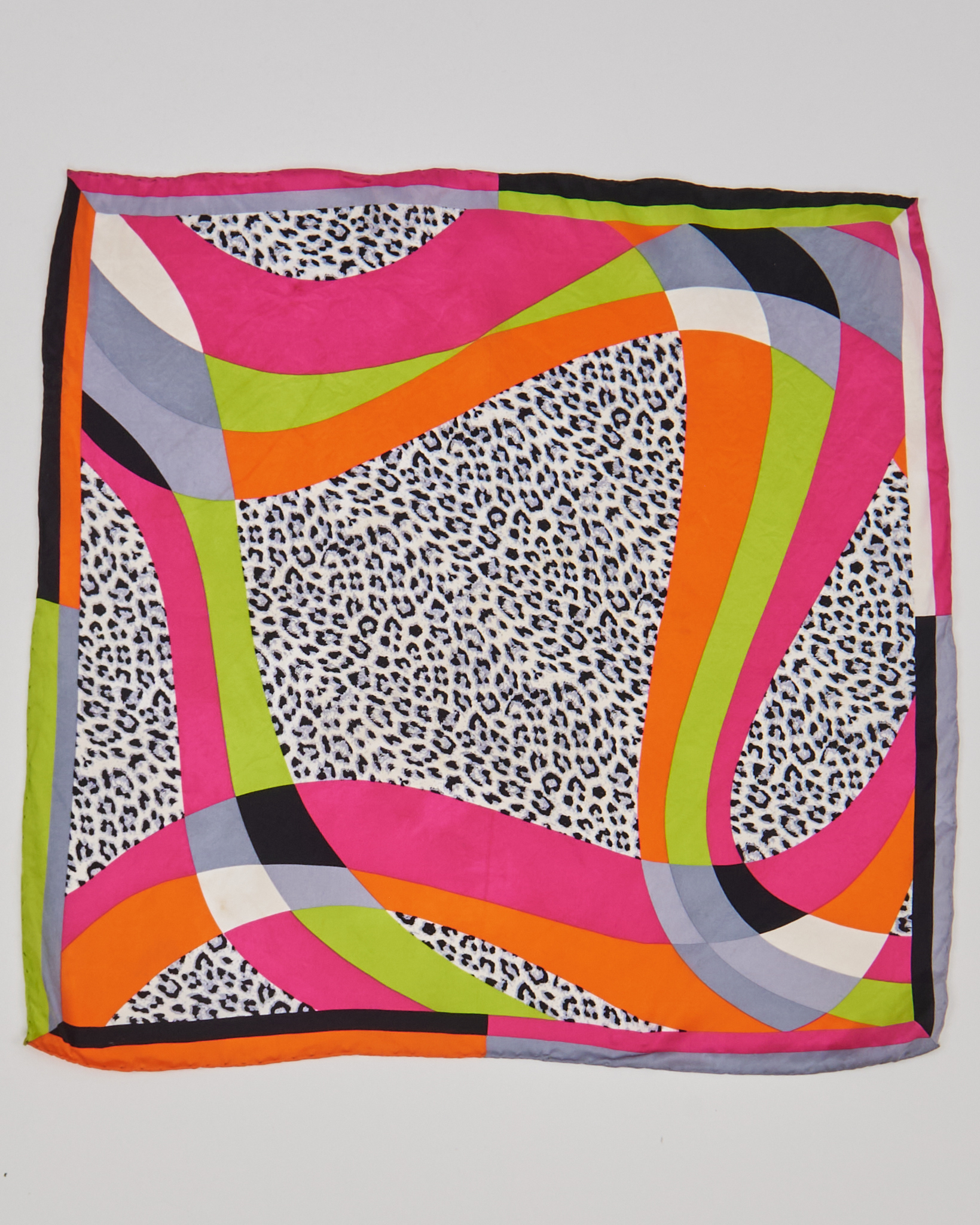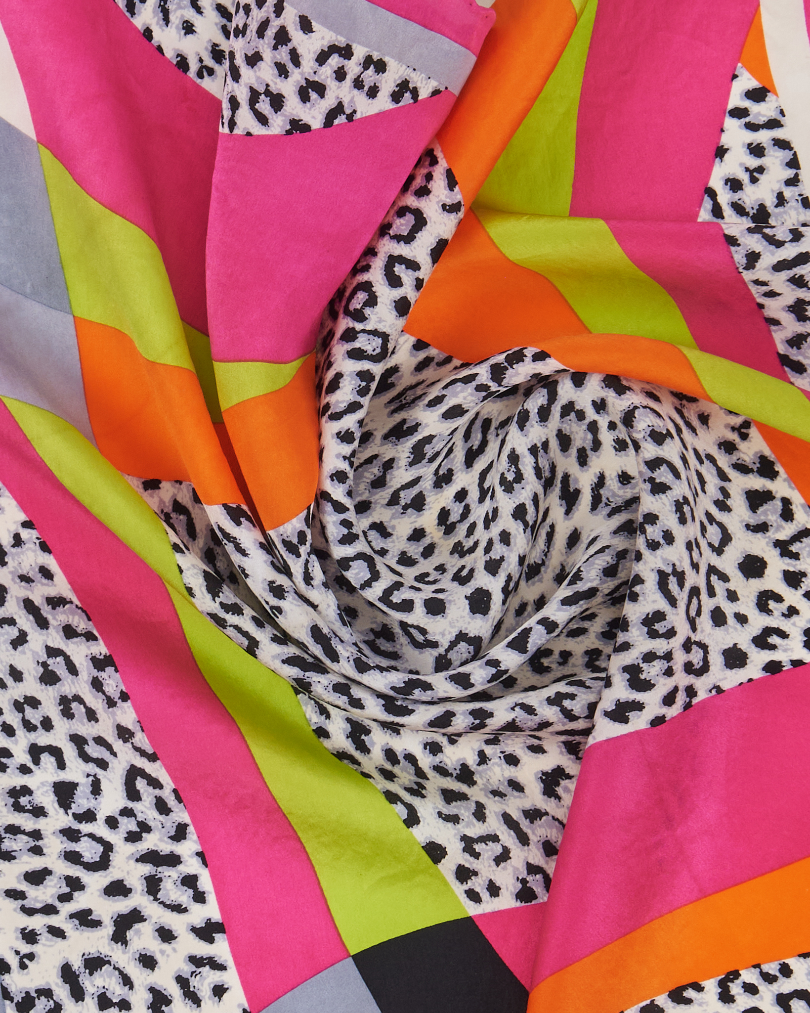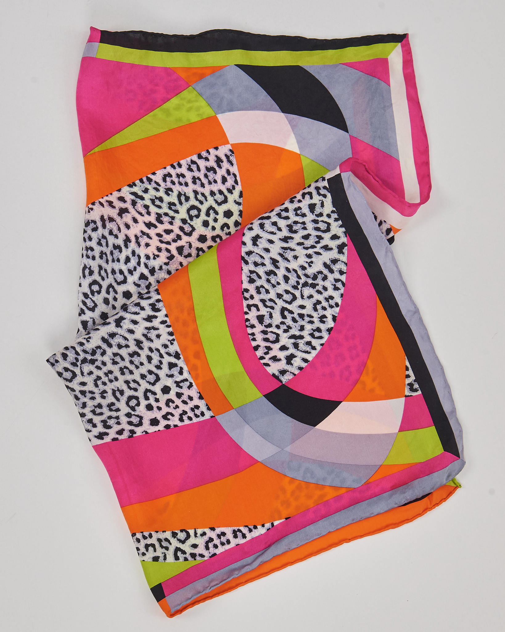 Яркий шелковый платок в стиле Frey Wille, ретро-дизайн с элементами абстракции. Гармоничное сочетание: леопардовый принт в центре, яркие волнообразные линии в насыщенных оттенках (розовый, оранжевый, салатовый), контрастные полосы серого, чёрного и белого цветов, чёткая окантовка.