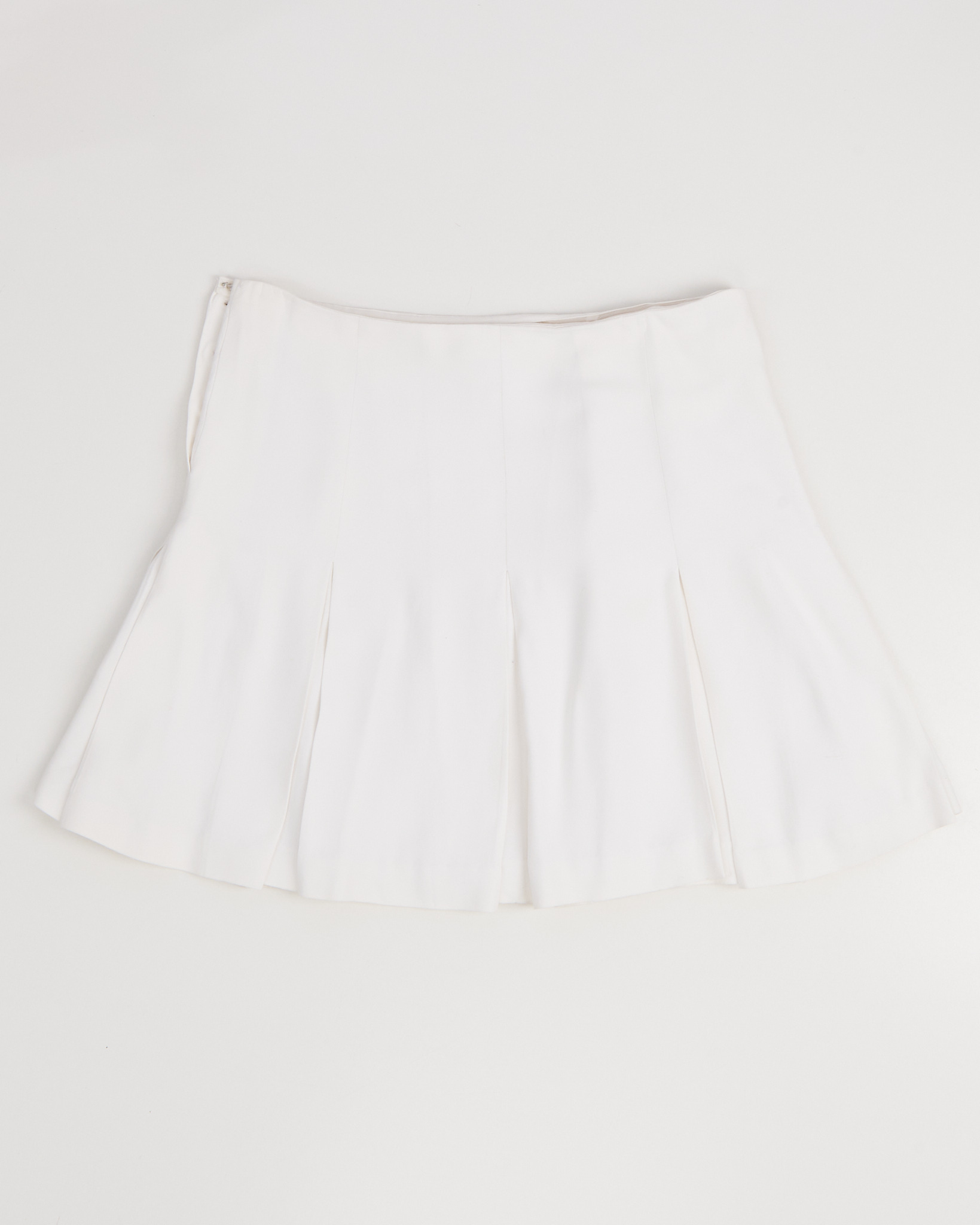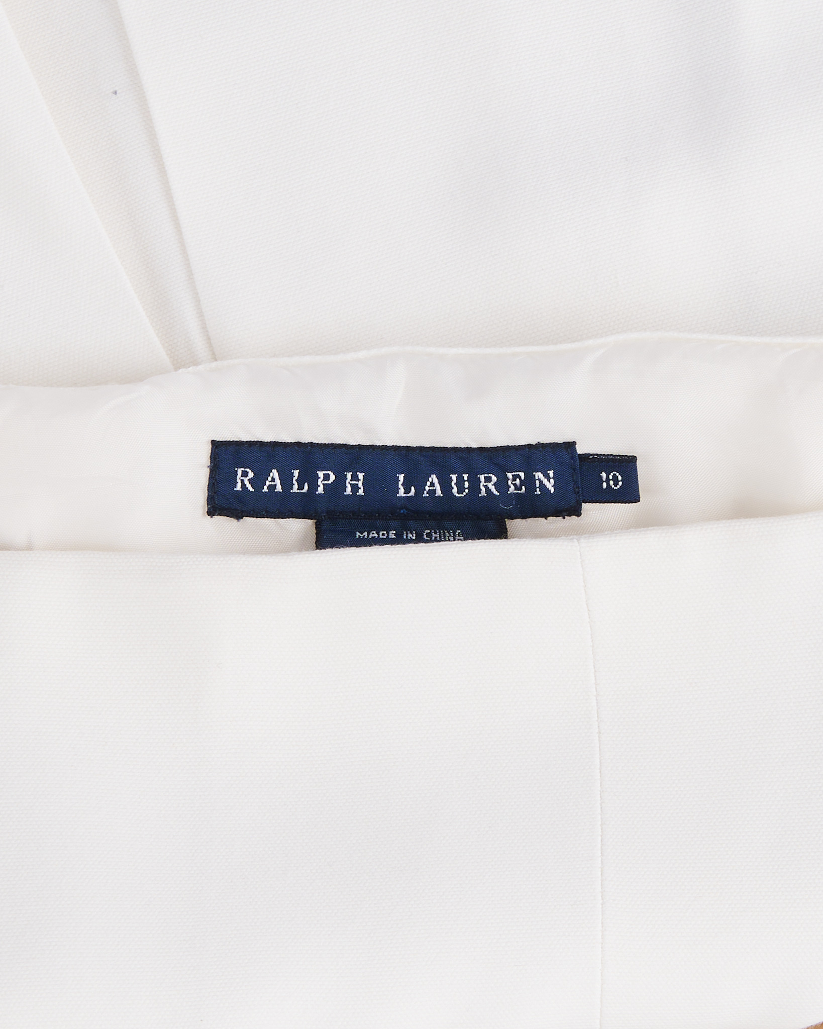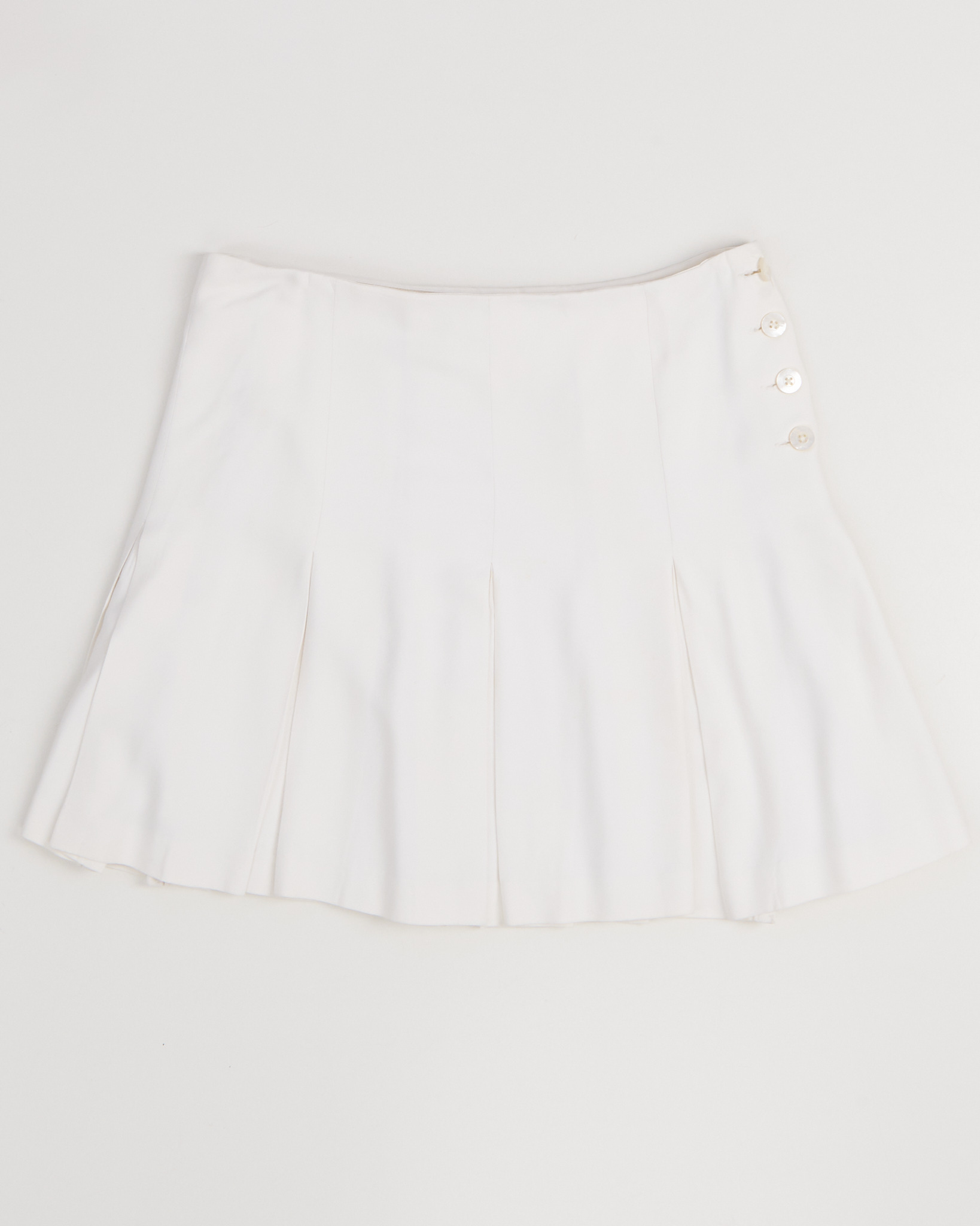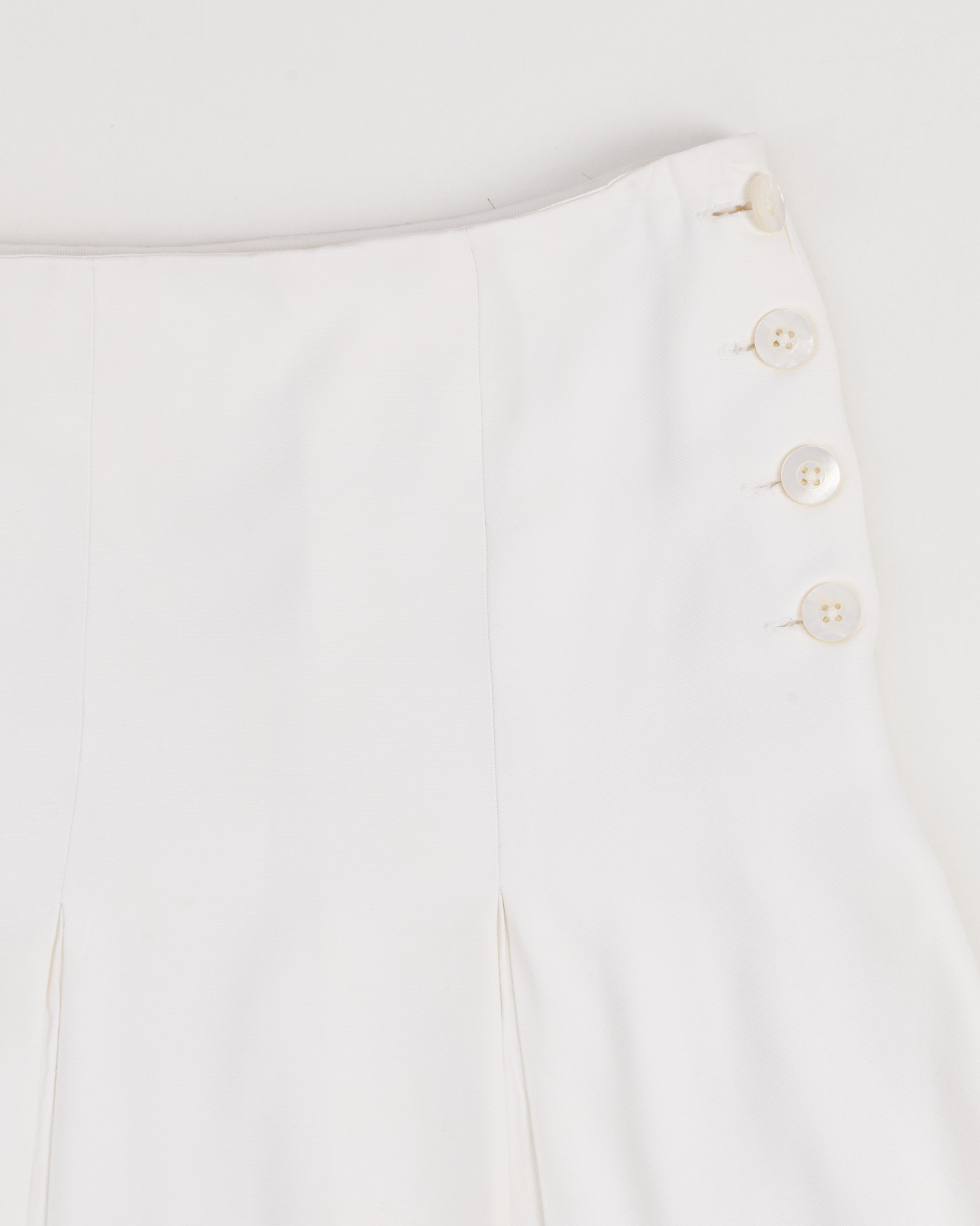 Юбка Ralph Lauren белого цвета. Посадка по талии. Форма расклешивается к низу. Спереди вертикальные швы и мягкие складки. Сбоку расположена линия пуговиц с фактурной отделкой.