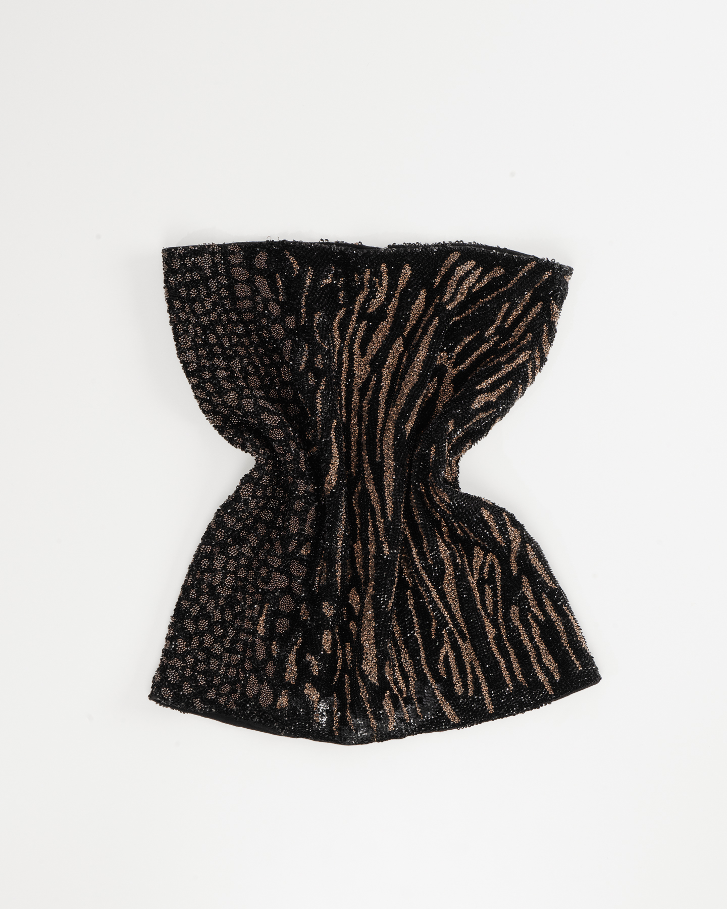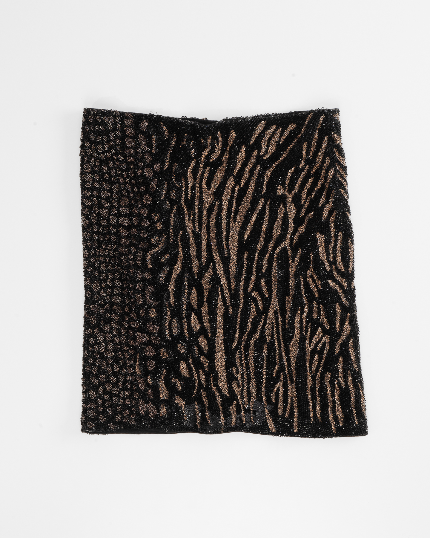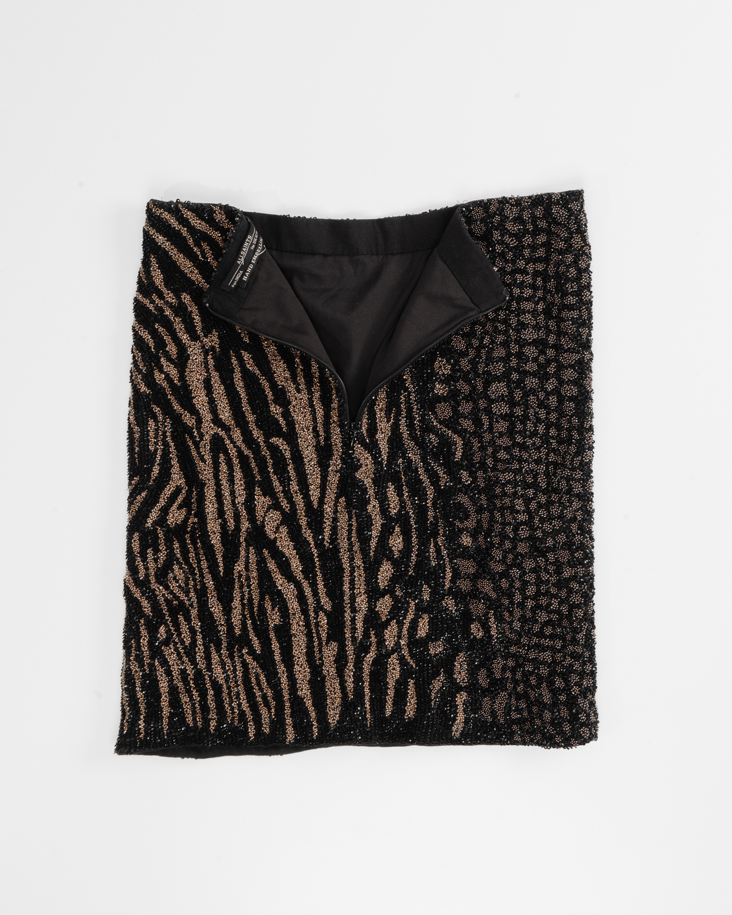 - Поверхность украшена полностью ручной вышивкой мелким бисером в графичном узоре, напоминающем анималистичный мотив с эффектом мерцания.
