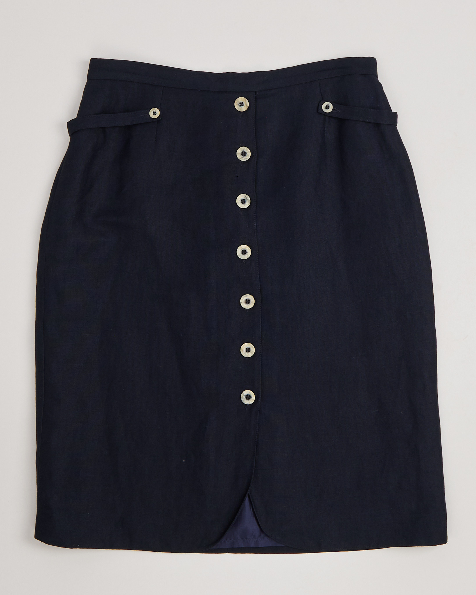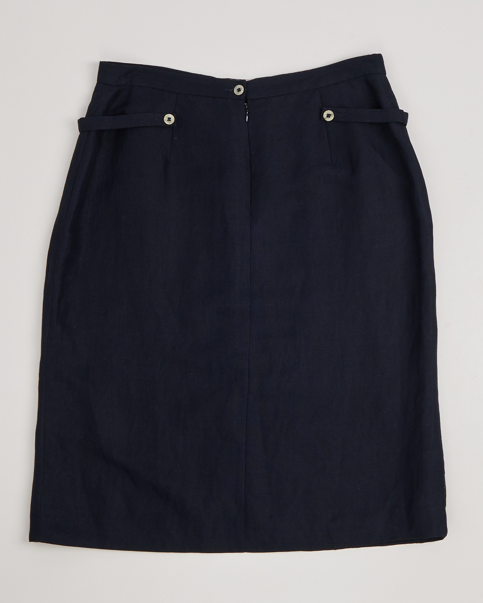 Юбка темно-синего цвета. Декоративный ряд пуговиц, ремешки по бокам.