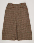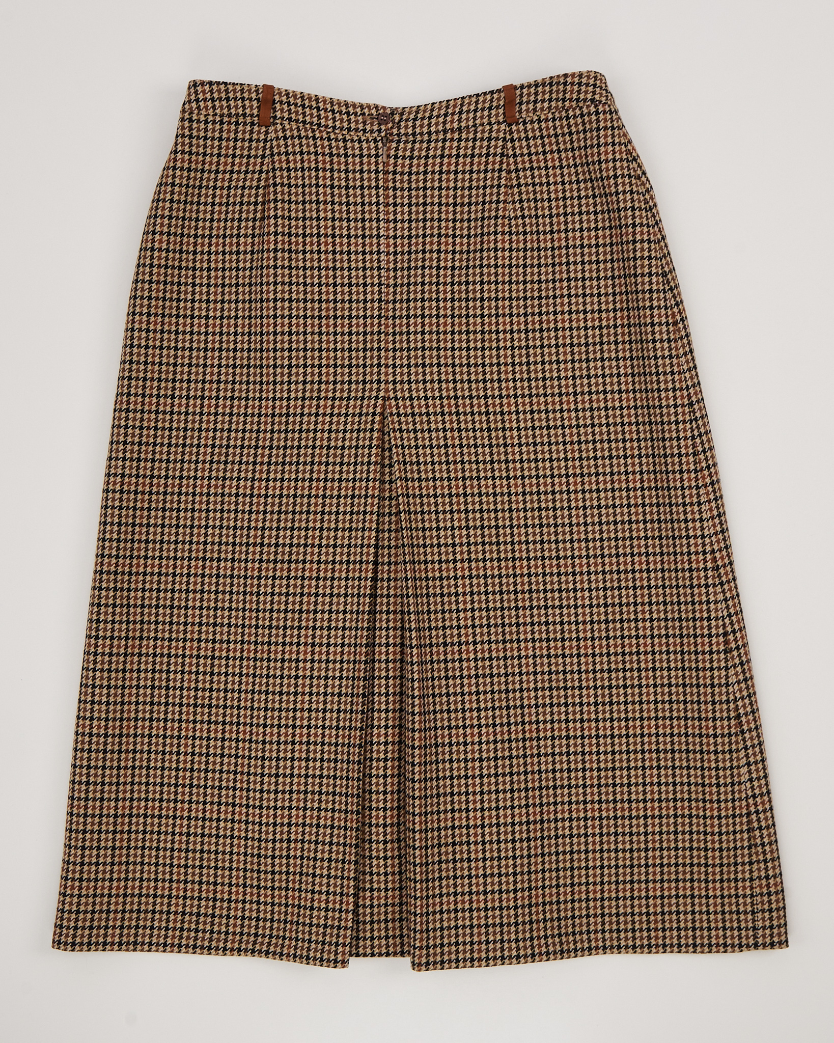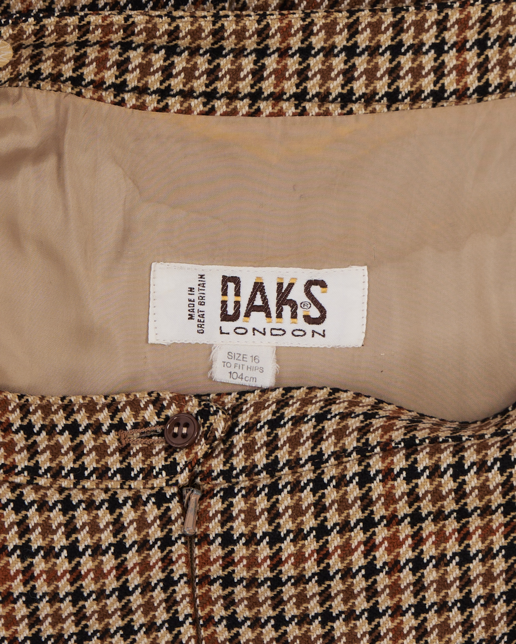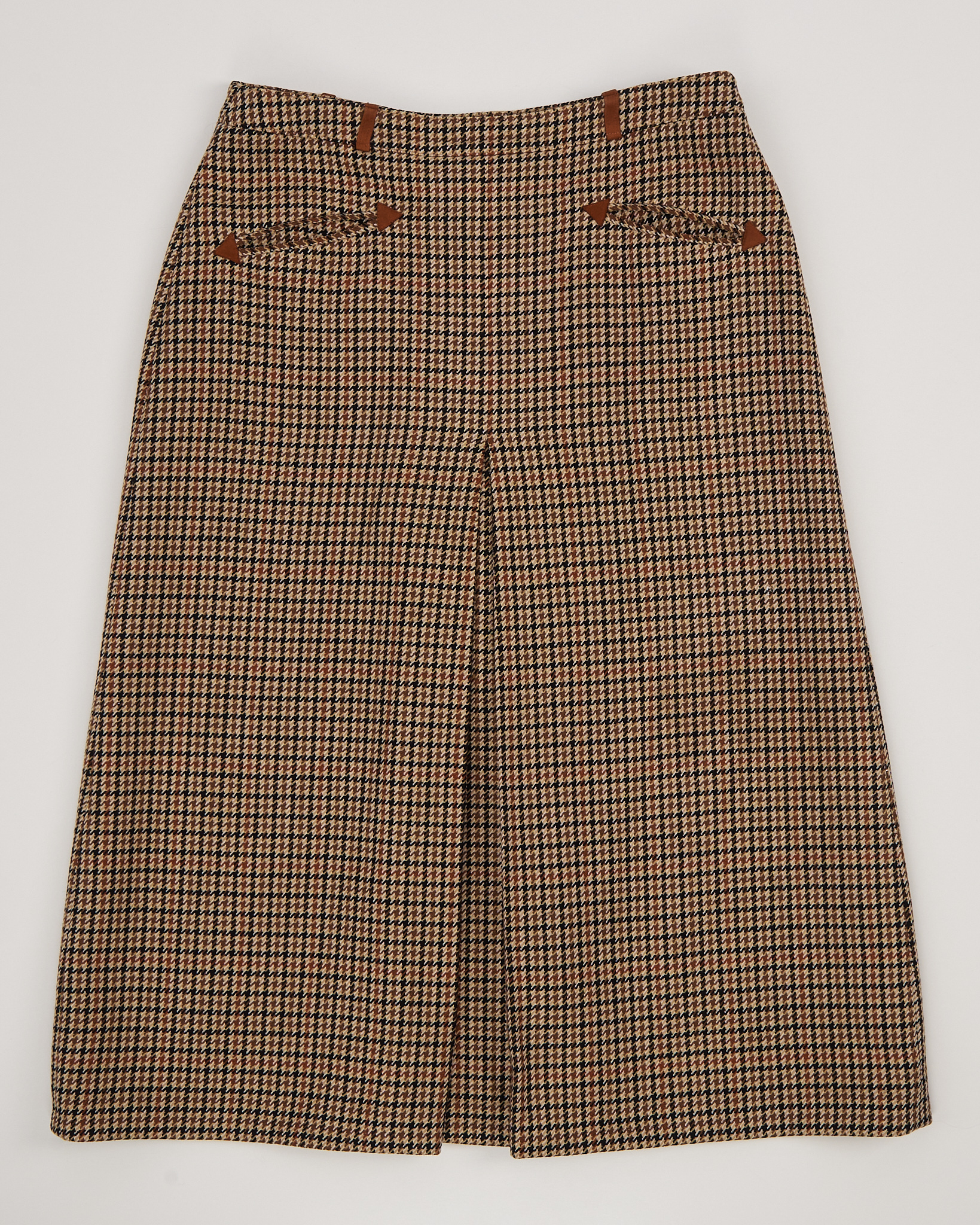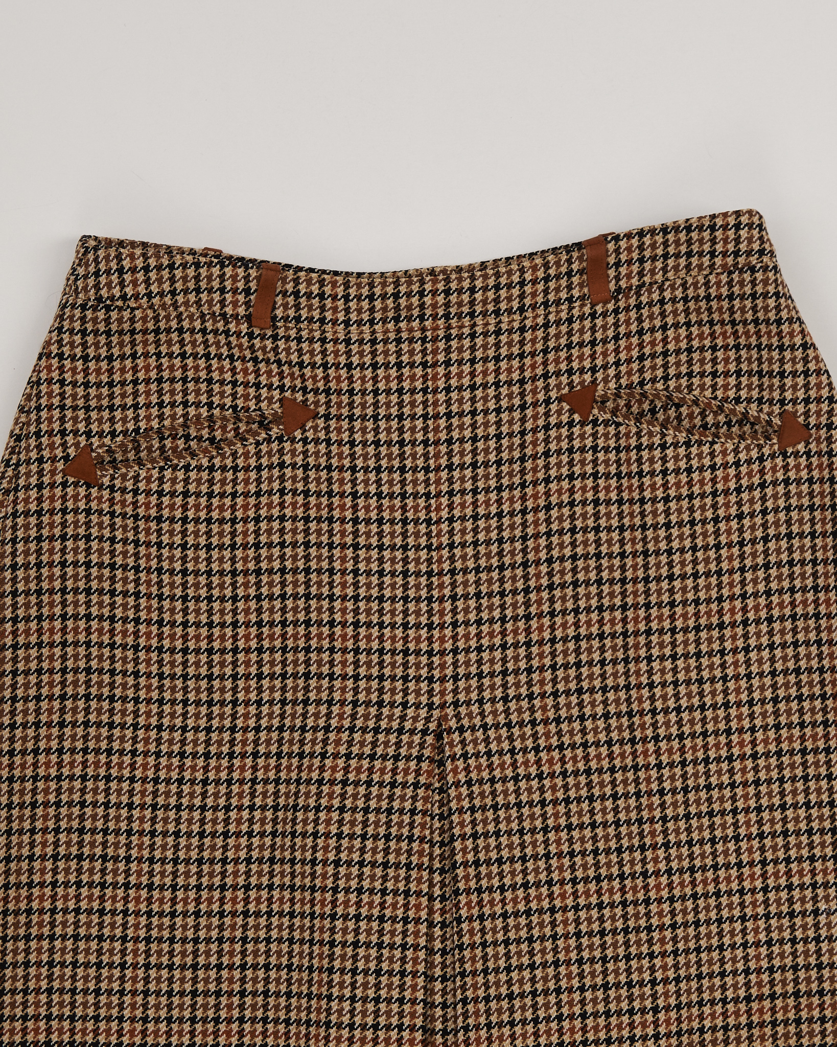 Юбка Daks London из 100% шерсти с рисунком «гусиная лапка» в тёплой коричневой гамме. Посадка высокая, пояс с шлёвками и декоративные элементы у карманов.