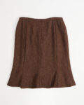 Юбка выполнена из плотной шерсти в глубоких коричневых оттенках. Посадка аккуратная по линии талии, силуэт мягко расширяется к низу и создает ровное, спокойное движение при ходьбе. Конструктивные швы формируют чистую линию и подчеркивают архитектуру кроя.
