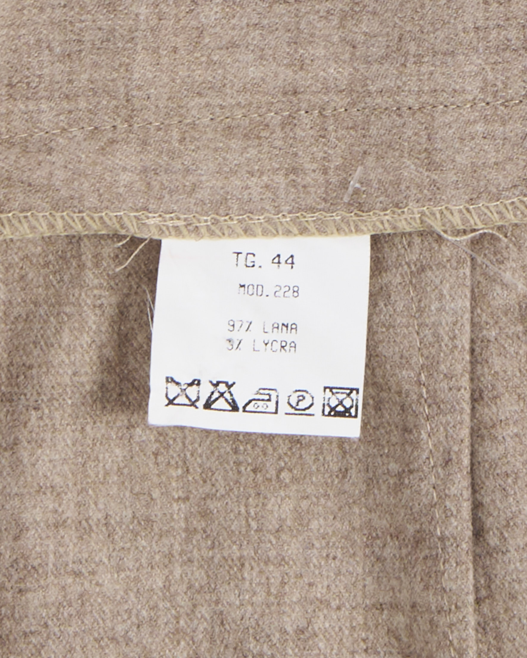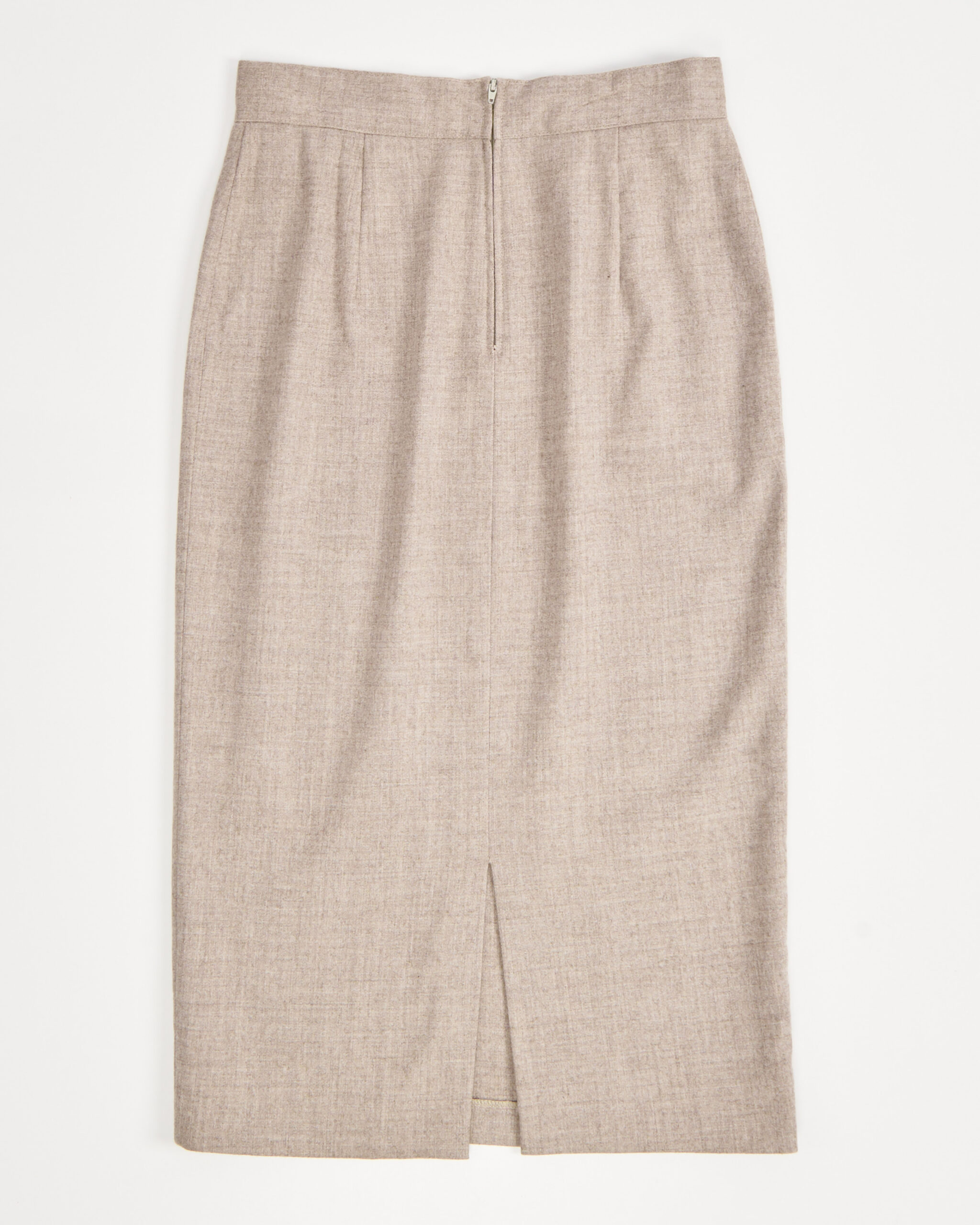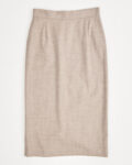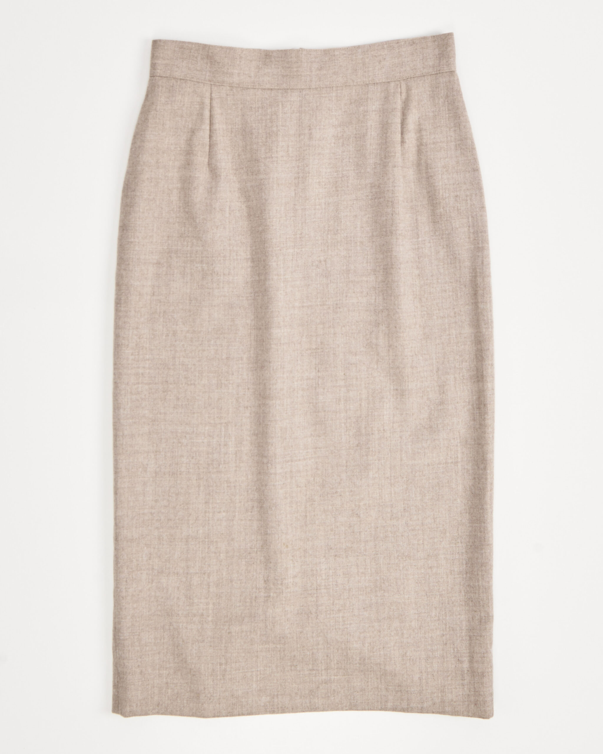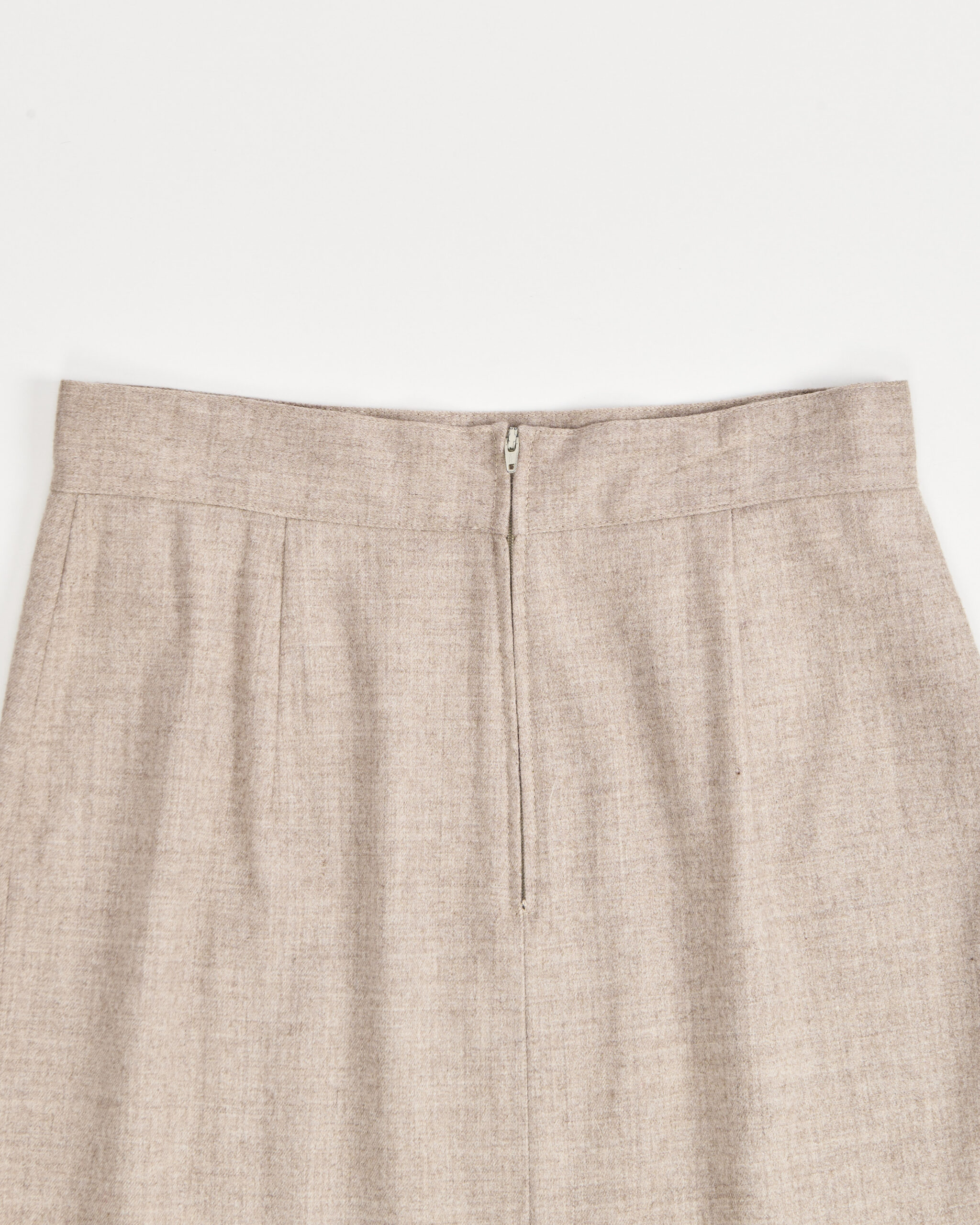 Выполнена из плотной шерсти светло-песочного оттенка. Посадка высокая, подчёркивает талию и плавно переходит в прямой силуэт, визуально вытягивая фигуру.Материал приятный на ощупь, умеренно тёплый, чуть эластичный.