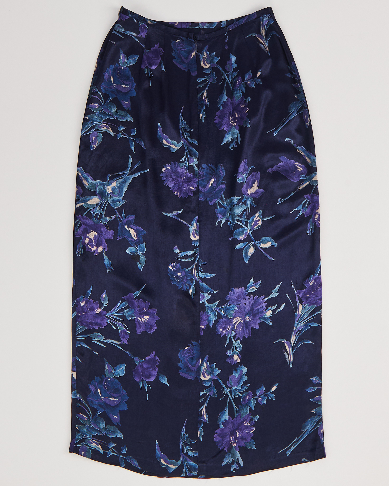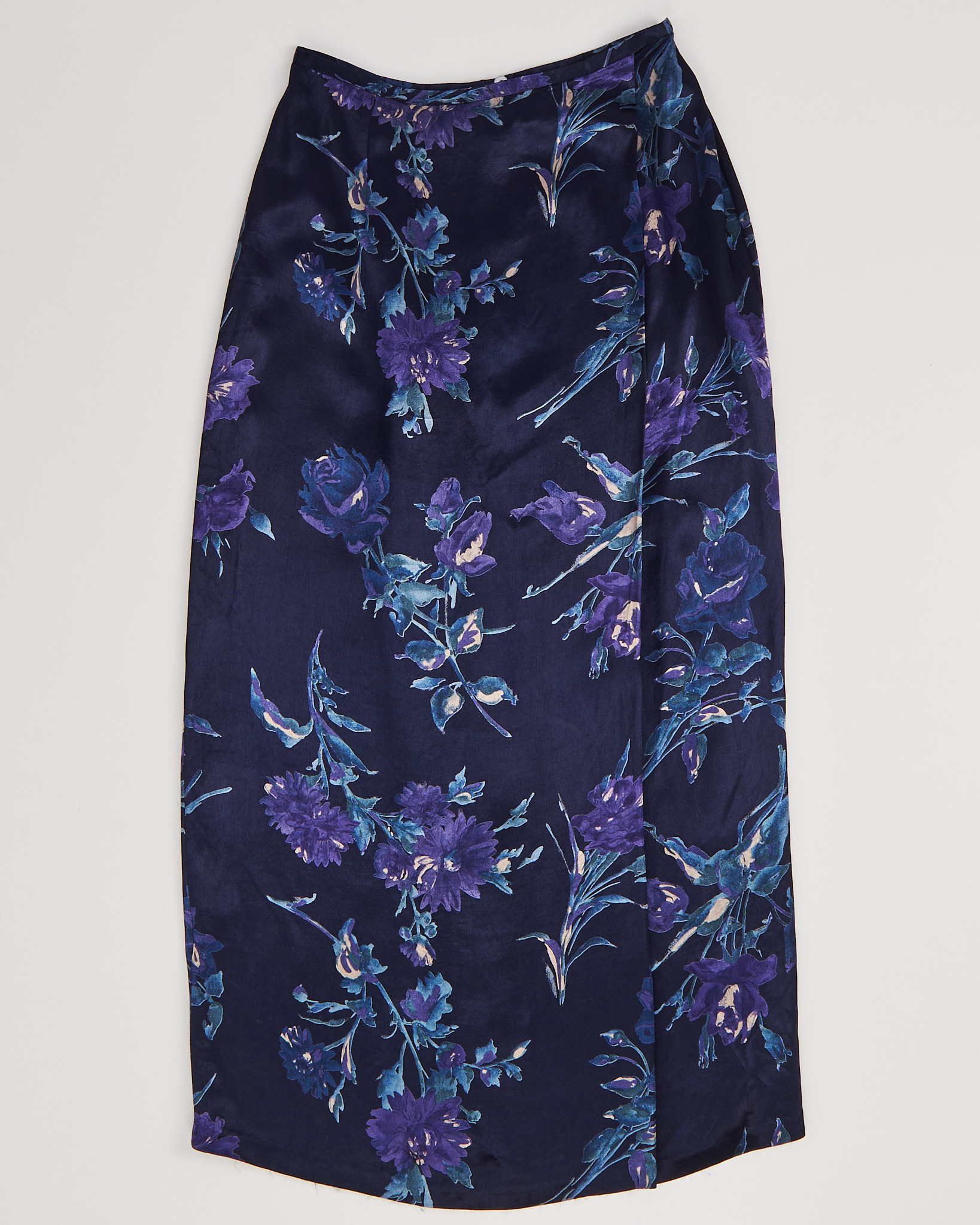 Юбка из мягкой шелковистой вискозной ткани. Прямой силуэт, длина макси, удобная застежка на пуговицу и молнию. Глубокий синий цвет и акцентный цветочный принт, ткань красиво переливается на свету.