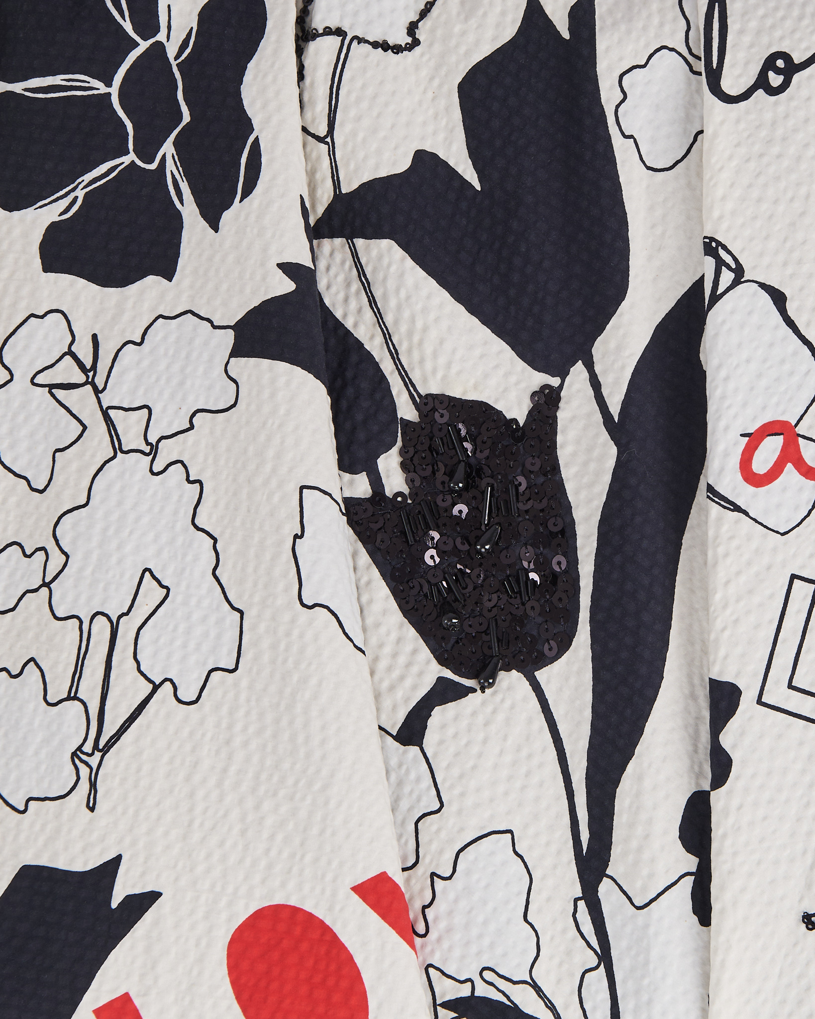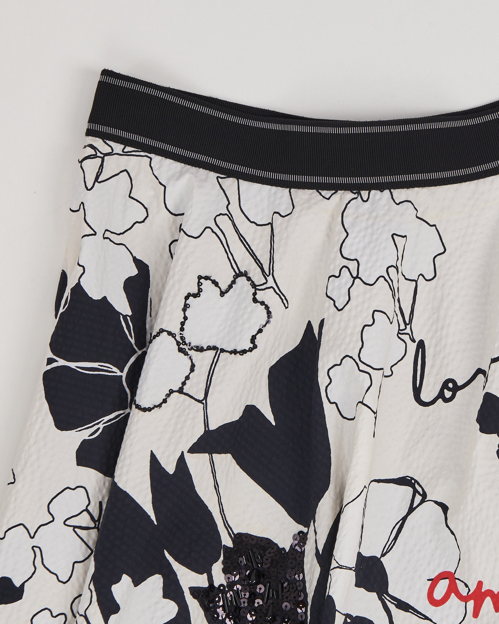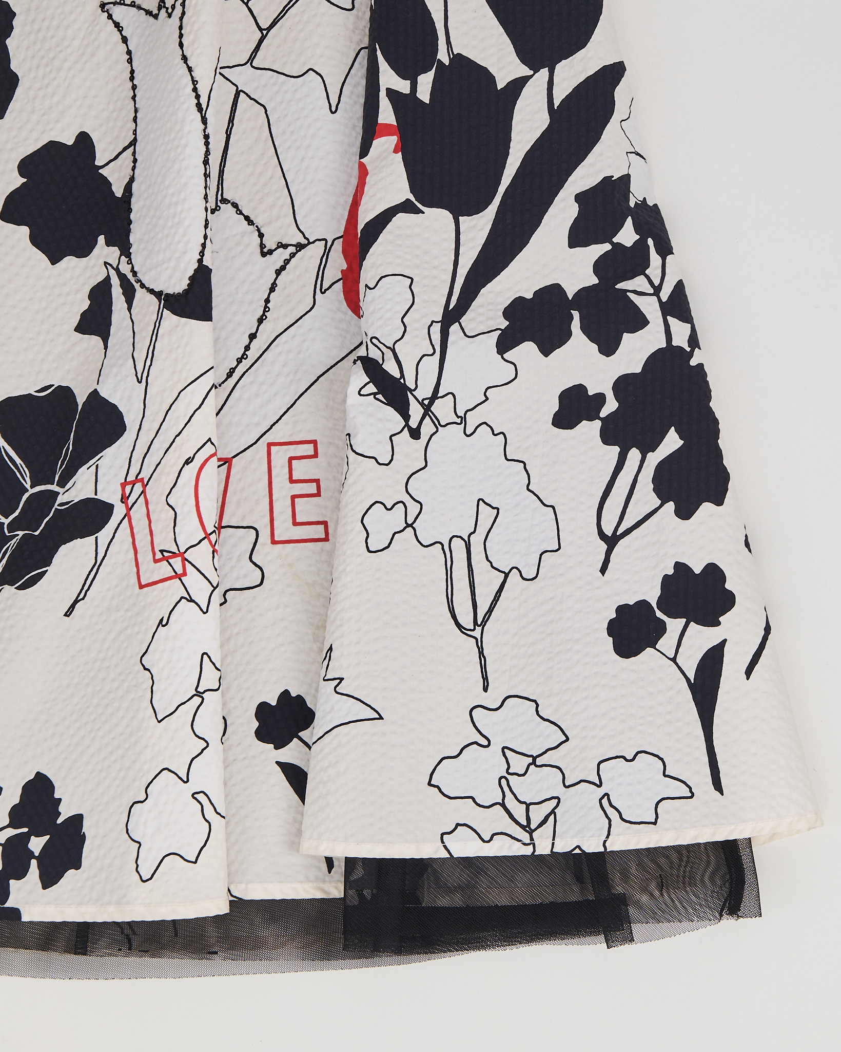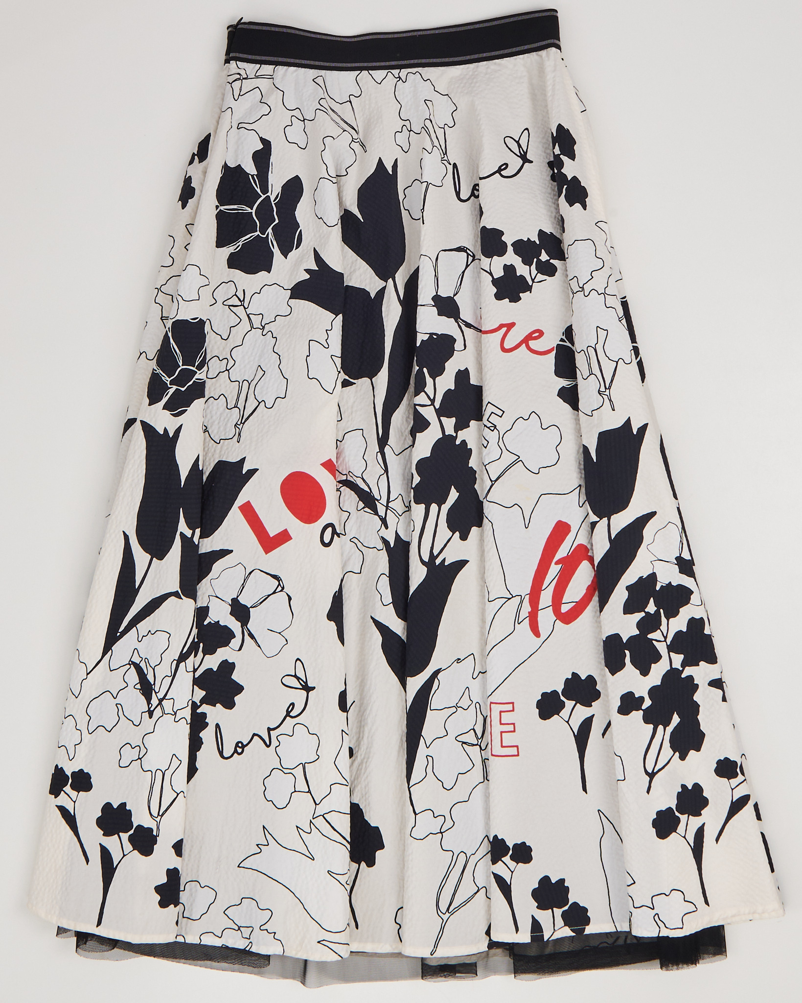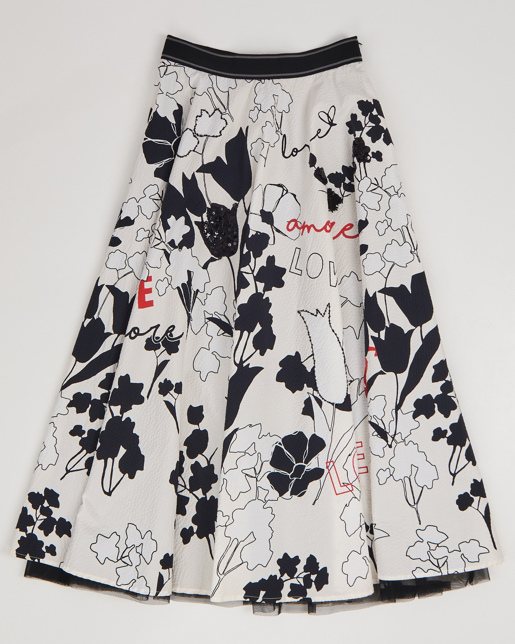Юбка-миди из 100% хлопка. Высокая посадка, свободный крой. Черно-белый цветочный принт с графичными линиями, контрастными красными надписями Love. Декоративный элемент из бисера и пайеток. Сатиновый удлиненный подъюбник.