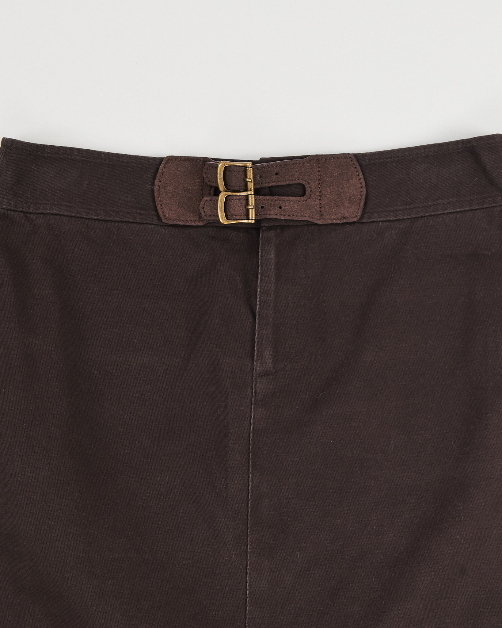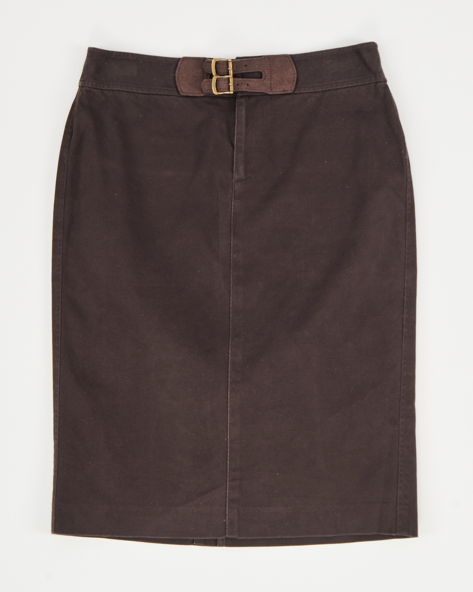 Юбка из хлопка с добавлением эластана от Ralph Lauren. Посадка высокая, чётко фиксируется по талии за счёт пояса с двойной пряжкой. Прямой силуэт, удобная застежка на молнии.