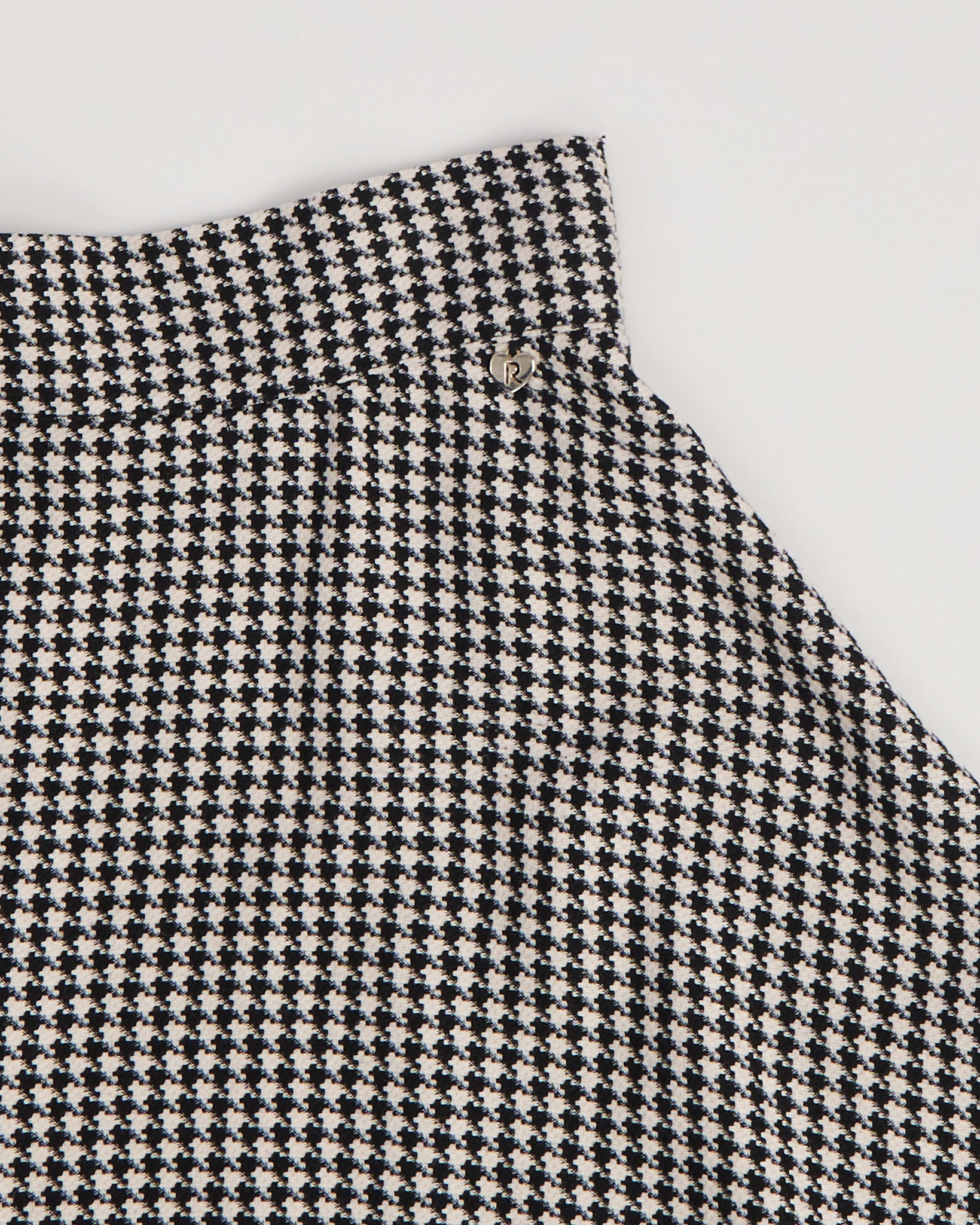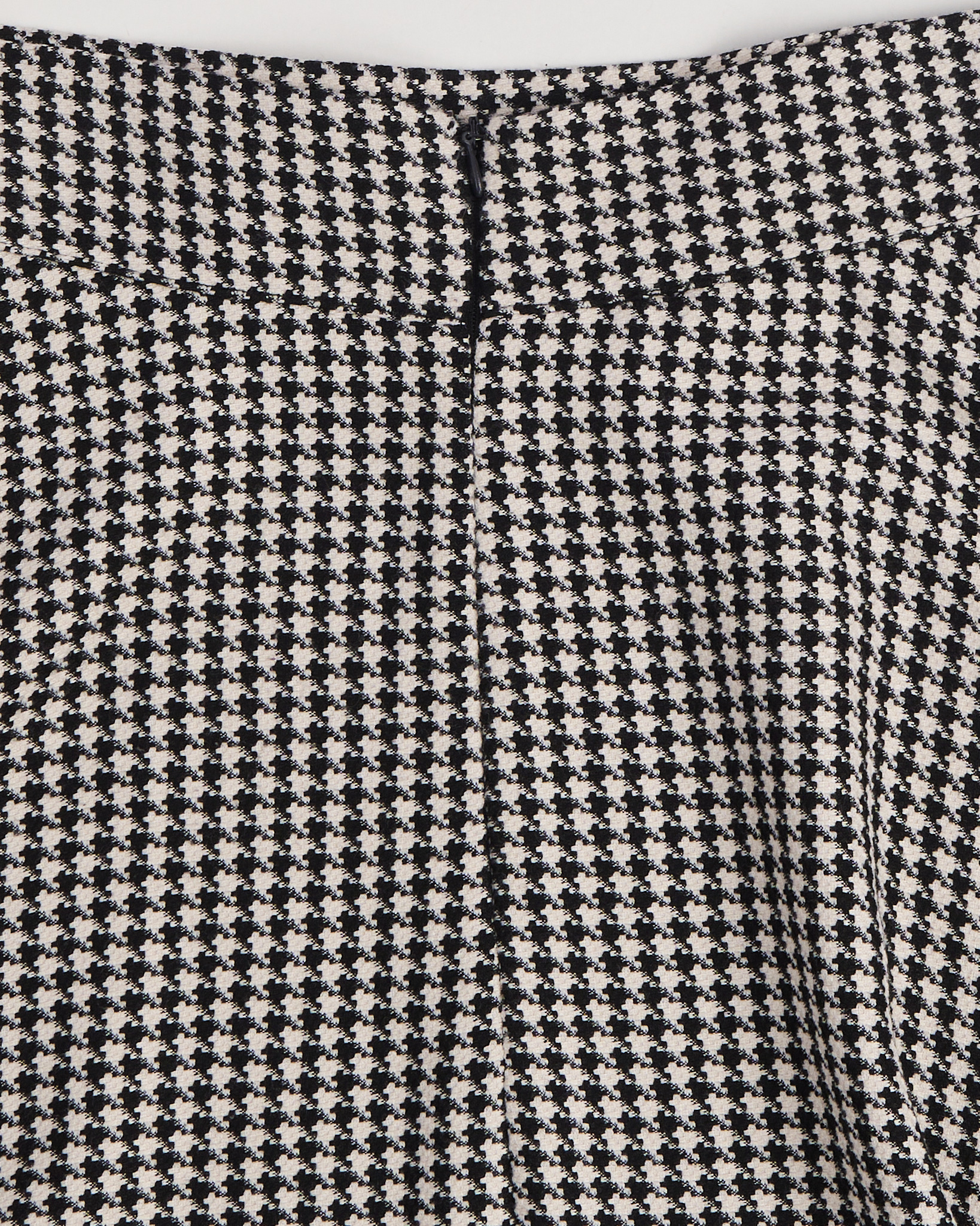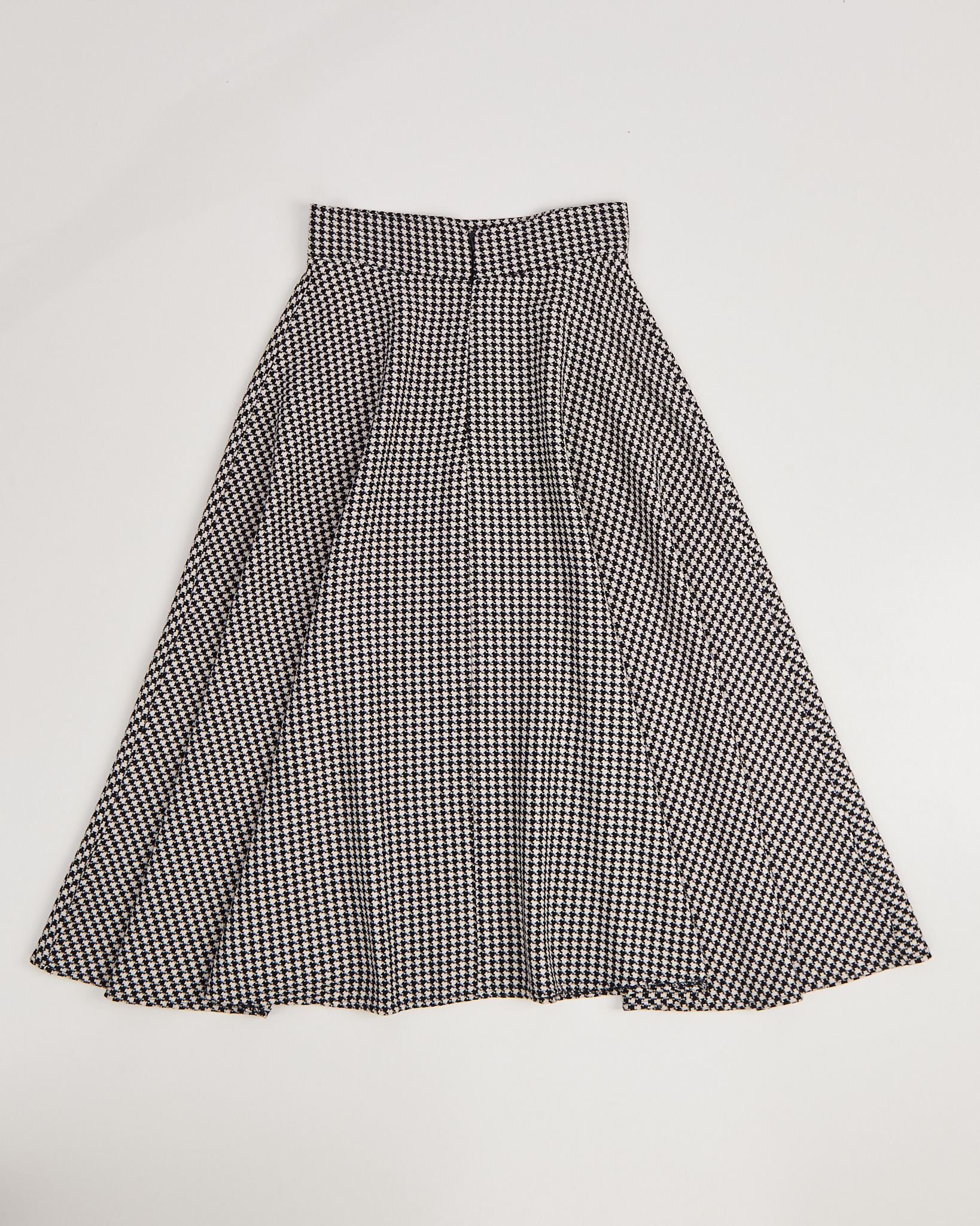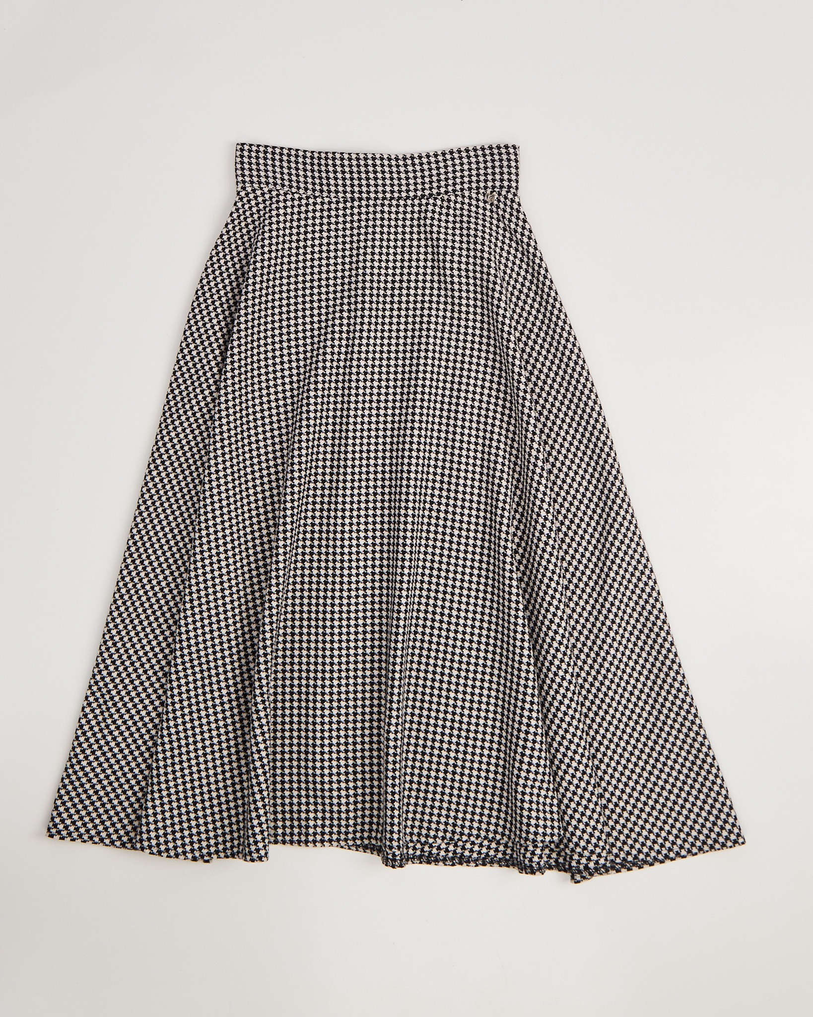 Юбка из плотной фактурной ткани в черно-белом узоре гусиная лапка. Посадка высокая, линия талии четкая, силуэт расклешённый. Сзади — потайная молния, юбка красиво раскрывается в движении. На поясе — небольшой металлический знак с логотипом.