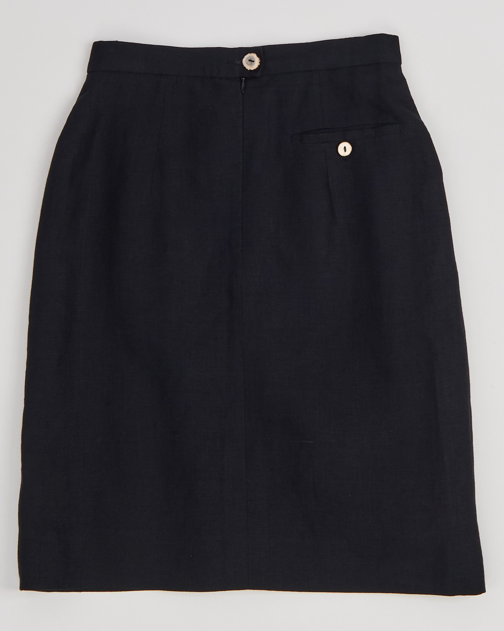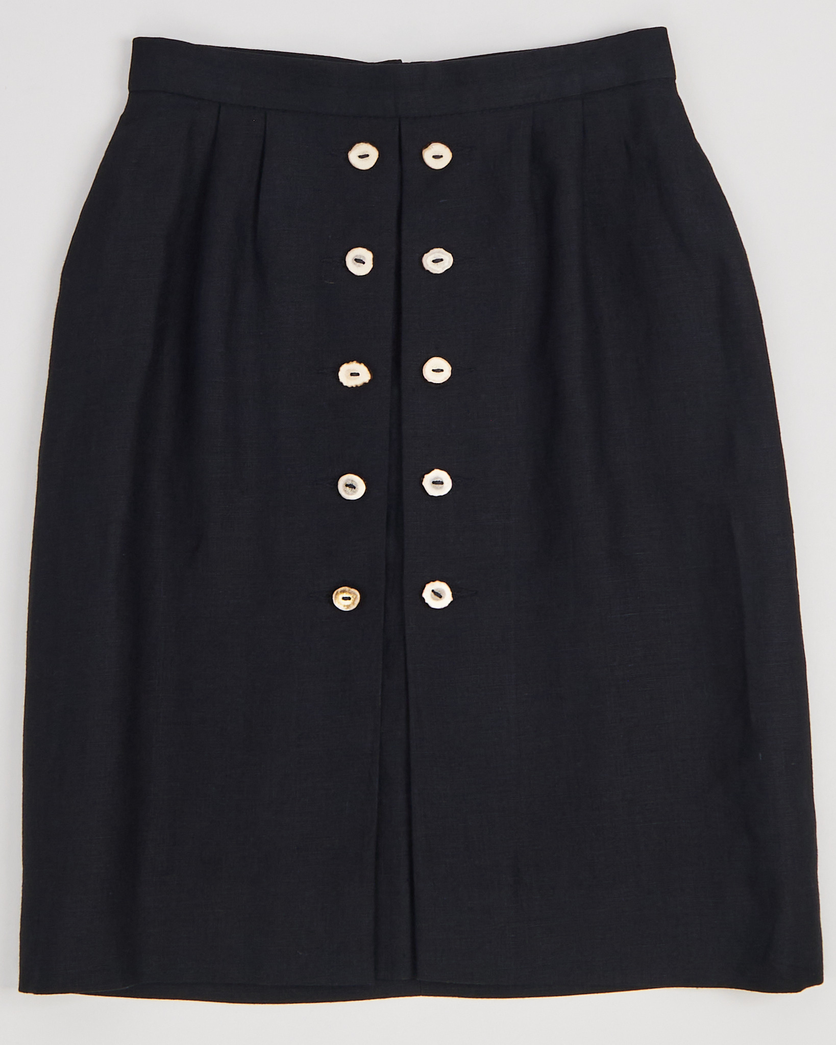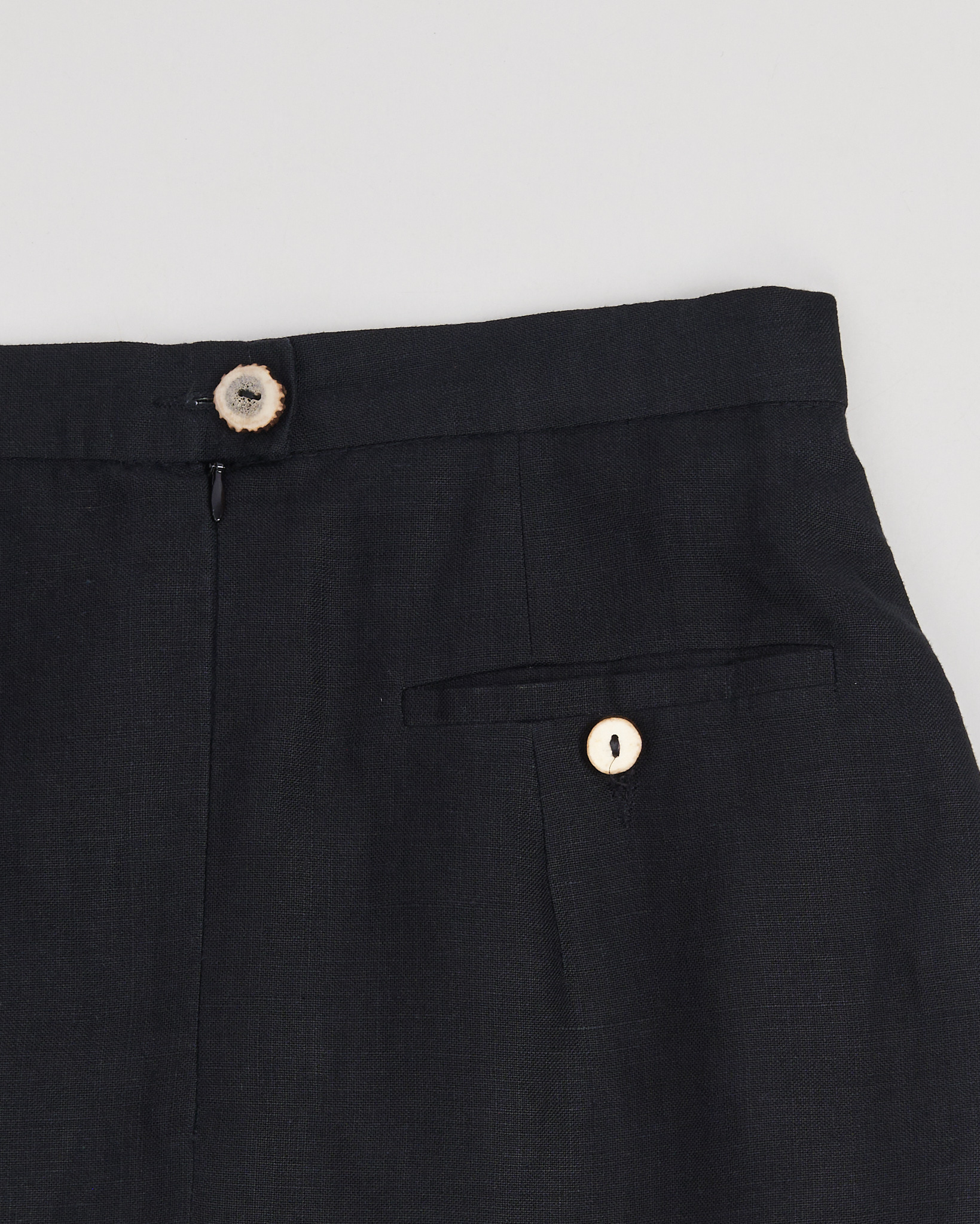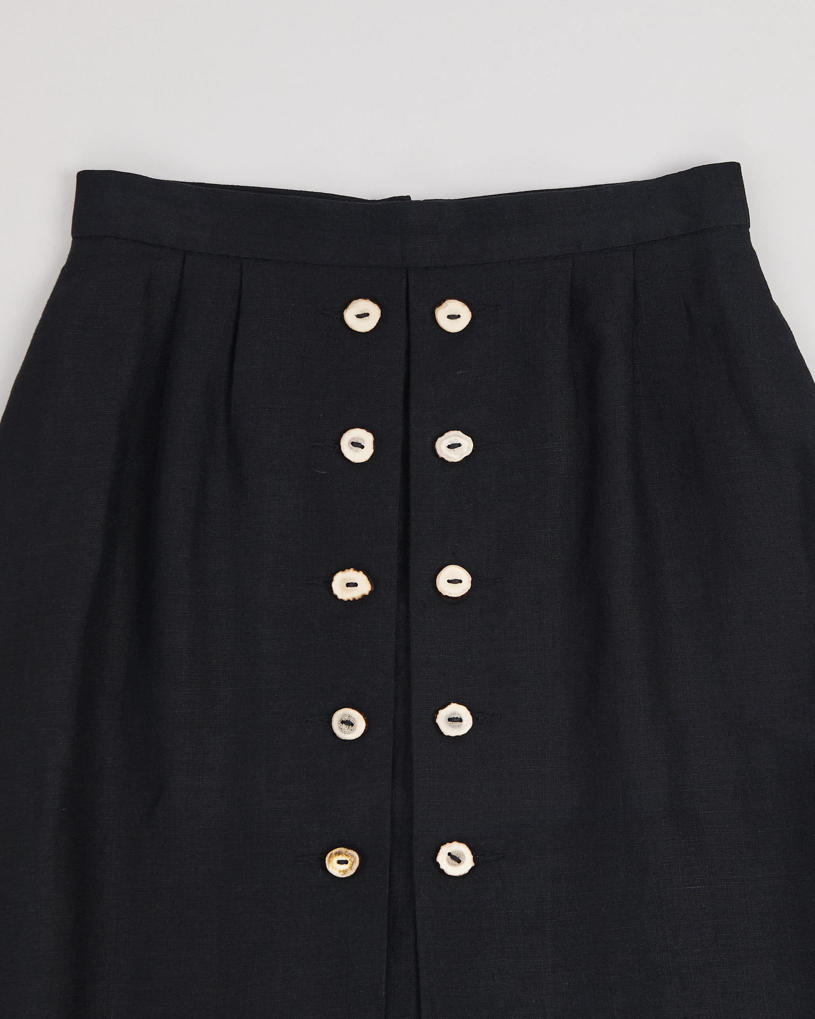Юбка изо льна, прямого кроя с вертикальной планкой на контрастных пуговицах. Посадка на талии, линия силуэта вытянутая. Сзади скрытая молния и небольшой карман с клапаном на пуговице.