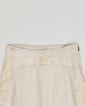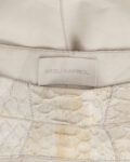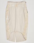 Юбка из 100% натуральной кожи кремового оттенка с контрастными фактурными вставками под рептилию. Материал плотный и гладкий в центральной части, боковые панели имеют рельефную поверхность с выраженным рисунком. Посадка высокая, ассиметричный силуэт, линия низа с разрезом.