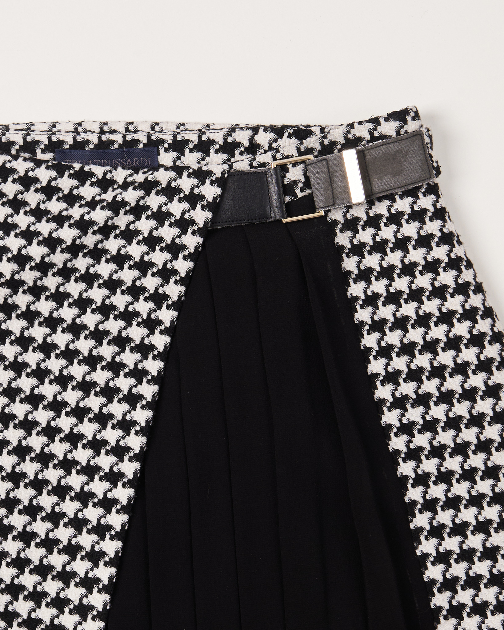 Юбка Trussardi из плотного материала в рубчик. Посадка высокая, застежка на ремешок. Акцентная плиссировка сбоку.