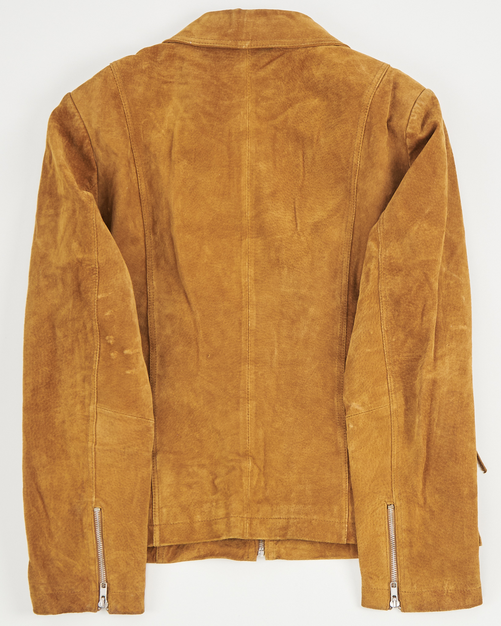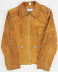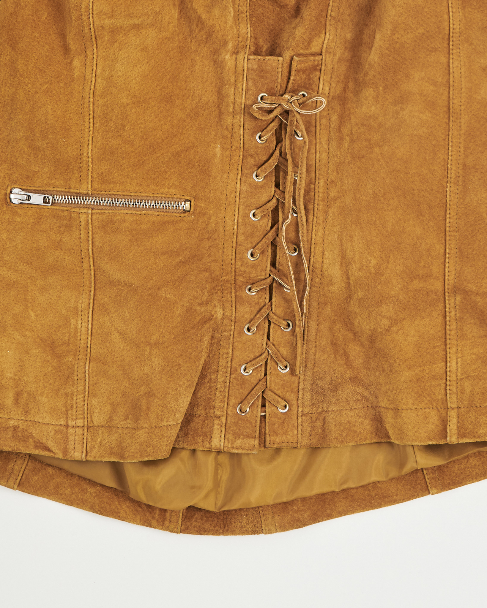 Куртка из 100% натуральной замши тёплого карамельного оттенка. Прямая посадка, металлическая фурнитура и аккуратные молнии, акцентная шнуровка по бокам.