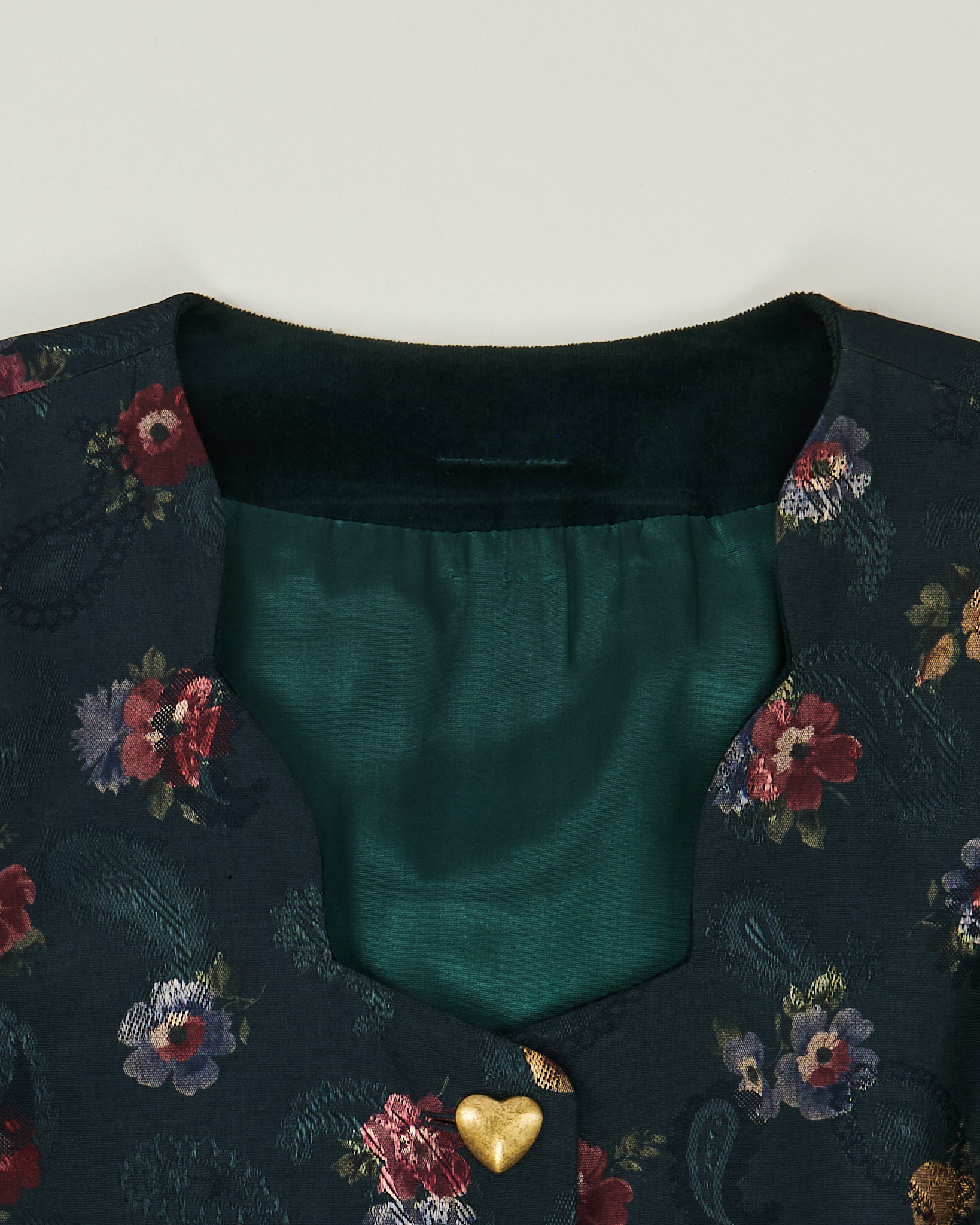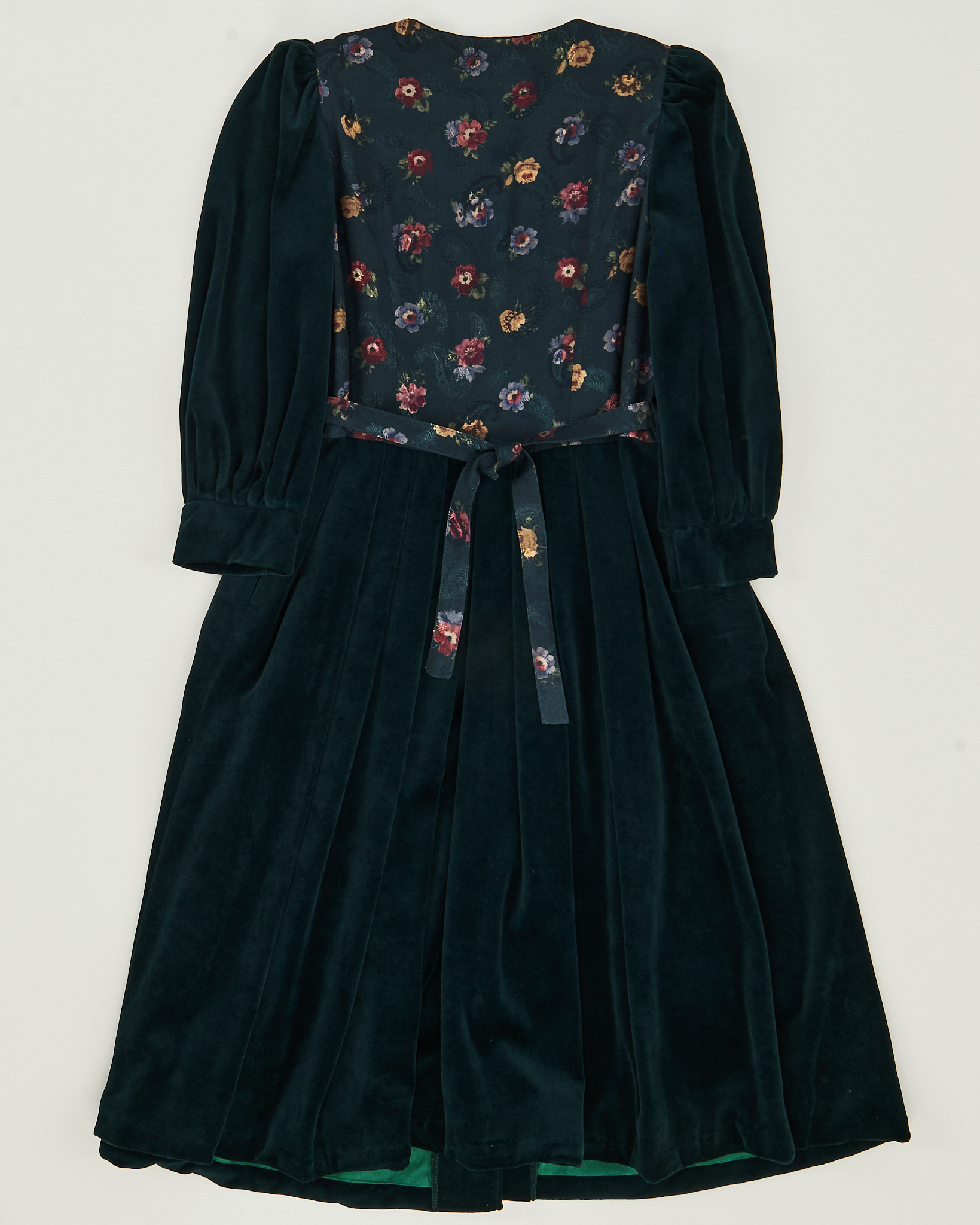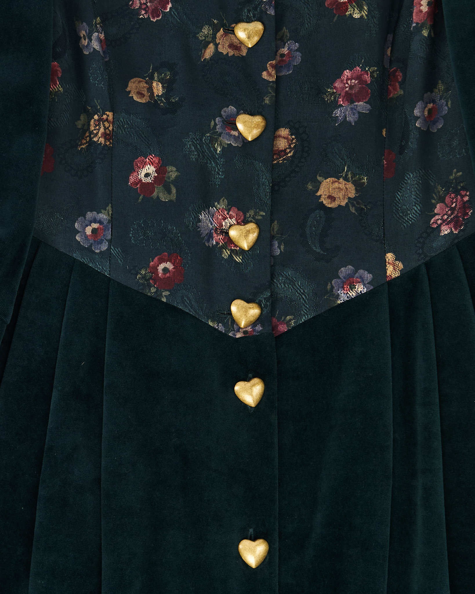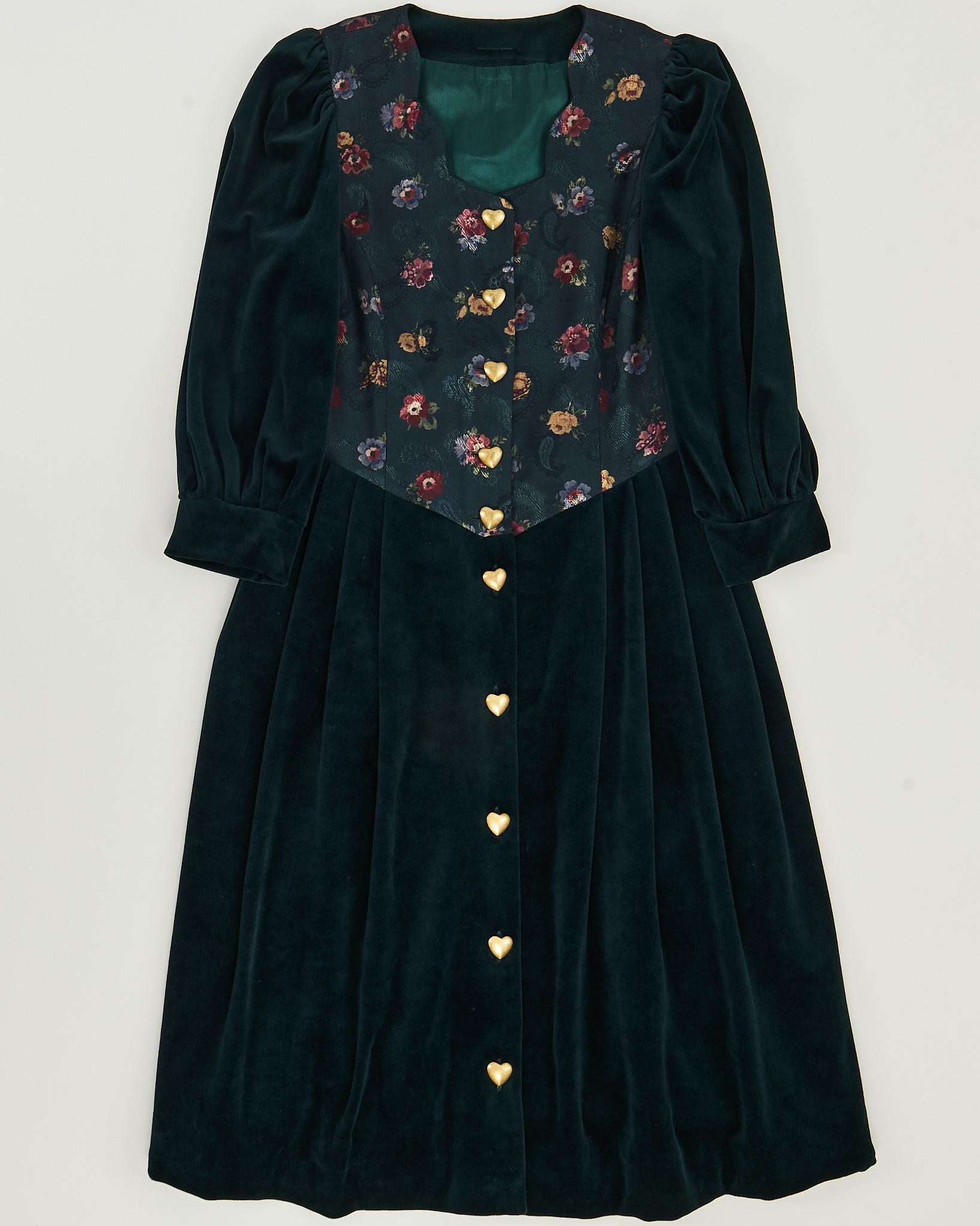 Бархатное платье глубокого тёмно-зелёного оттенка с благородным блеском. Кокетка украшена цветочным принтом в приглушённых тонах. Объёмные рукава-буфы, декоративные пуговицы в форме сердечек золотистого цвета и два вшитых кармана по бокам. Винтажный романтизм конца XIX - начала XX века.