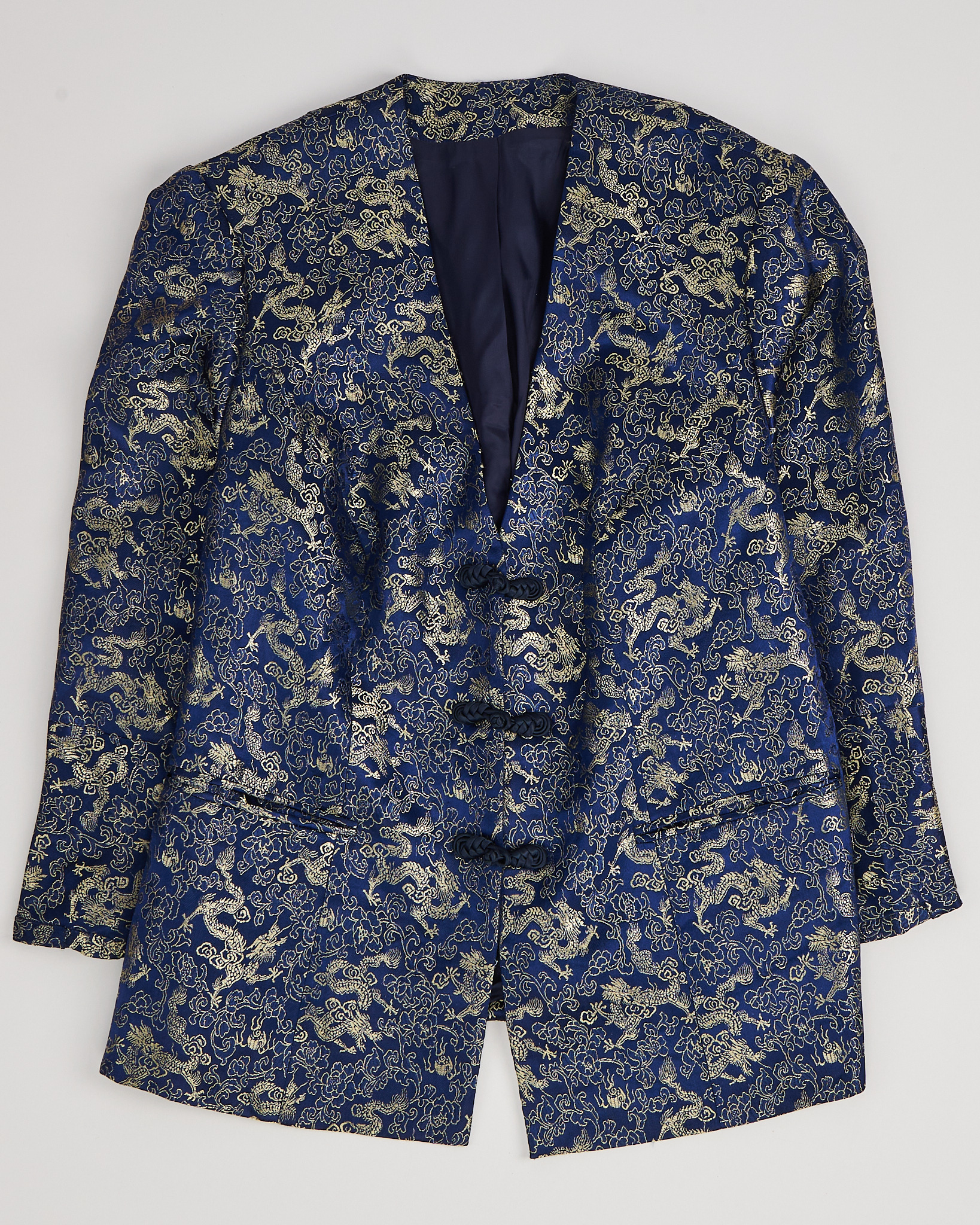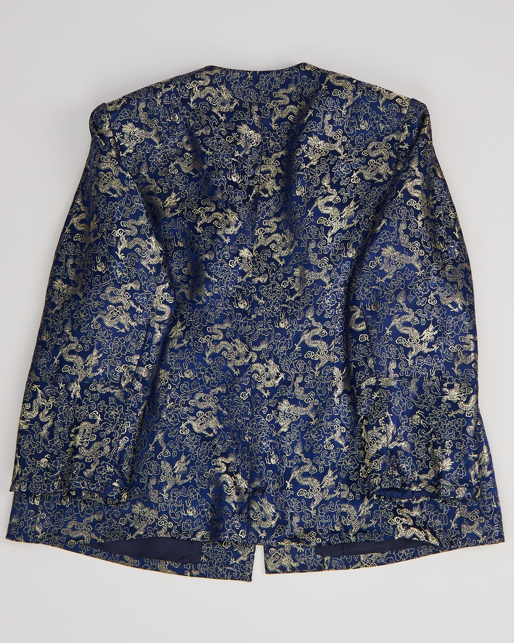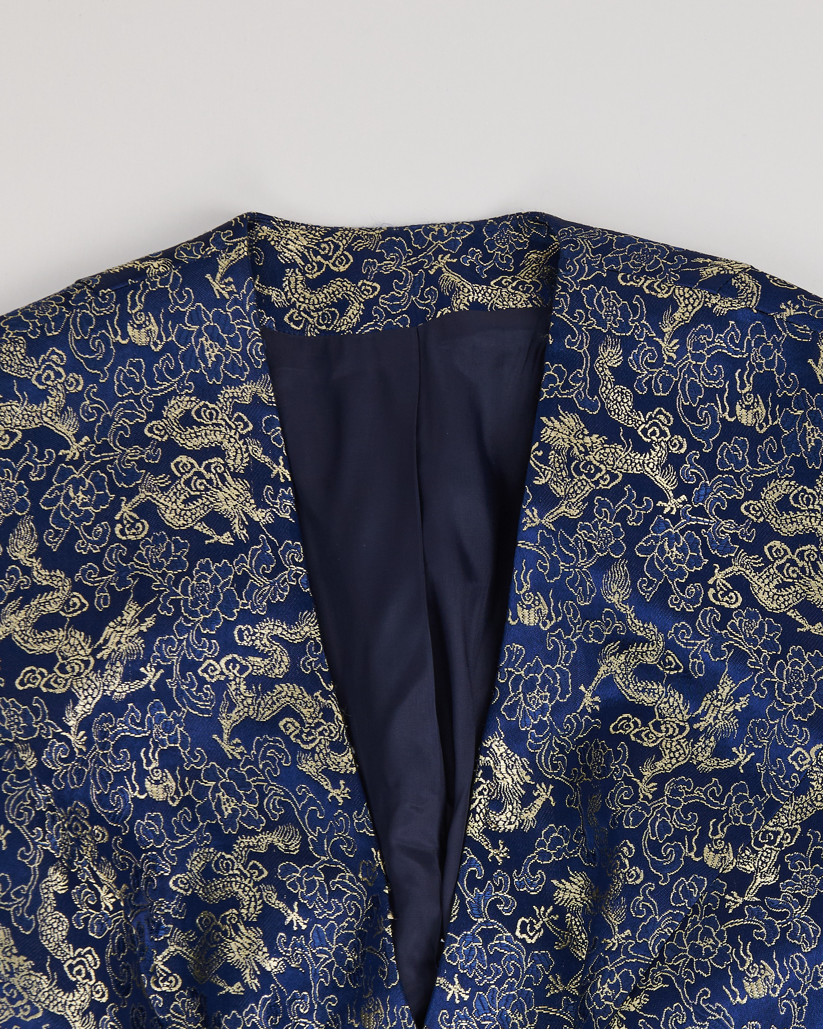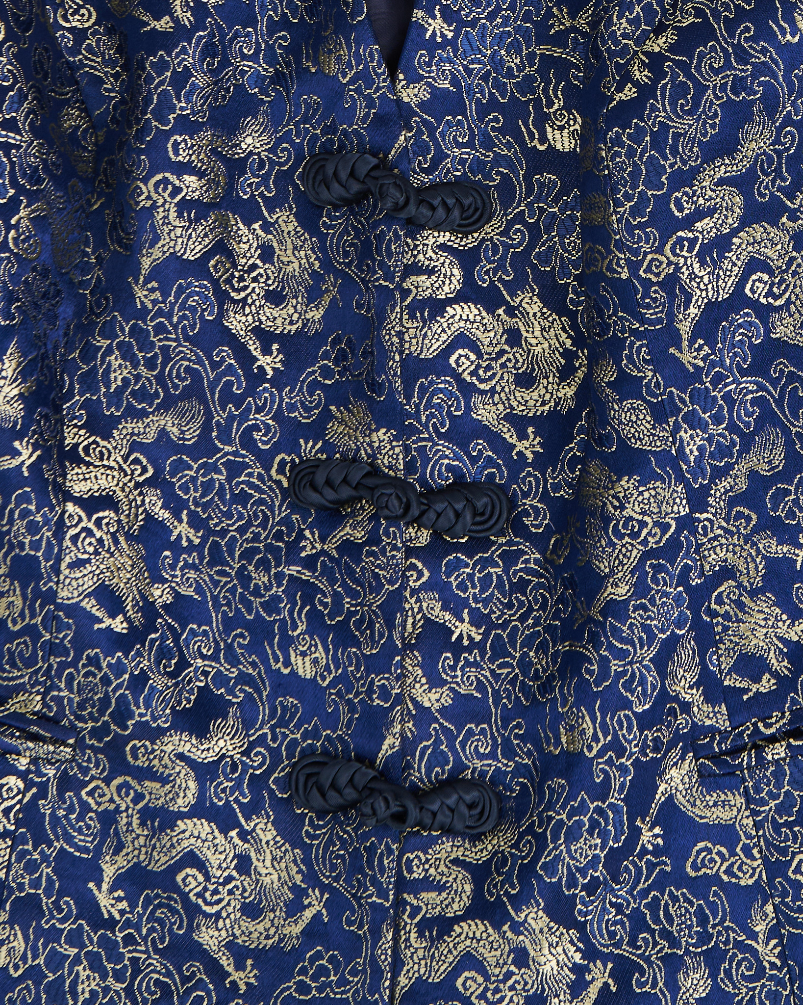 Жакет из плотной ткани с легким блеском. Прямая посадка с мягкой линией плеч, удобные подплечники. Застежка на текстильные узлы и глубокий вырез. Акцентный орнамент с драконами в золотом цвете, ткань красиво переливается в зависимости от света.