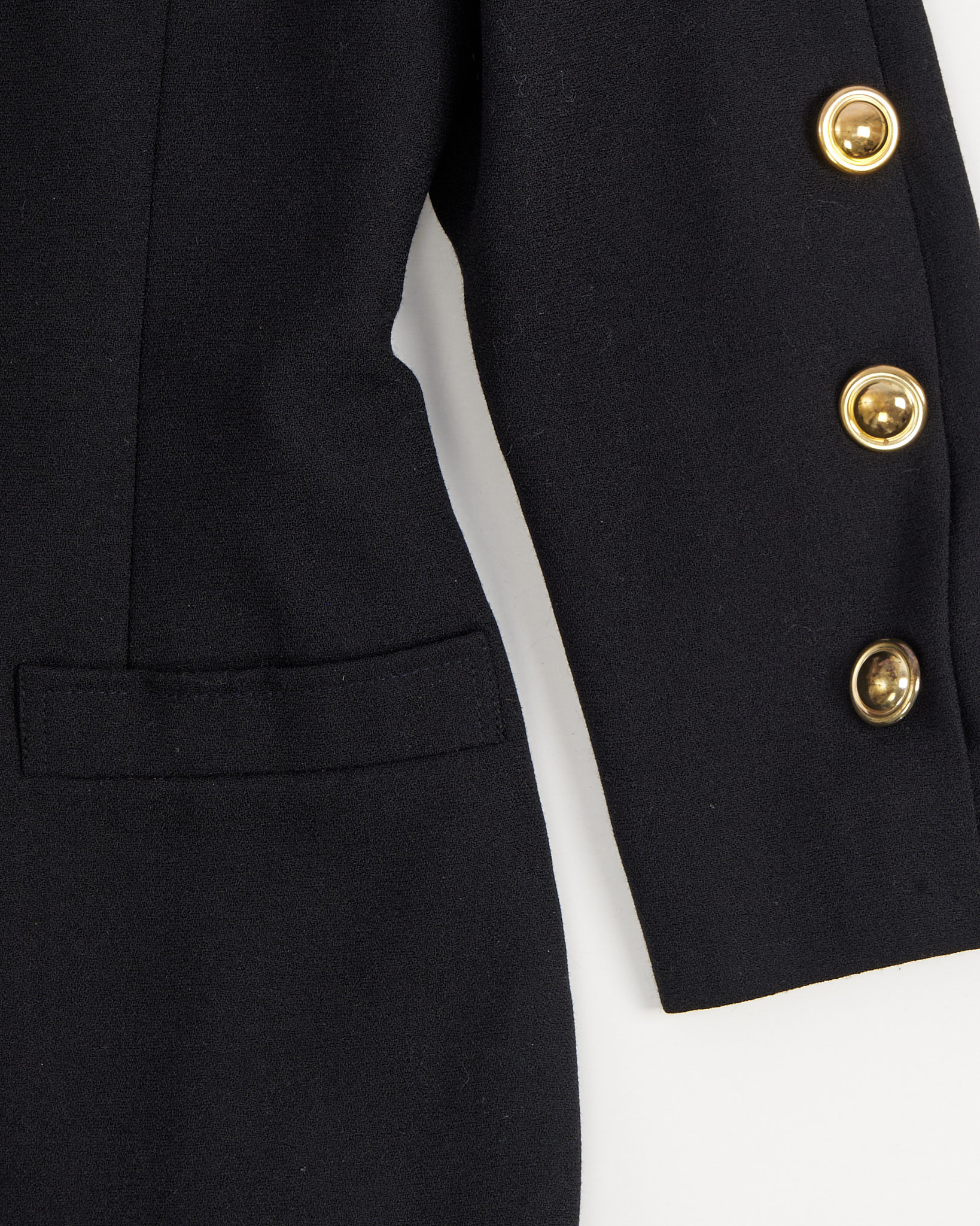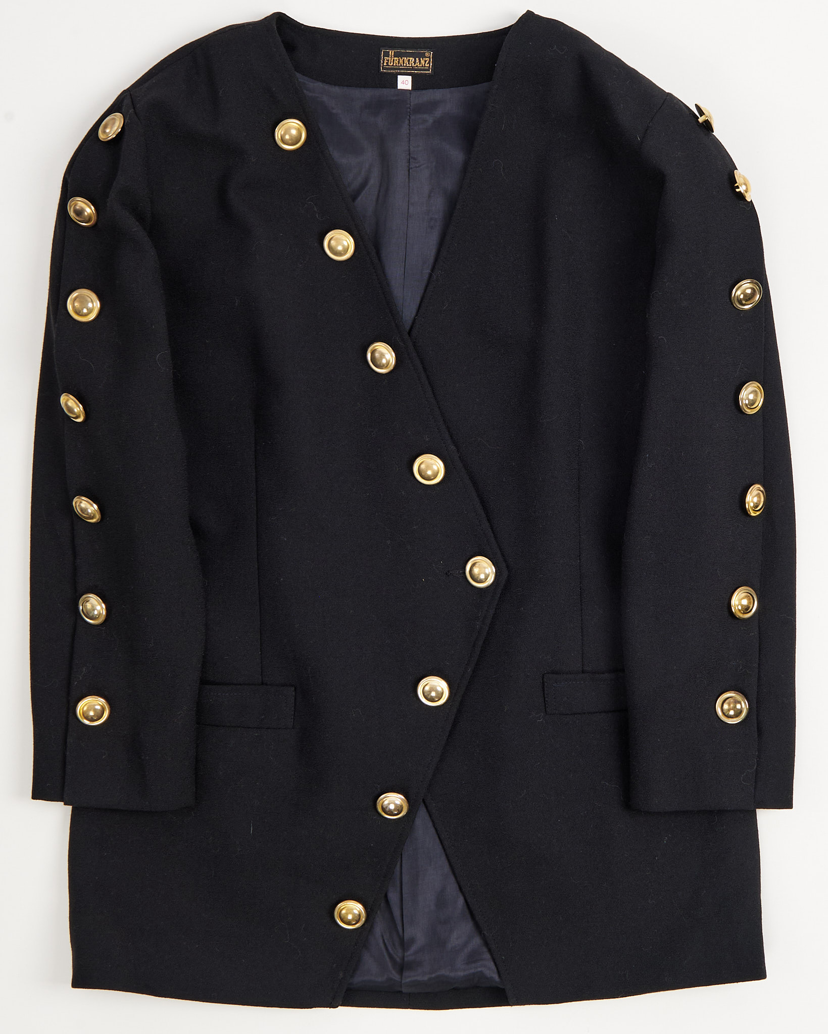 Черный жакет Fürnkranz в стиле милитари. Вертикальные швы и акцентные плечи создают четкий силуэт точно по фигуре. Качественная фурнитура: ряд золотистых металлических пуговиц идет по всей длине рукава.