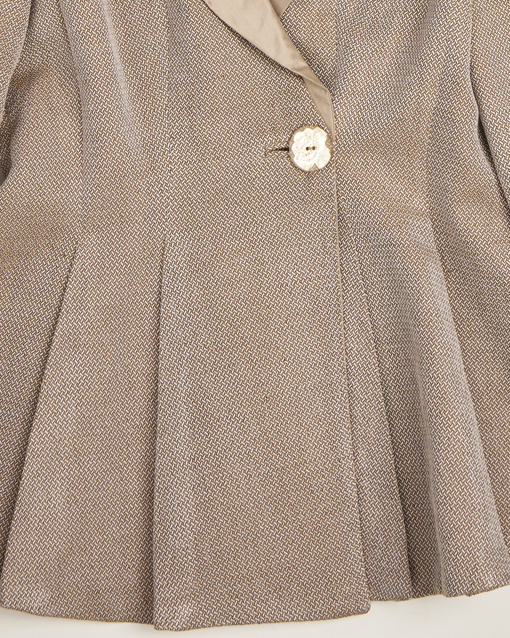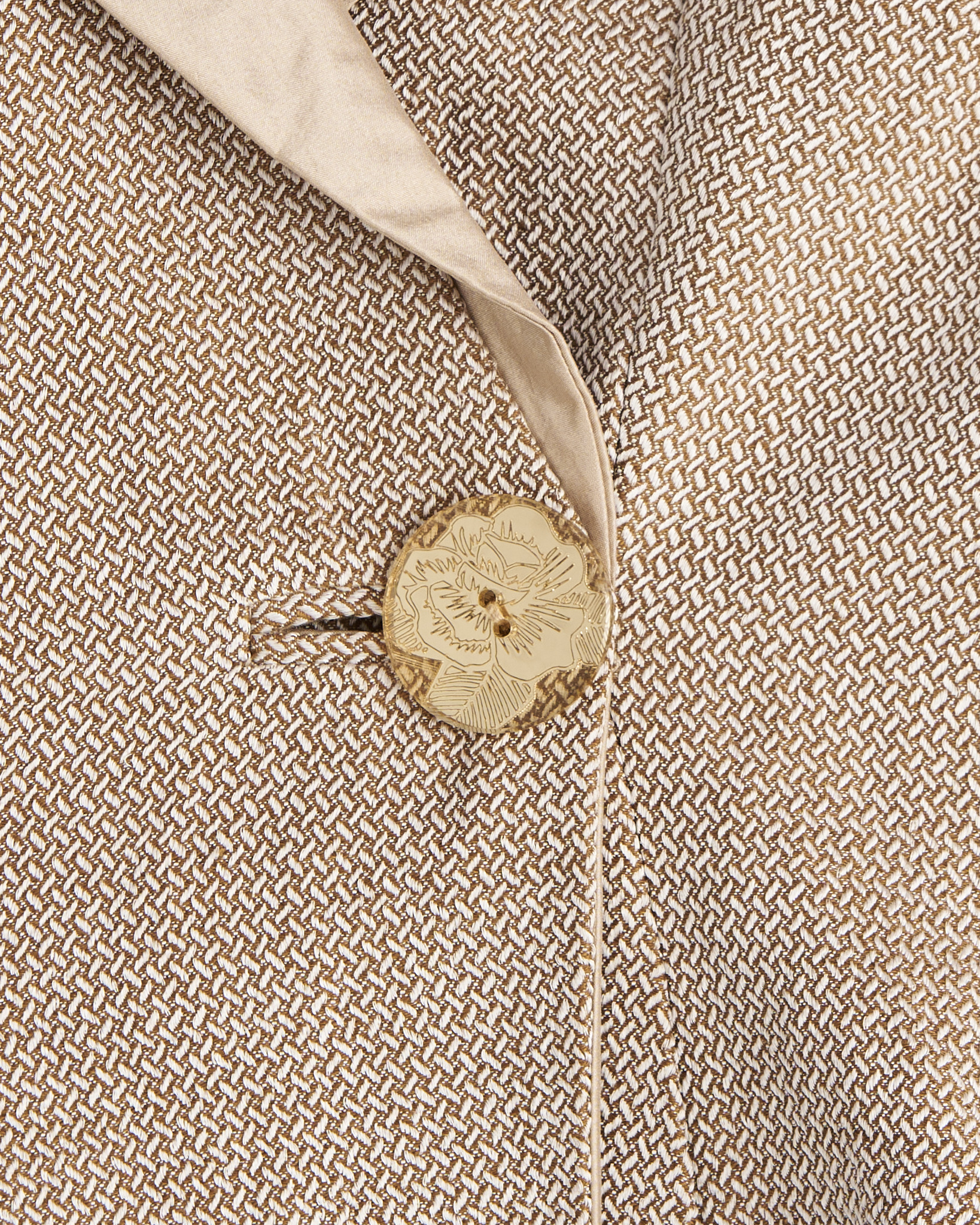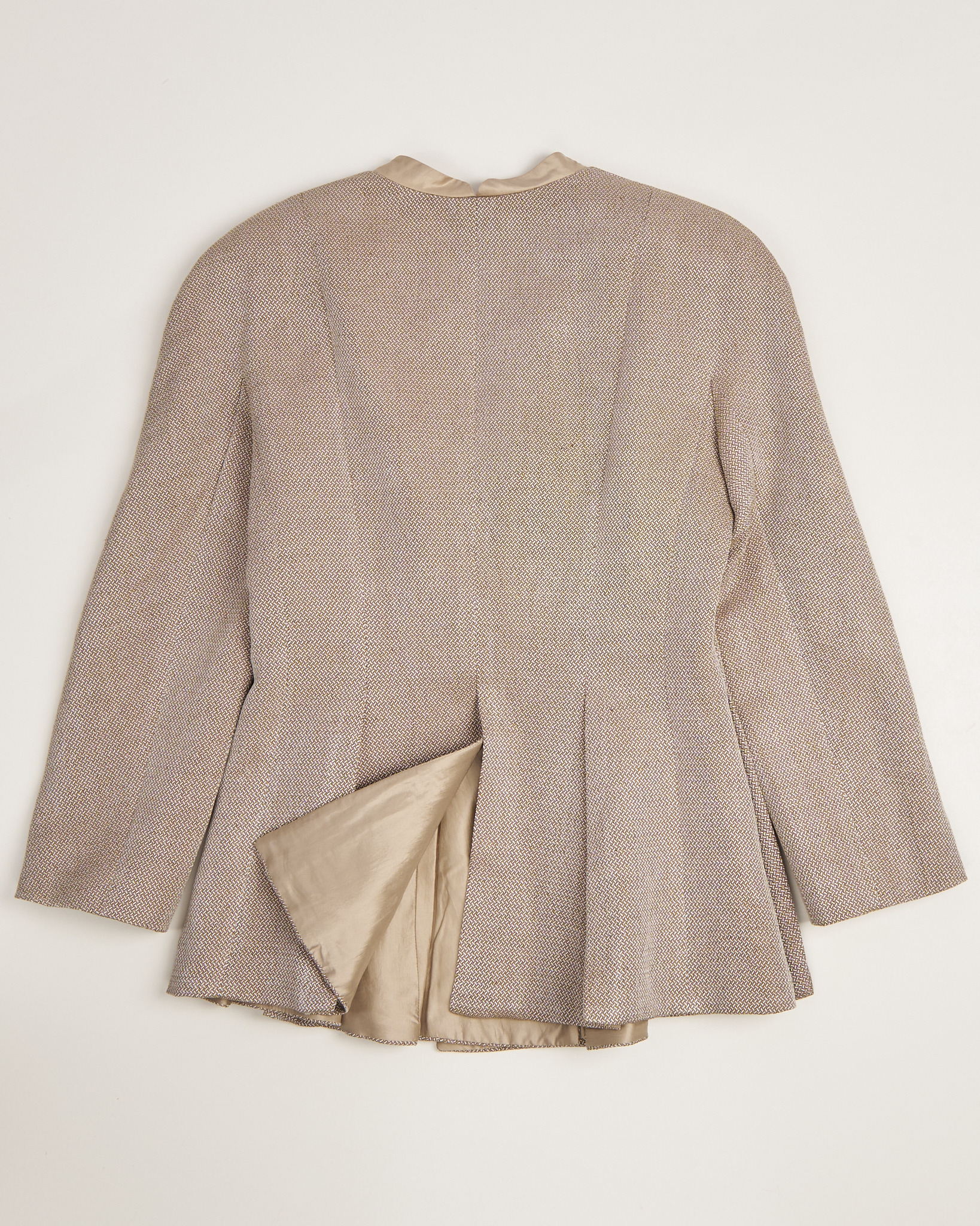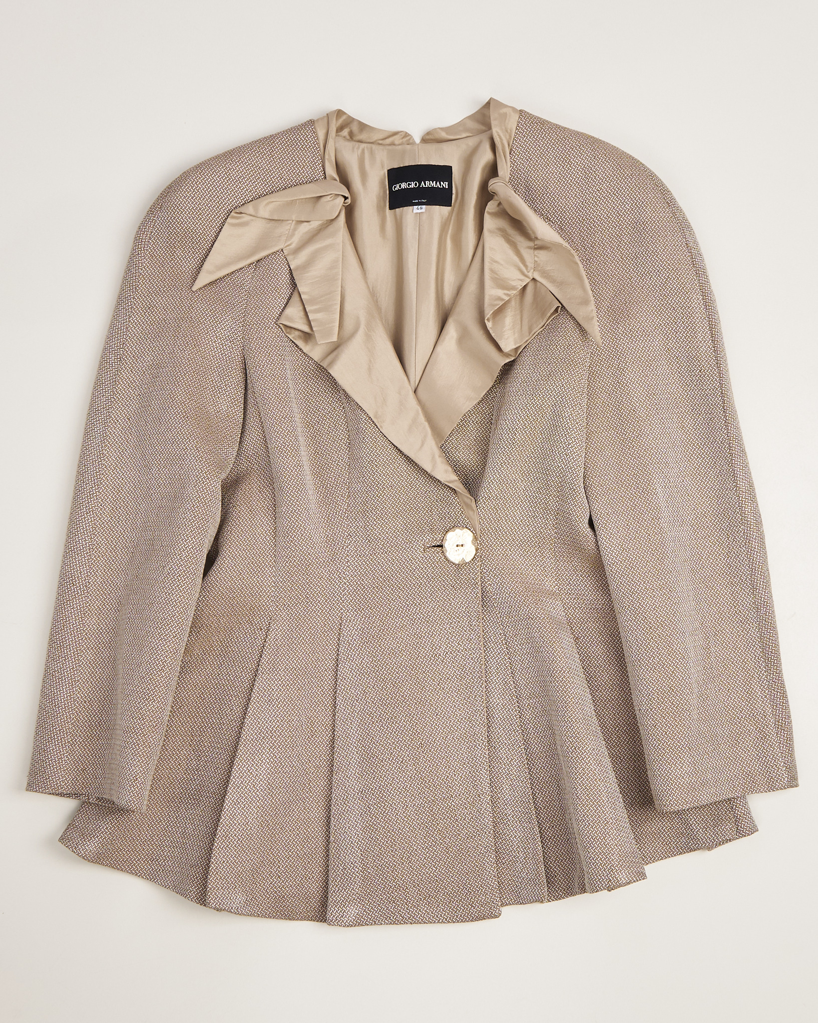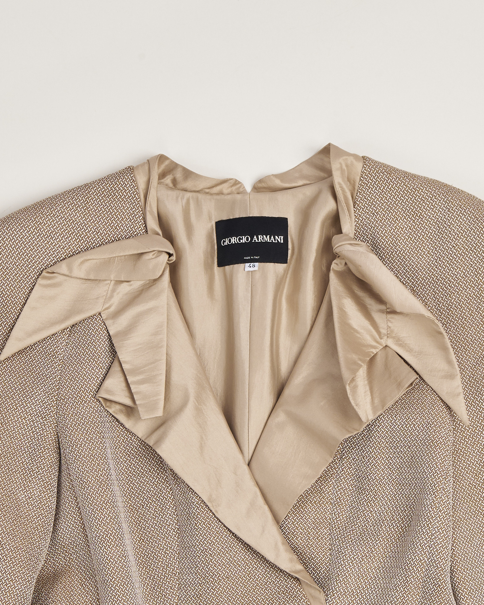 Жакет Giorgio Armani из плотной фактурной ткани. Посадка по фигуре, линия талии подчеркнута, низ раскрывается мягкими складками. Атласный ворот с завязками и акцентная пуговица с гравировкой.
