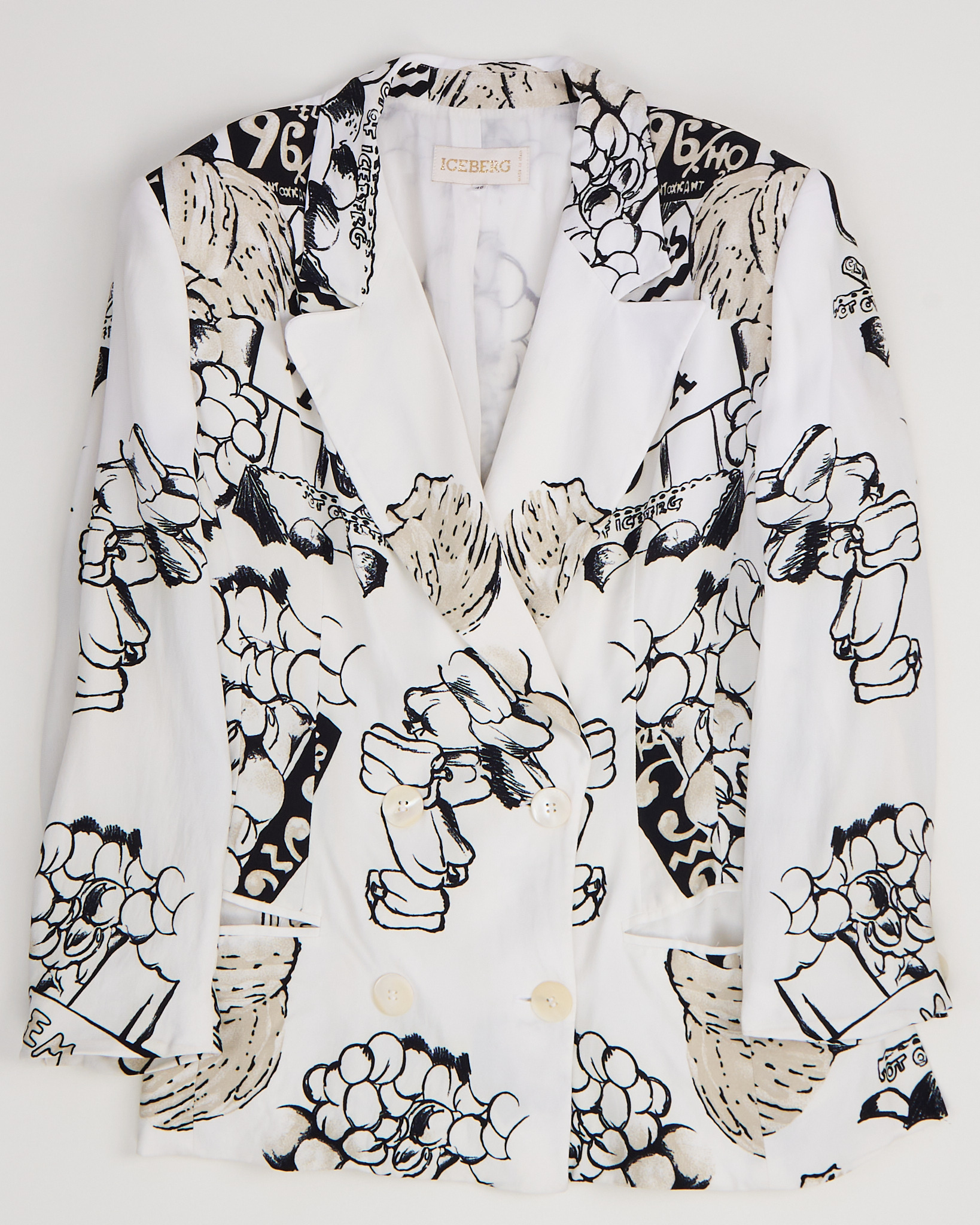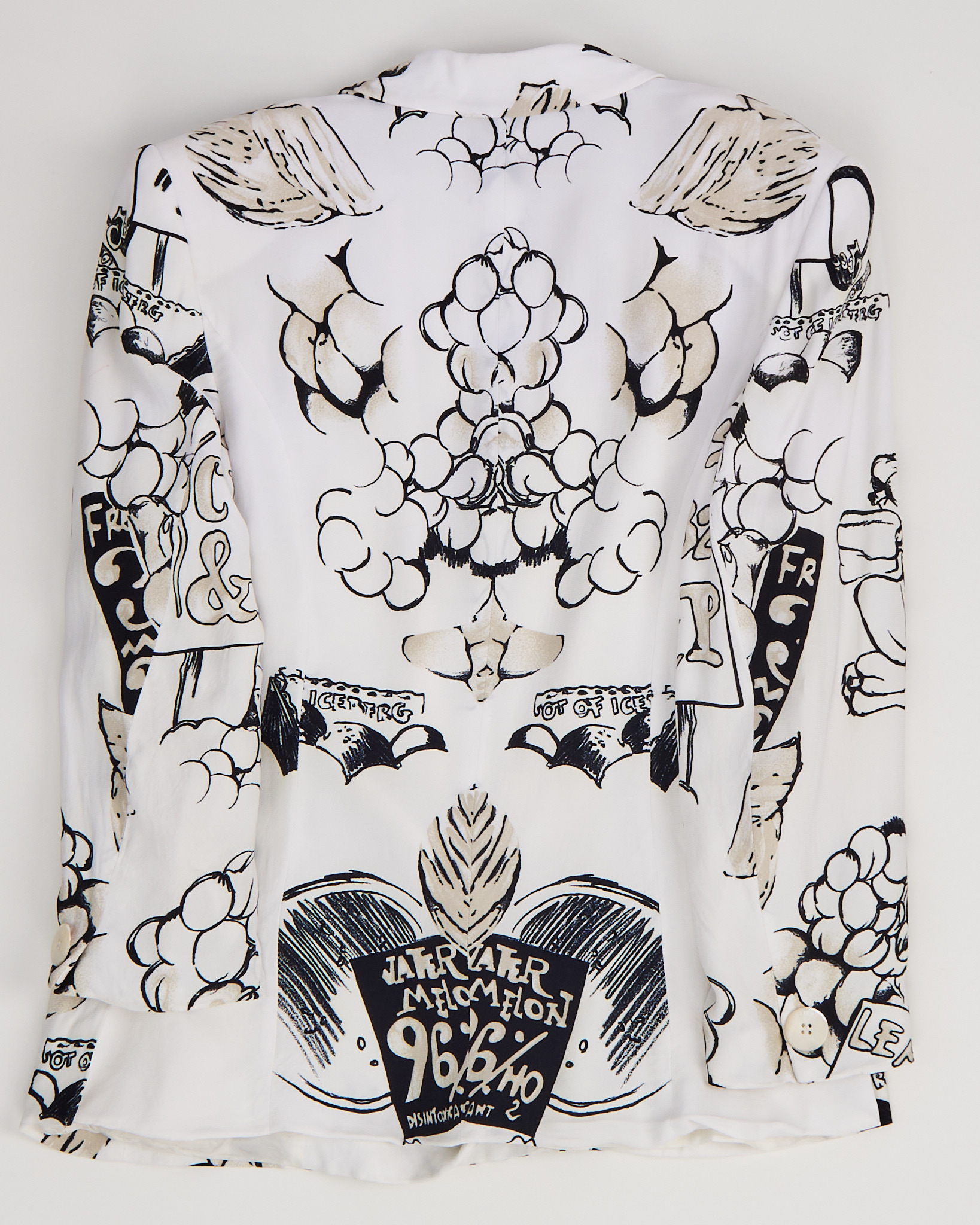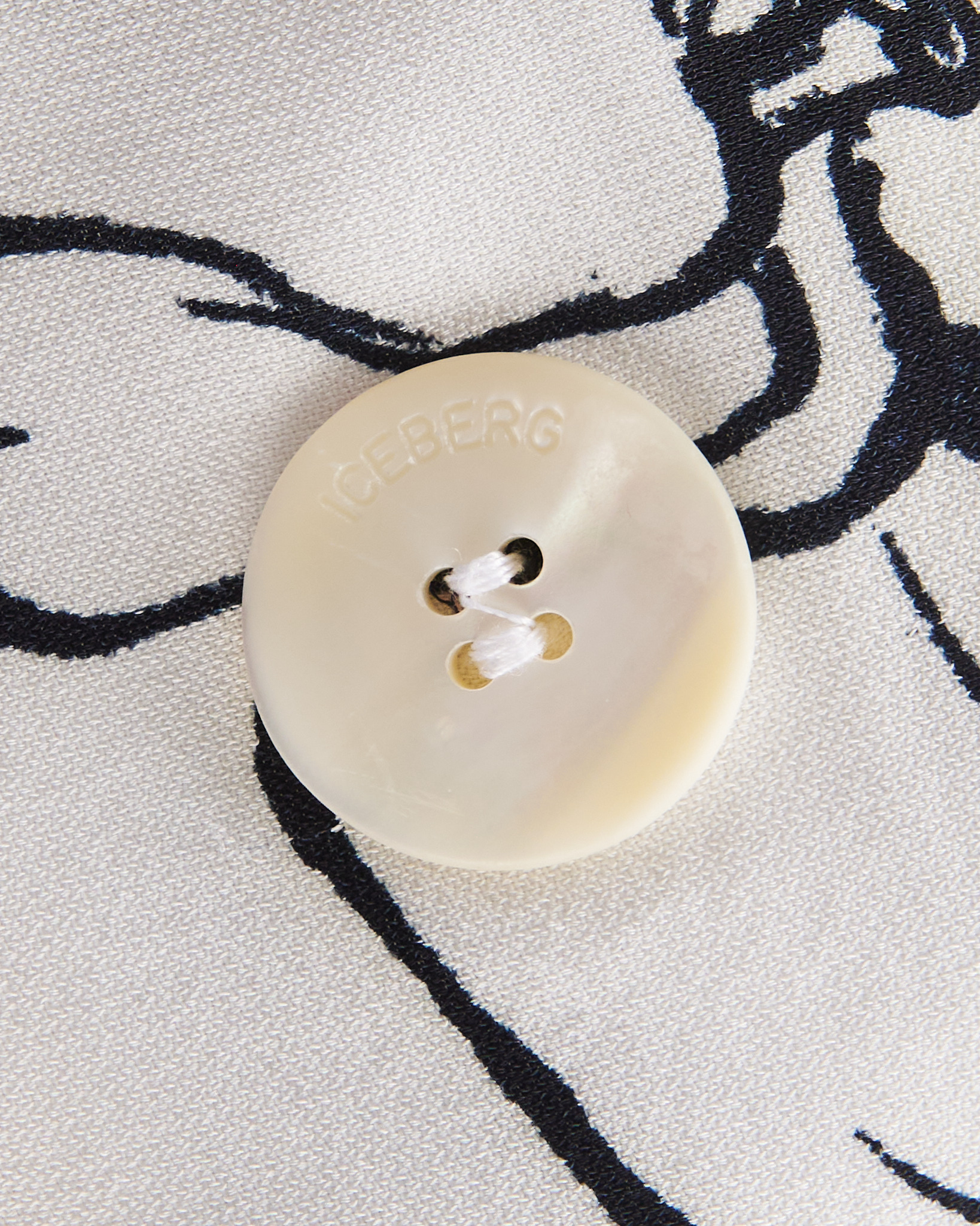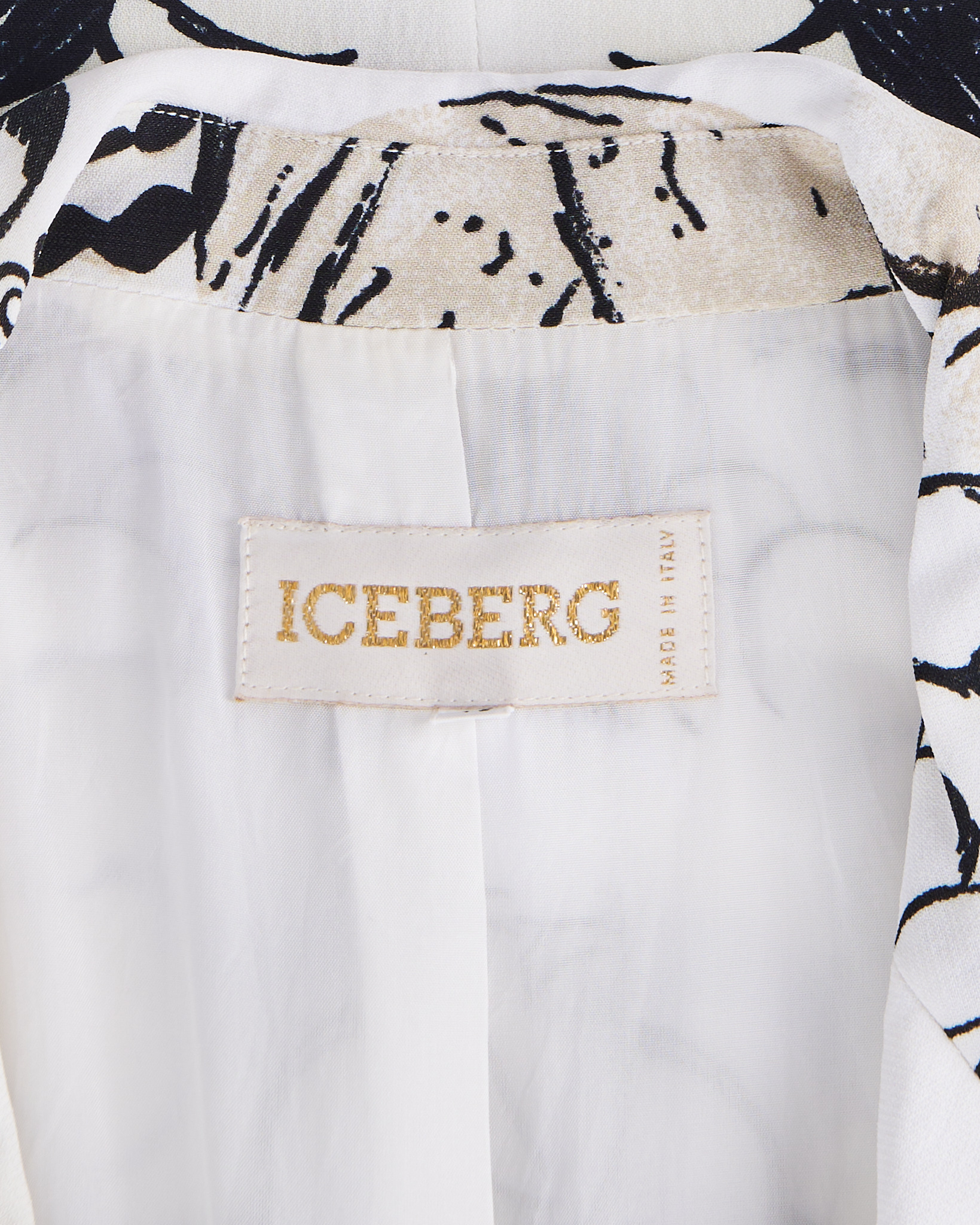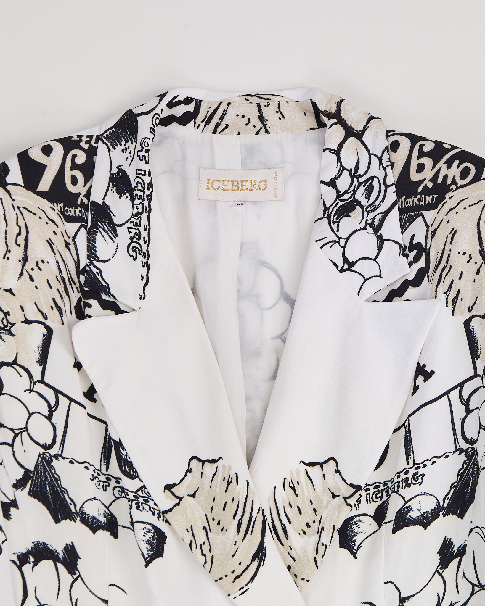 Жакет из 100% вискозы светлого оттенка с контрастным графичным рисунком. Посадка прямая, двубортная застёжка с широким лацканом.