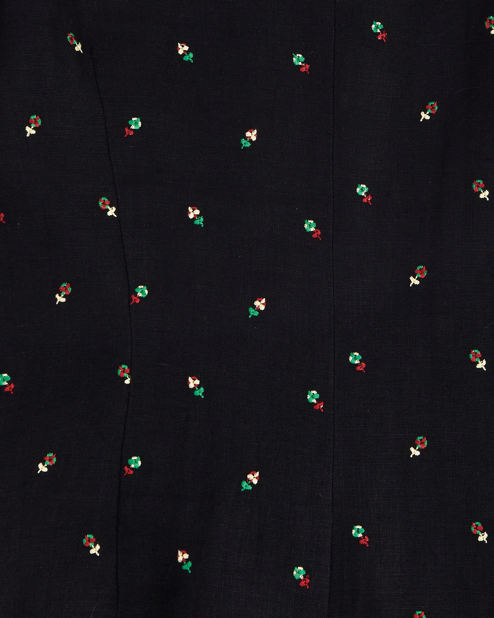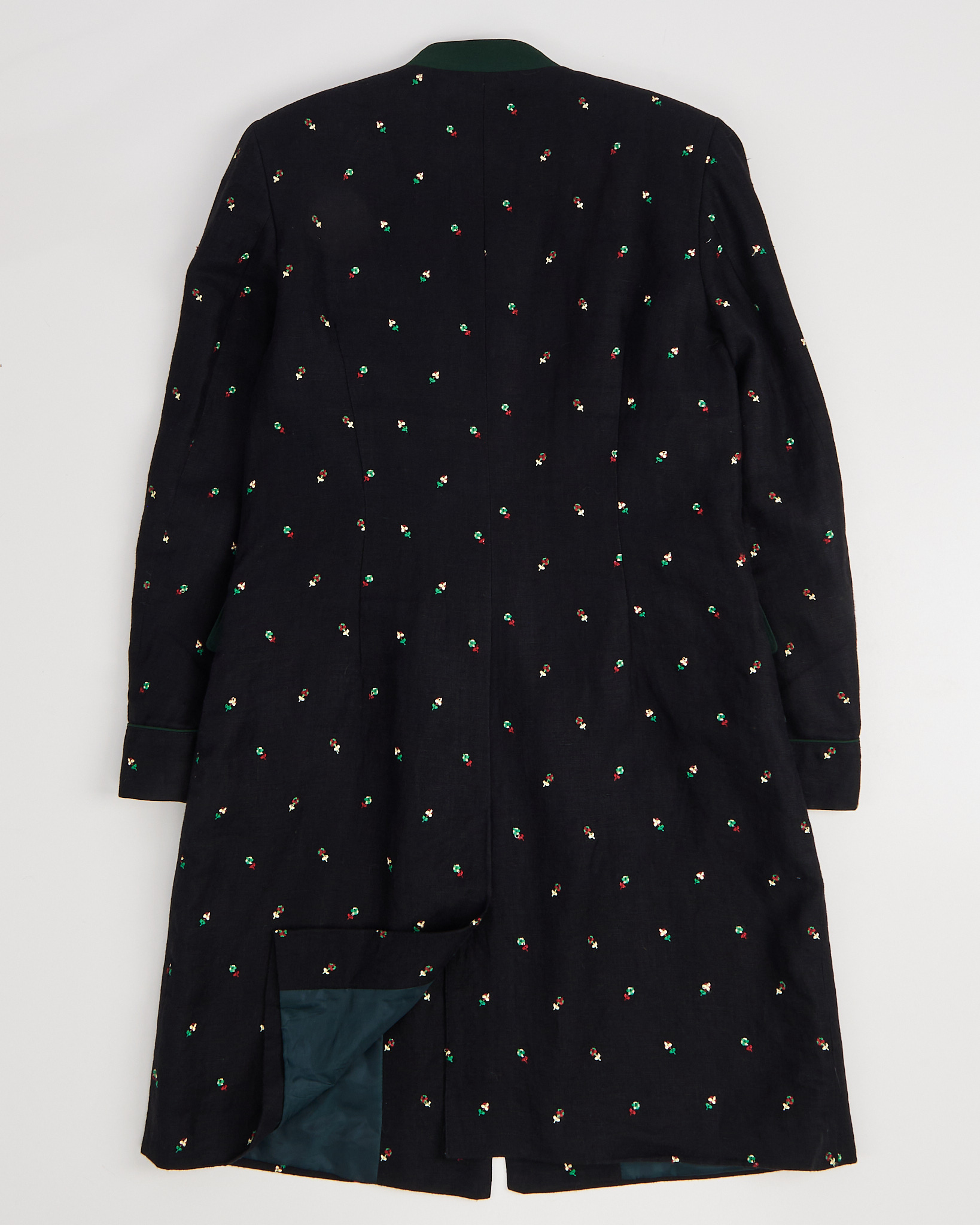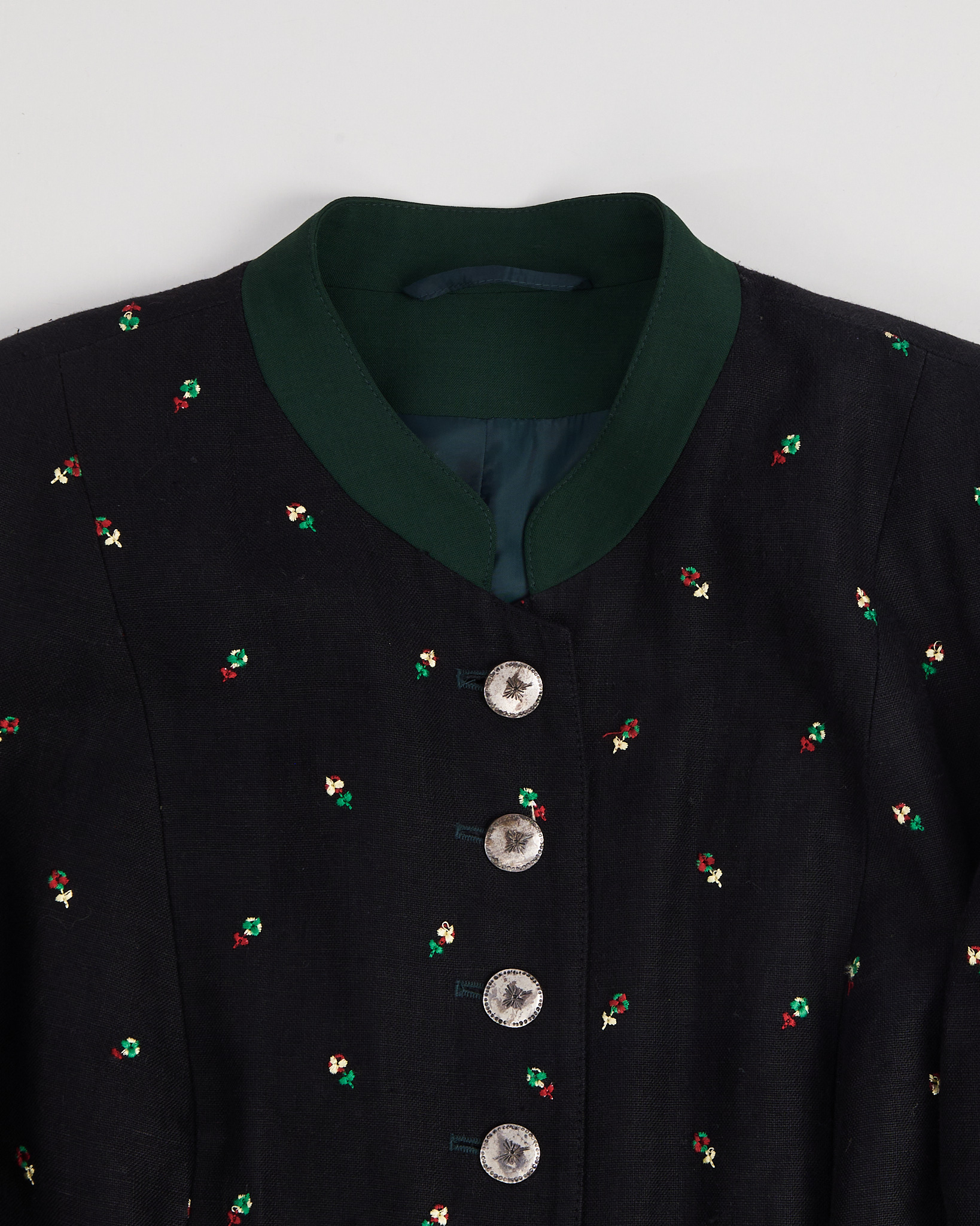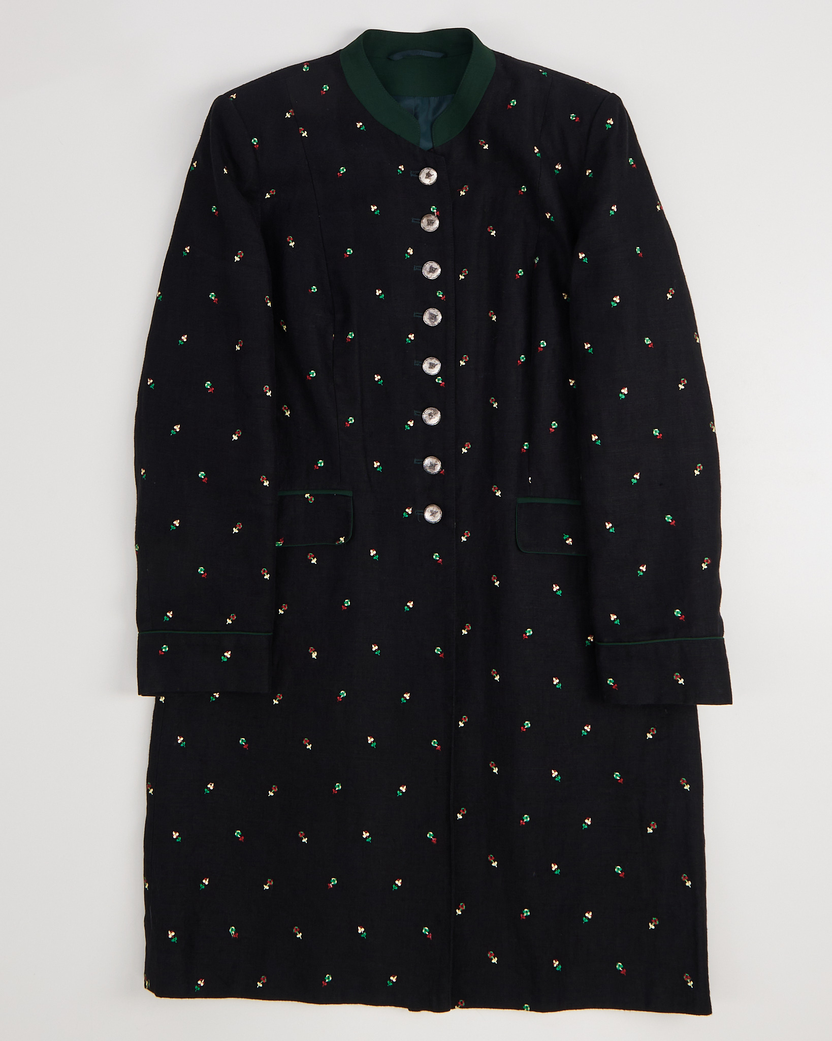 Жакет из плотной льняной ткани черного цвета. Посадка прямая, линия корпуса собранная, длина до колена. Застёжка на металлические пуговицы, аккуратный воротник контрастного зелёного цвета. Вышитый рисунок в виде цветов добавляет акцент, функциональные карманы по бокам.