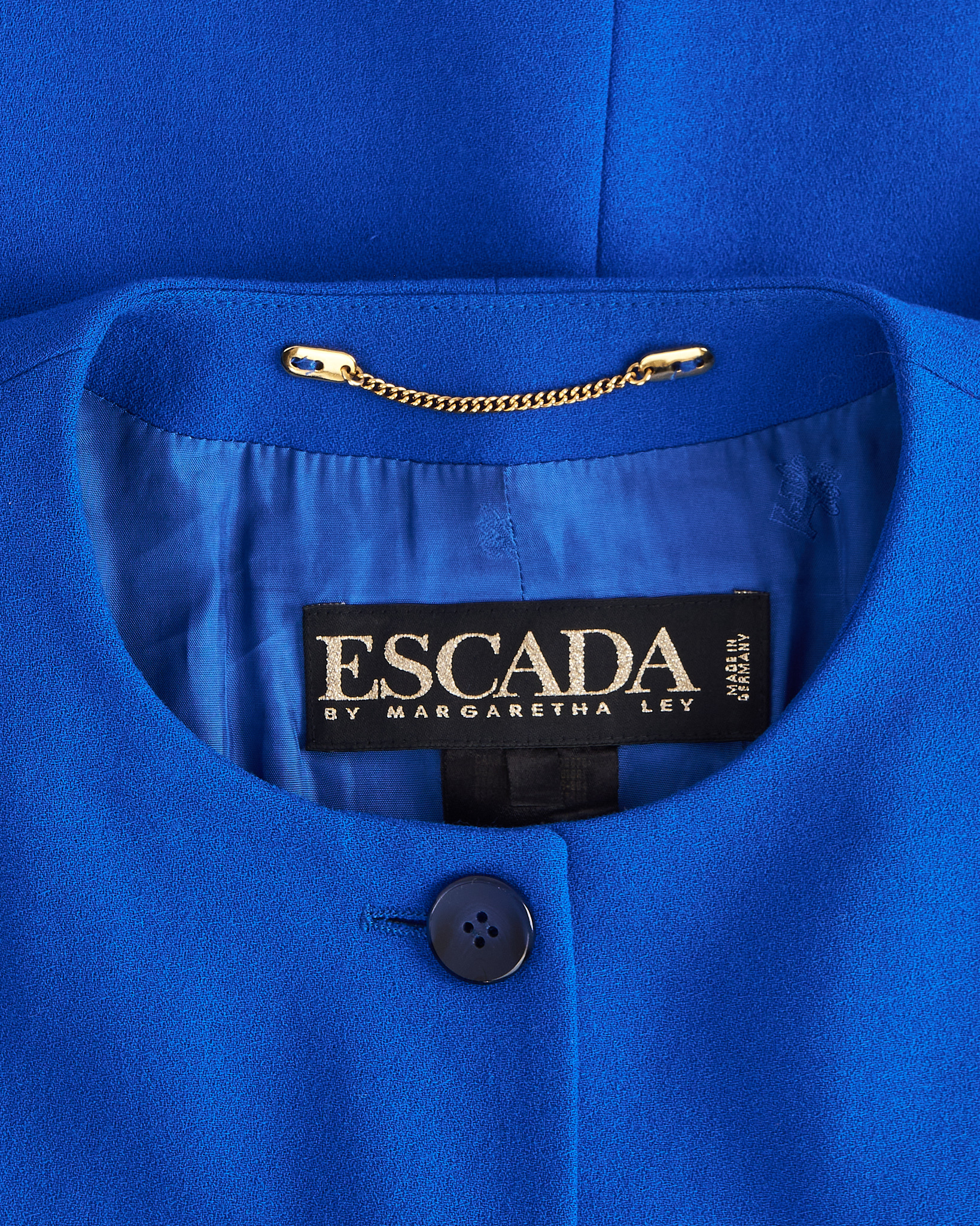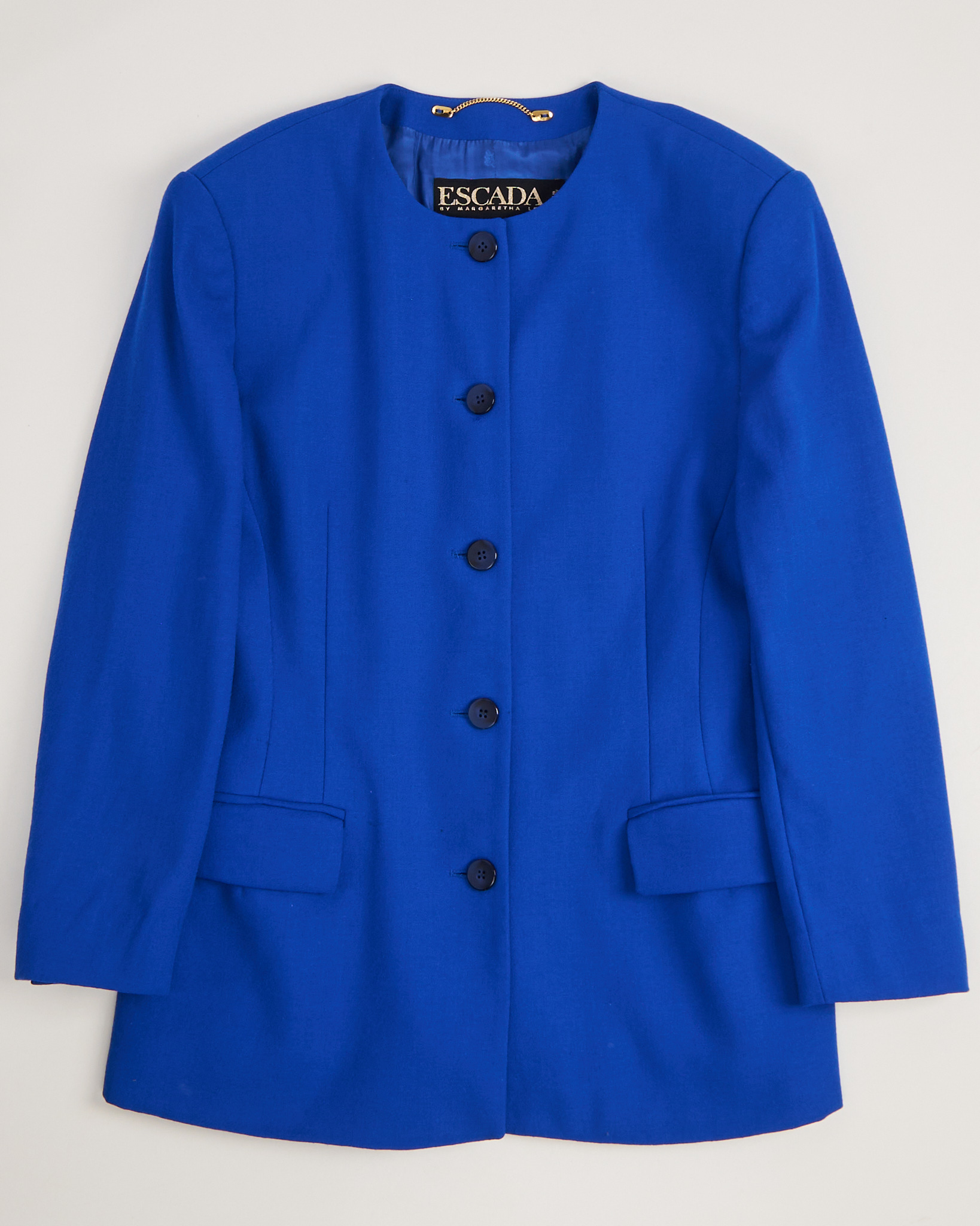 Жакет из плотной шерсти Escada. Прямой крой, приталенный силуэт. Крупные пуговицы и аккуратные клапаны карманов придают акцент.