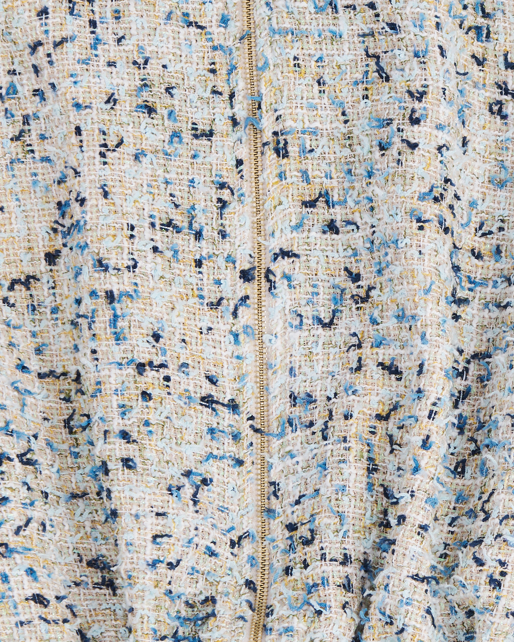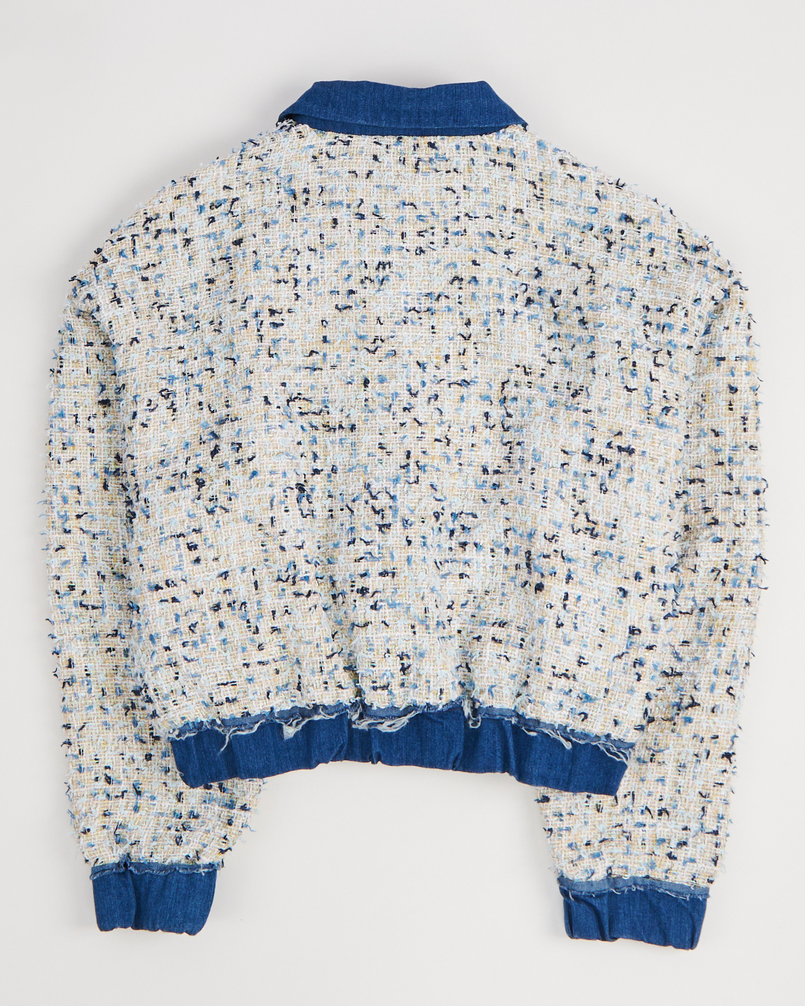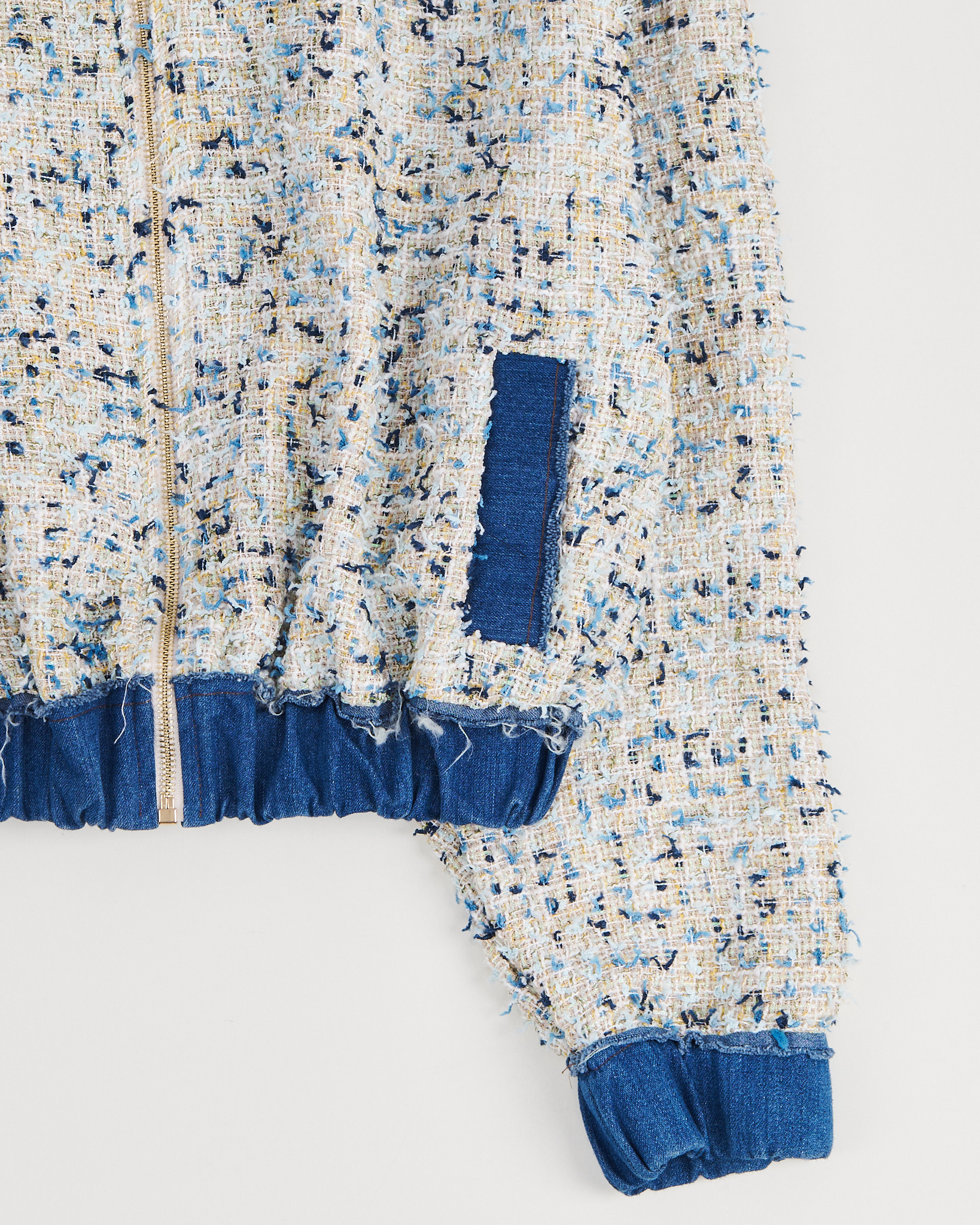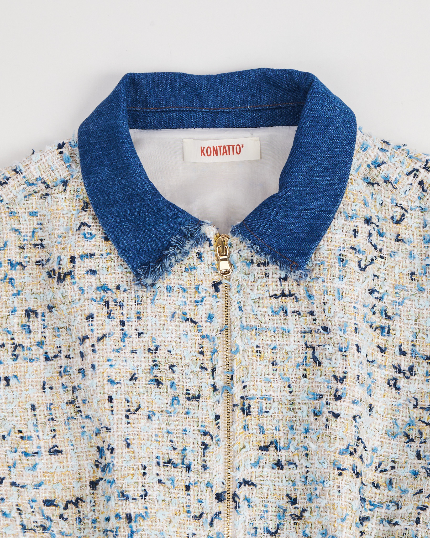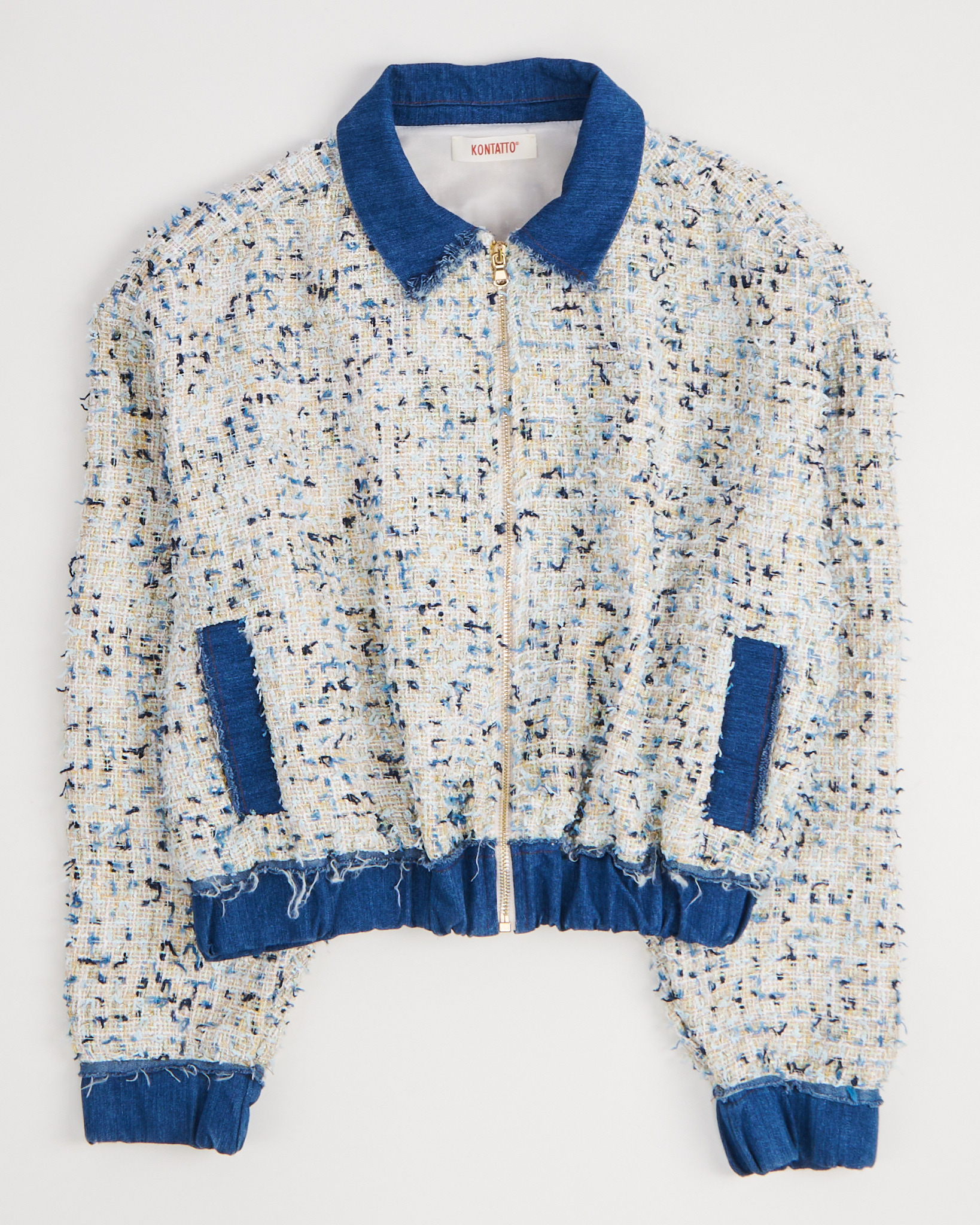 Светлый жакет Kontatto с голубым оттенком. Укороченная посадка. Свободный силуэт. Манжеты собраны на резинку. Застежка на металлическую молнию. Отложной воротник из контрастного денима. По бокам функциональные карманы.
