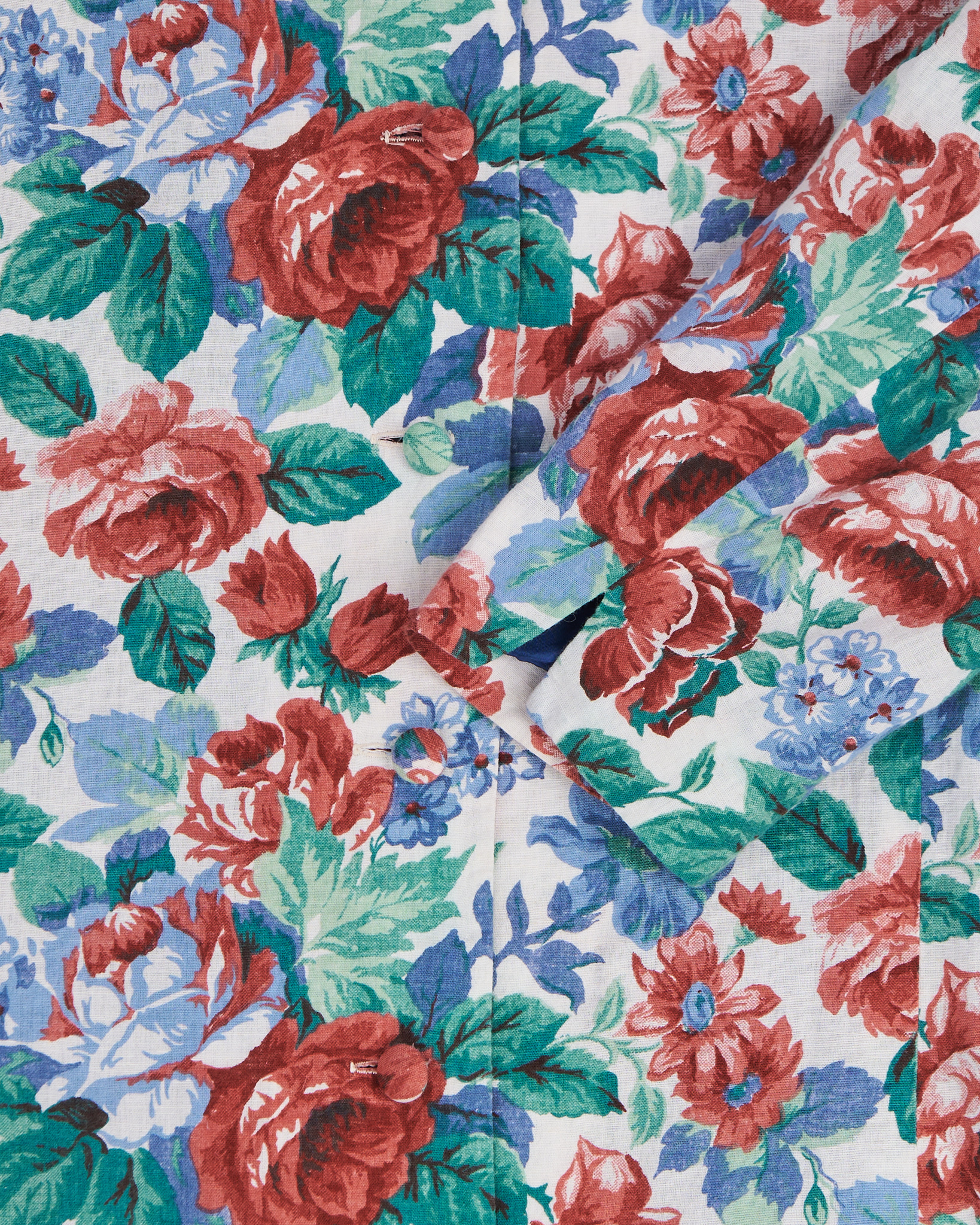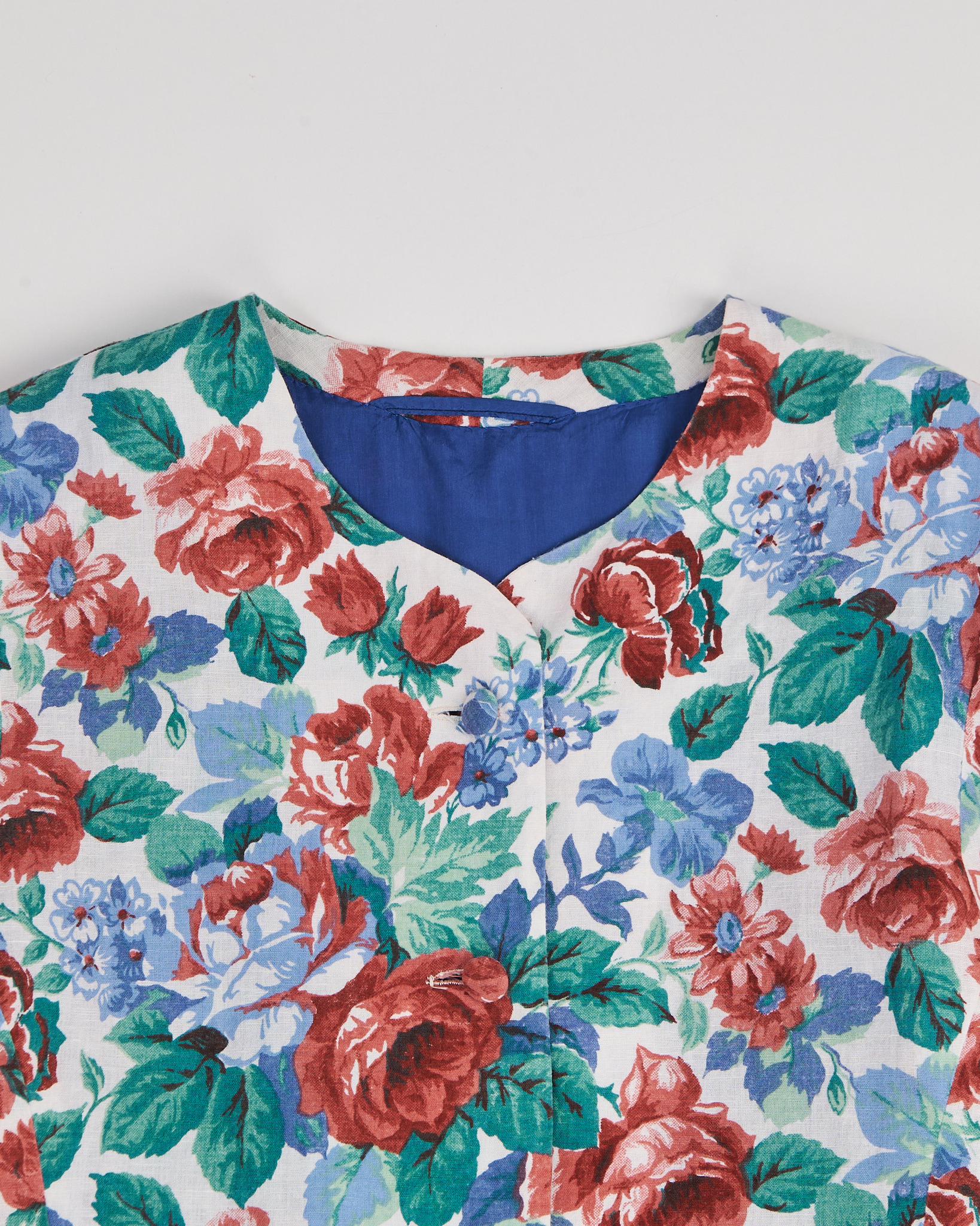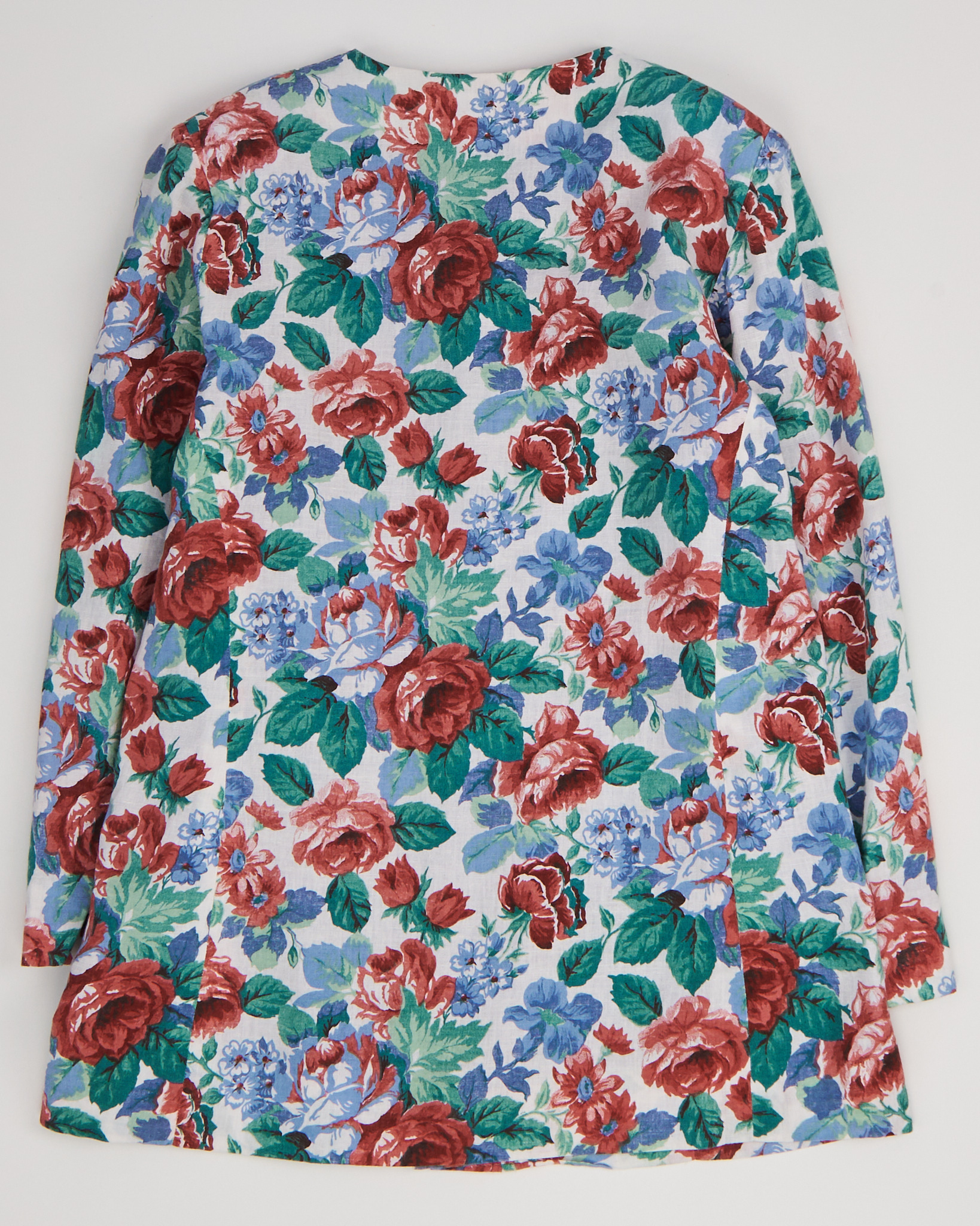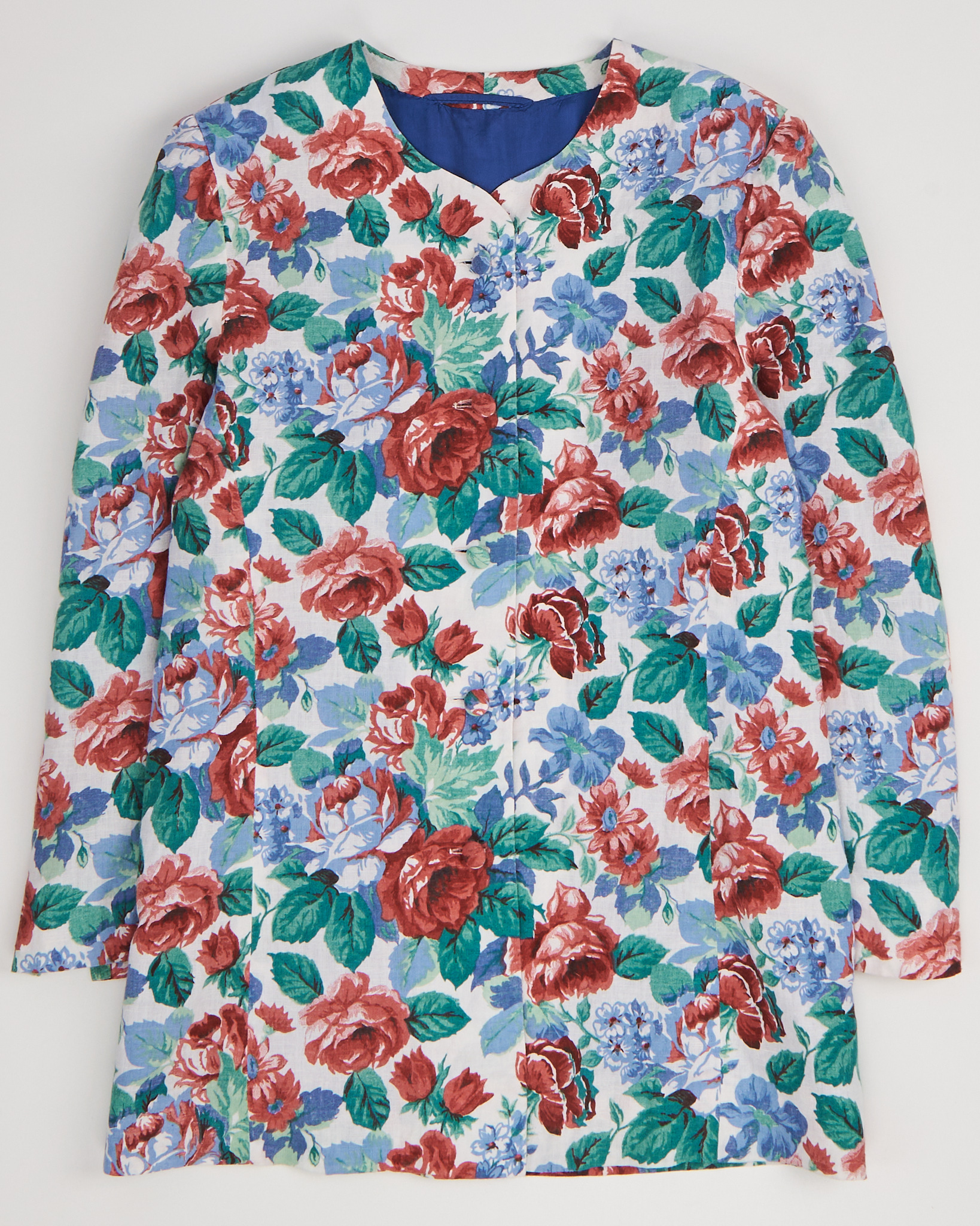 Жакет из тонкого хлопка. Классический прямой крой, застежка на обтяжные пуговицы. Крупный цветочный узор с доминированием красных роз, голубых цветов и насыщенных зелёных листьев на светлом фоне.