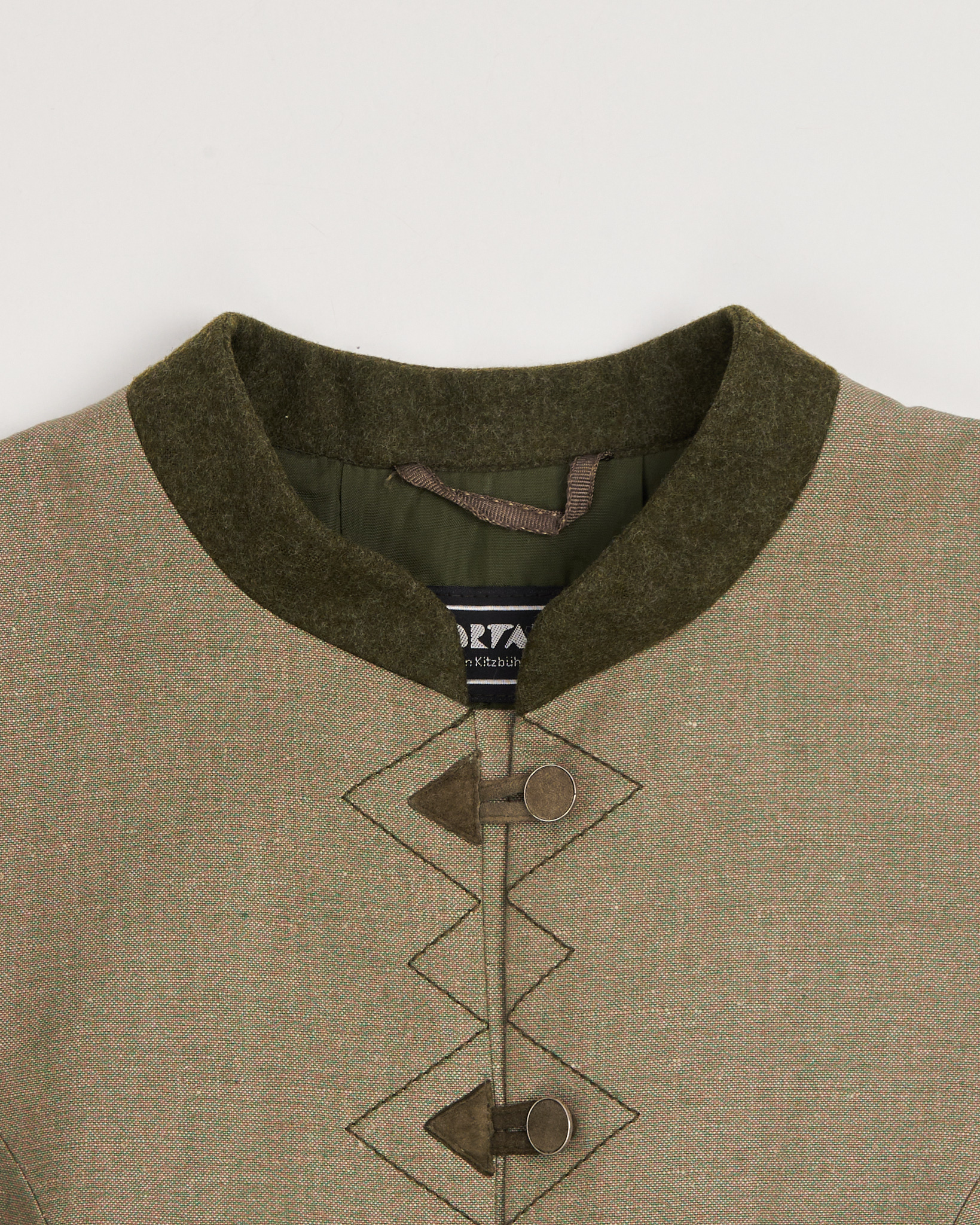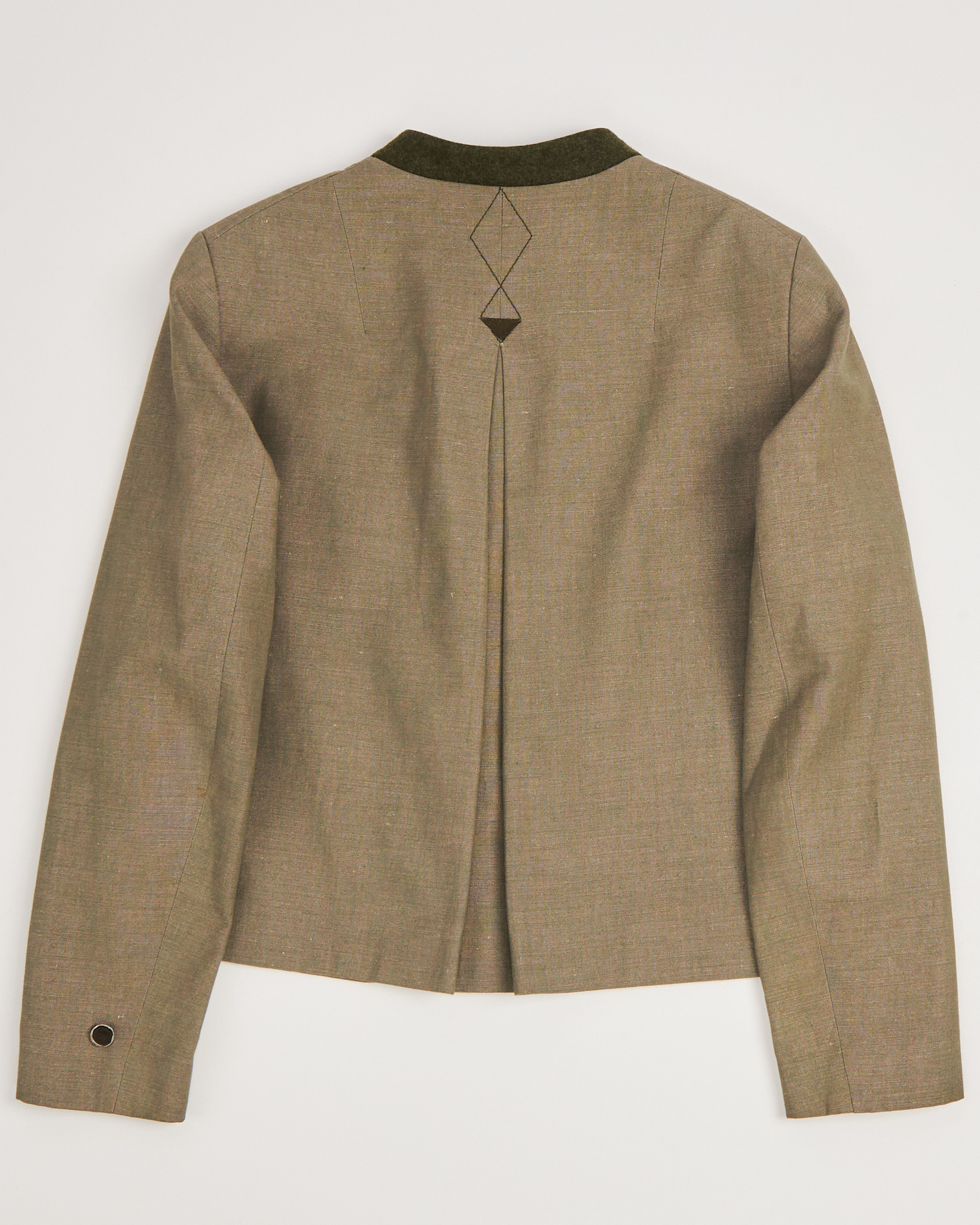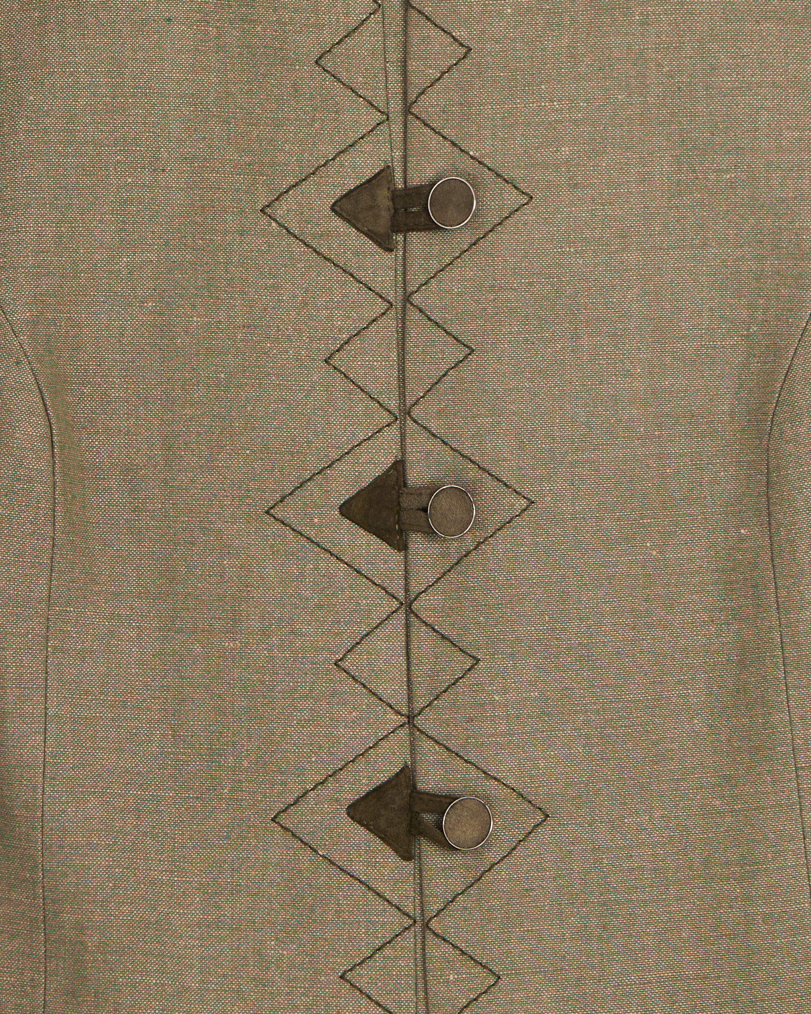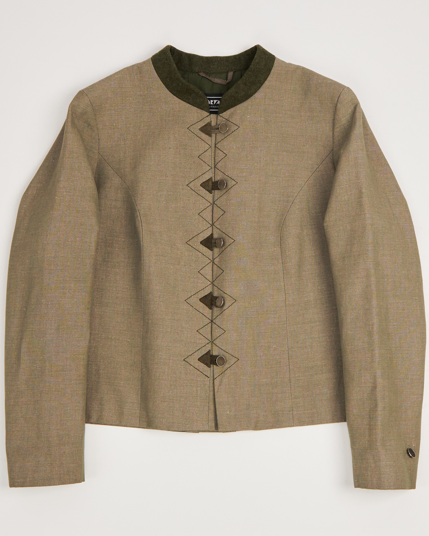 Жакет из хлопка Sportalm. Приталенный крой, воротник отделан мягким текстилем. Центральная застежка оформлена геометрическим рядом с контрастными элементами и металлическими пуговицами. Made in Austria.