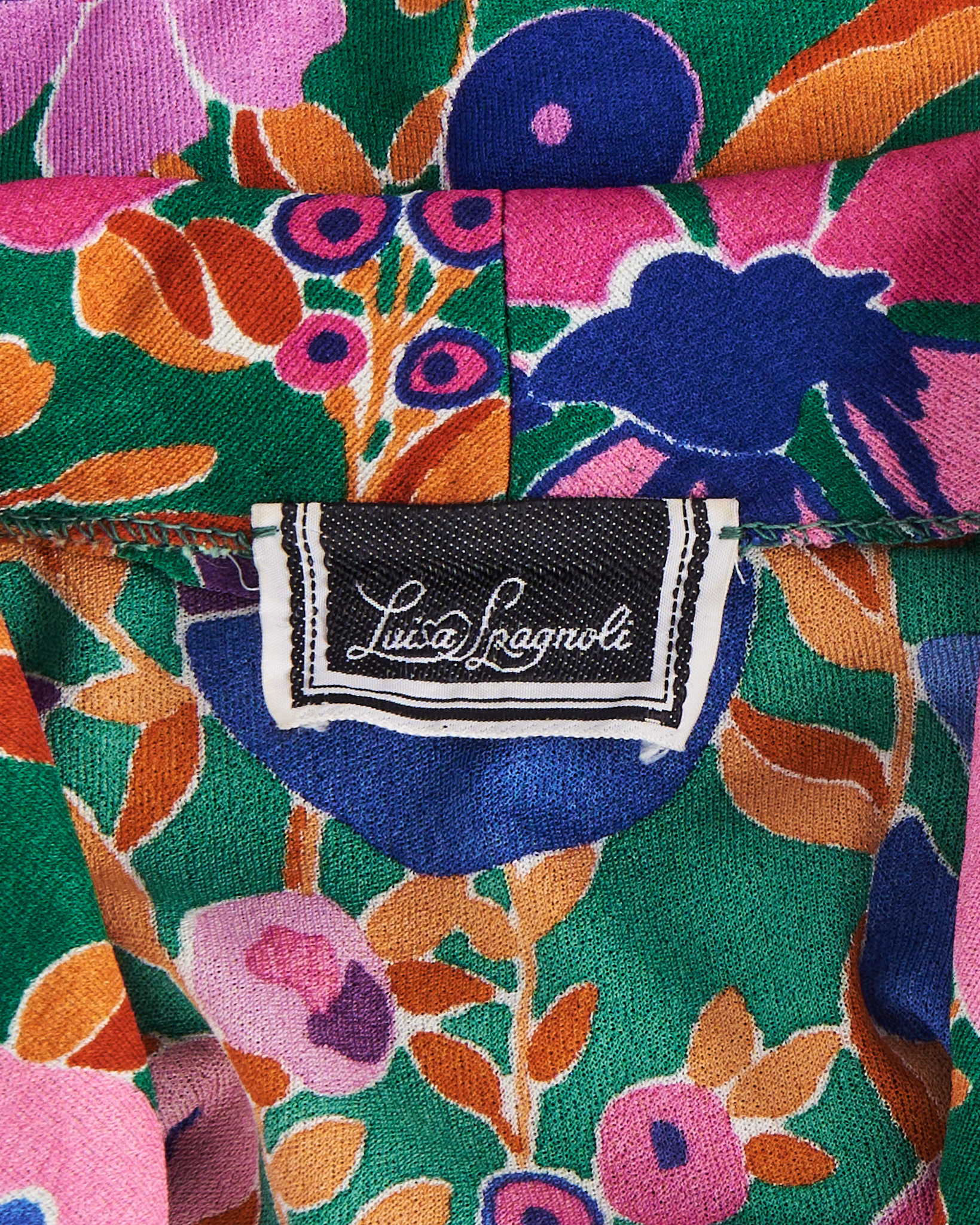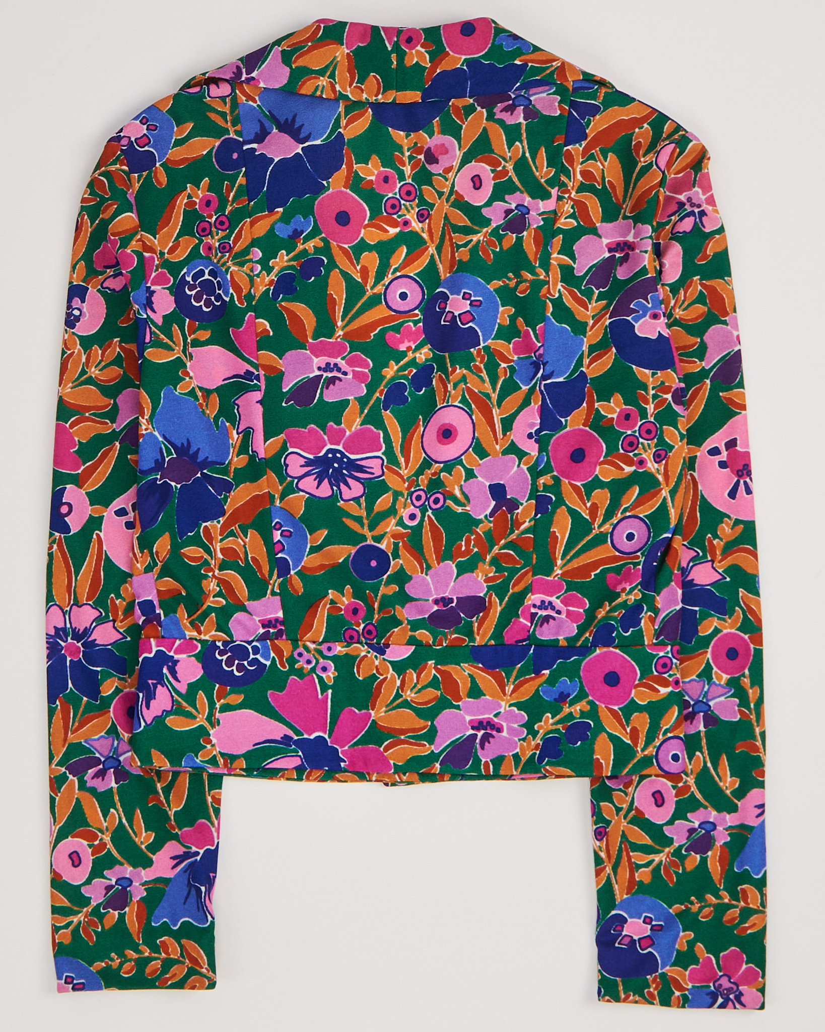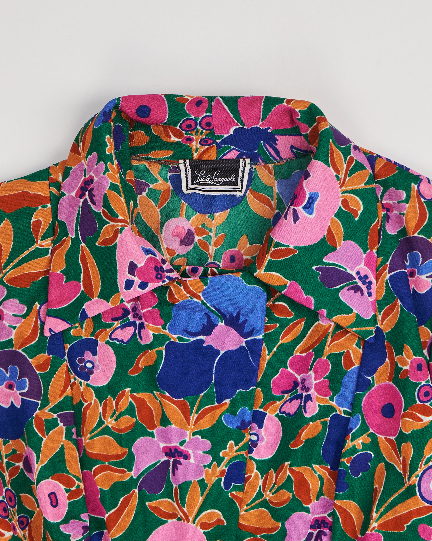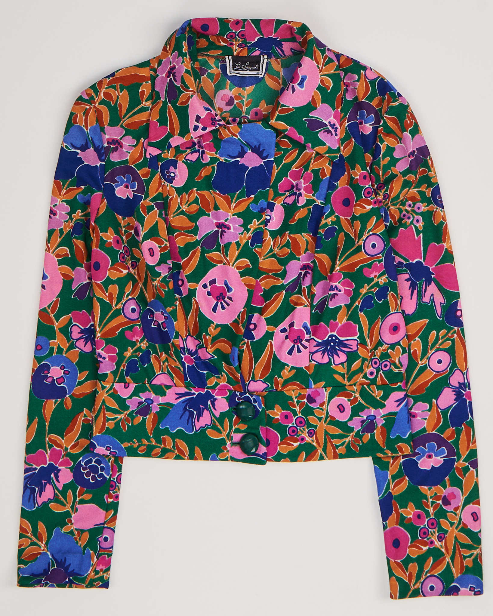 Укороченный винтажный жакет итальянского бренда Lusia Spagnoli с цветочным принтом, 80-е годы. V-образный вырез. Приталенный силуэт. Крупные зеленые пуговицы из пластика.