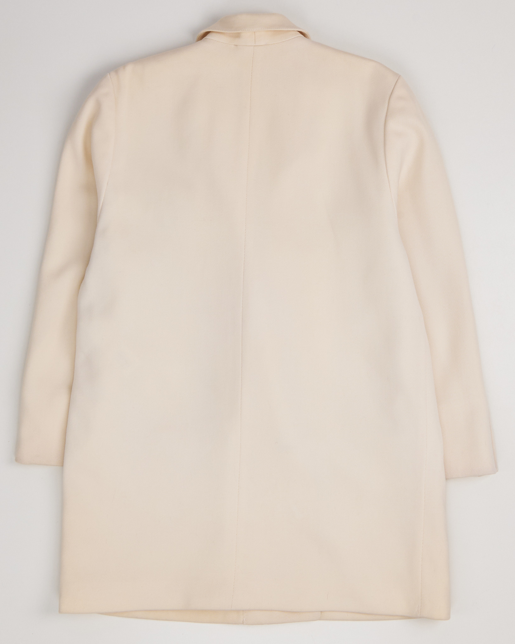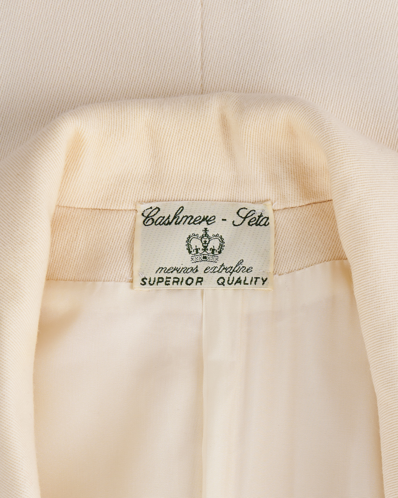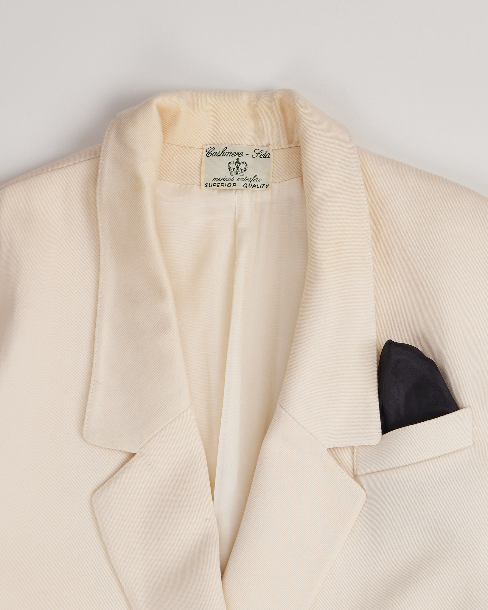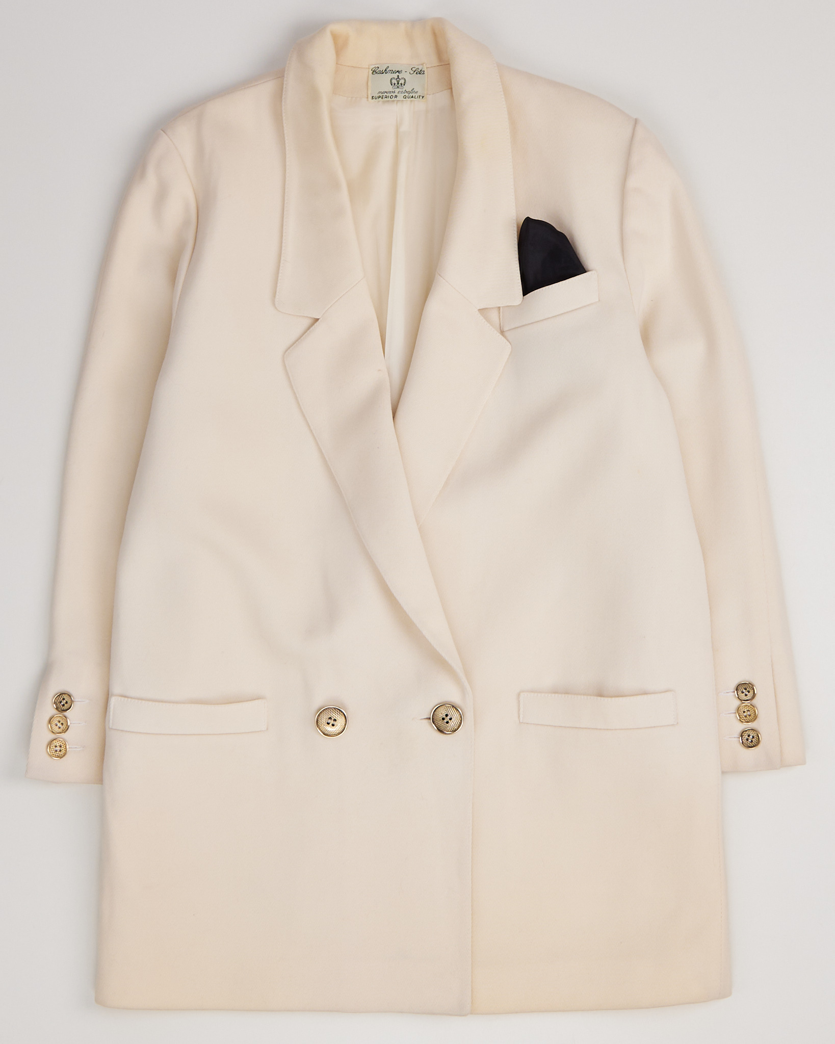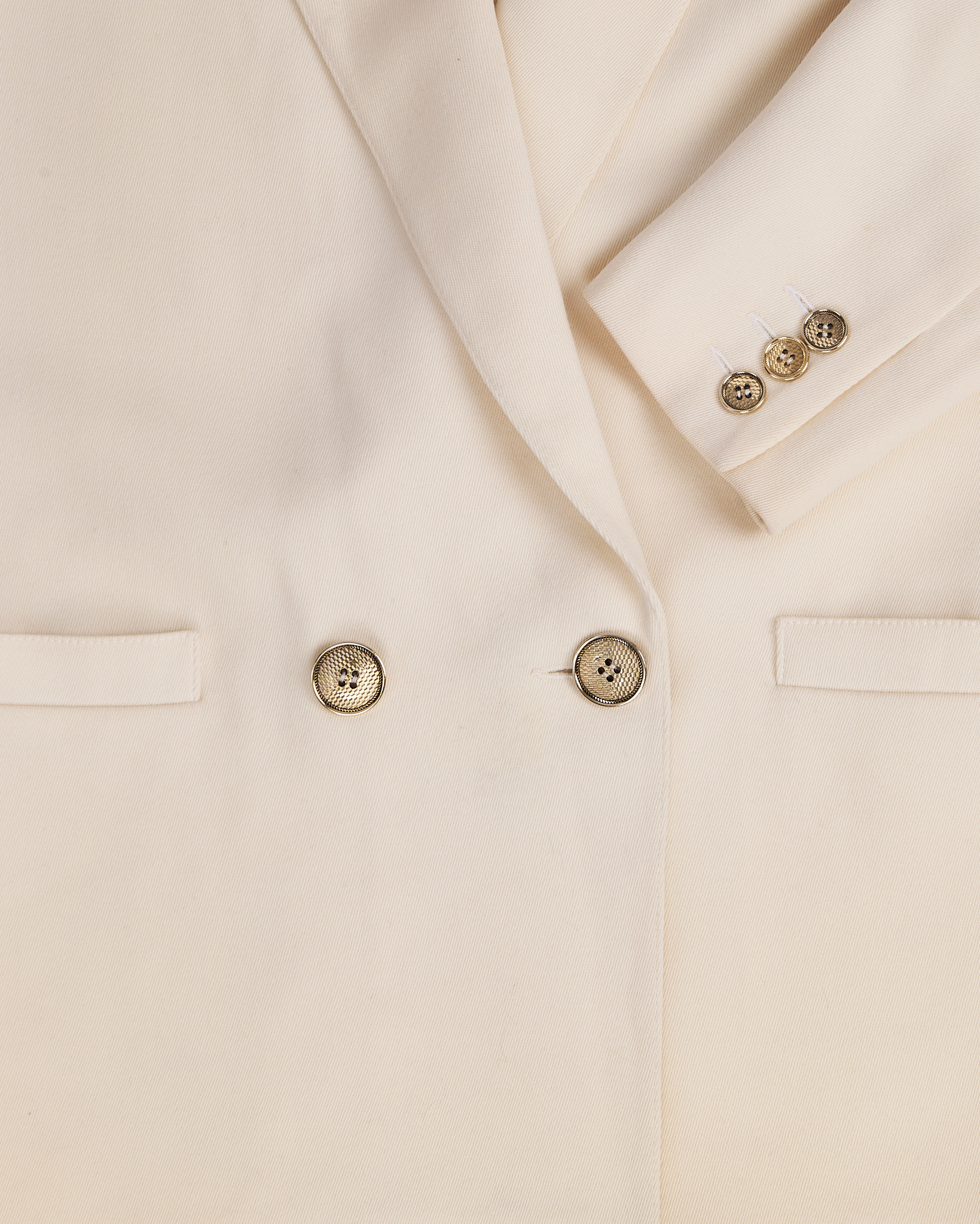 Жакет из шерсти в кремовом оттенке. Прямой силуэт, свободная посадка. С широкими лацканами, двойными рядами пуговиц с фактурным золотистым покрытием. И аккуратными прорезными карманами. На рукавах декоративные пуговицы, в нагрудном кармане контрастный платок