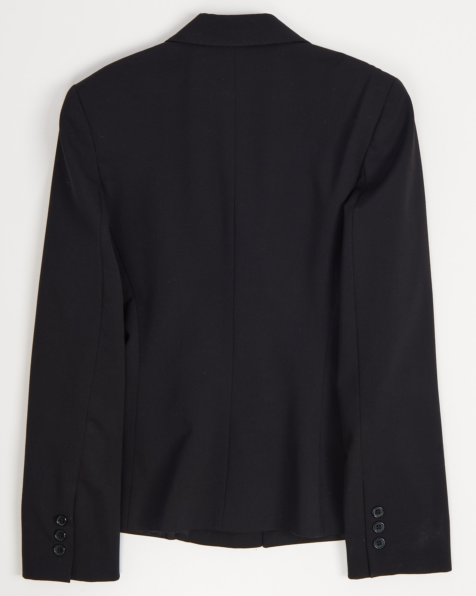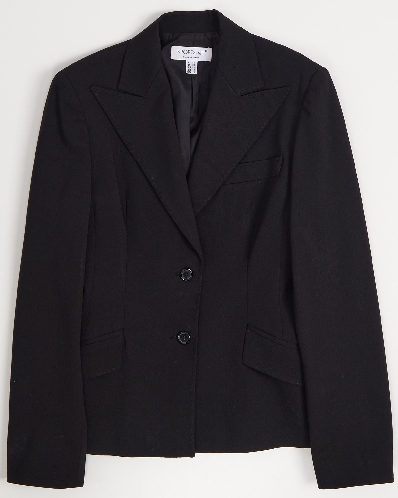 Пиджак от итальянского бренда Sportstaff. Выполнен в глубоком черном оттенке с четкой линией плеч и выразительными лацканами. Посадка с акцентом на талию, детали в виде аккуратных клапанов и пуговиц на манжетах.