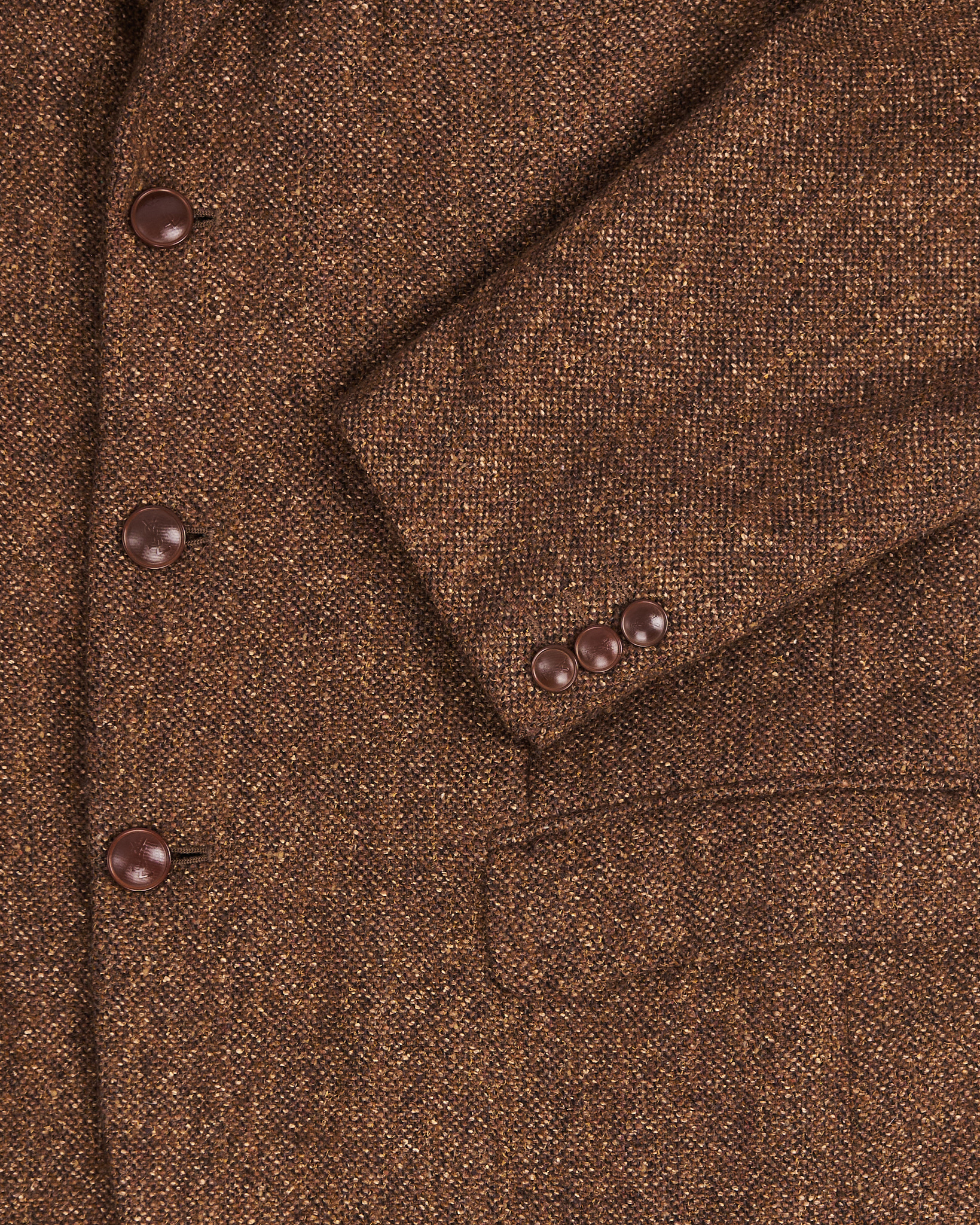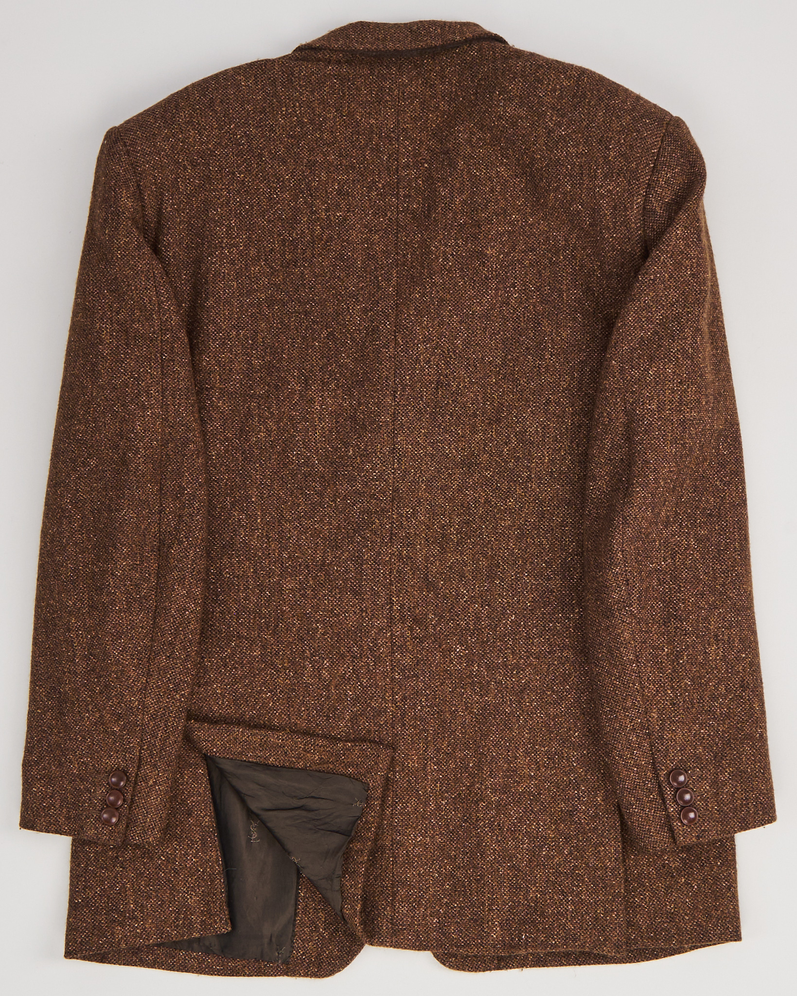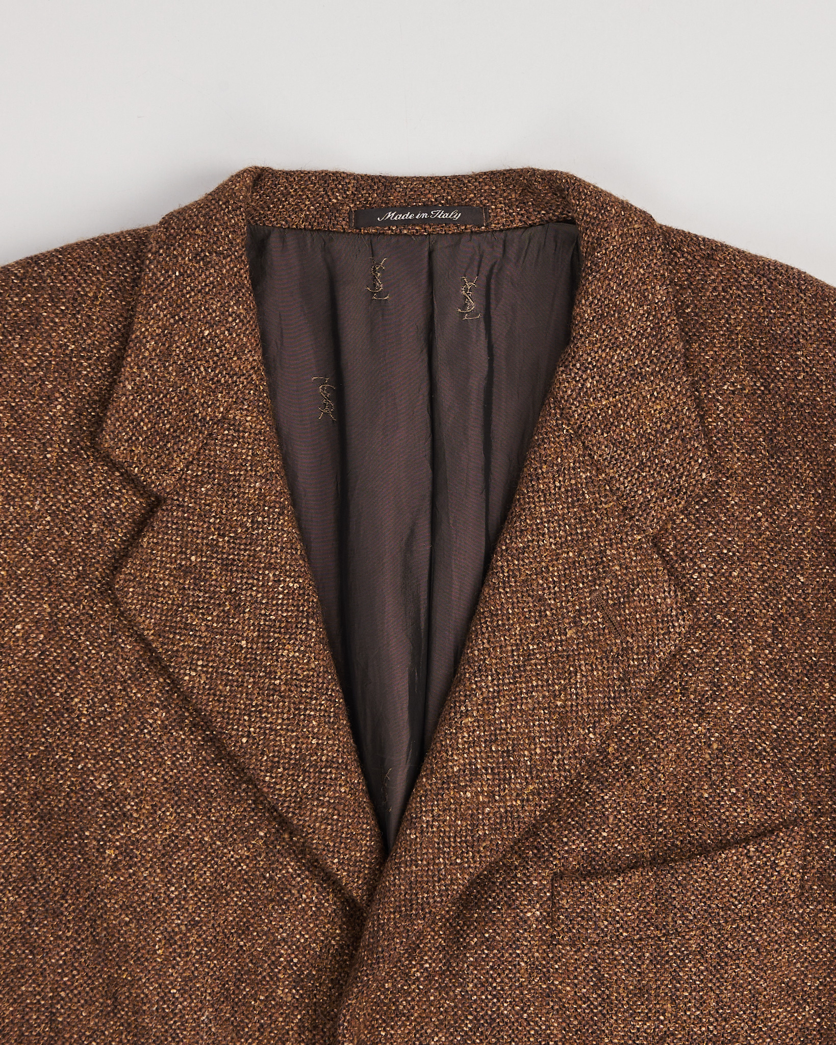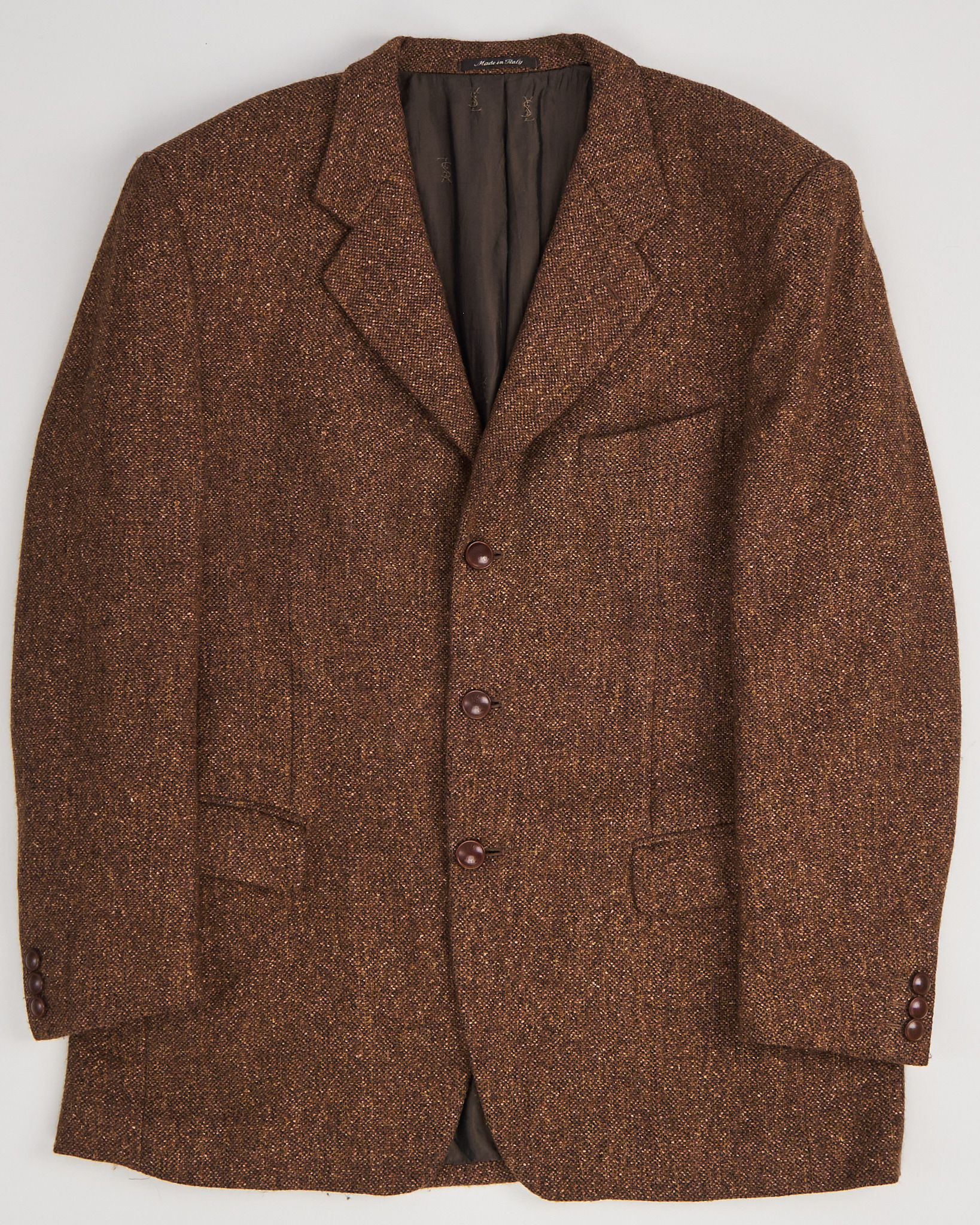 Пиджак с мужского плеча от итальянского бренда Yves Saint Laurent  из тонкой шерсти и шелка. Модель коричневого меланжа с подкладкой из купро (разновидность вискозы). Классический крой с застежкой на три пуговицы, тремя карманами, подплечниками и двусторонней шлицей сзади.