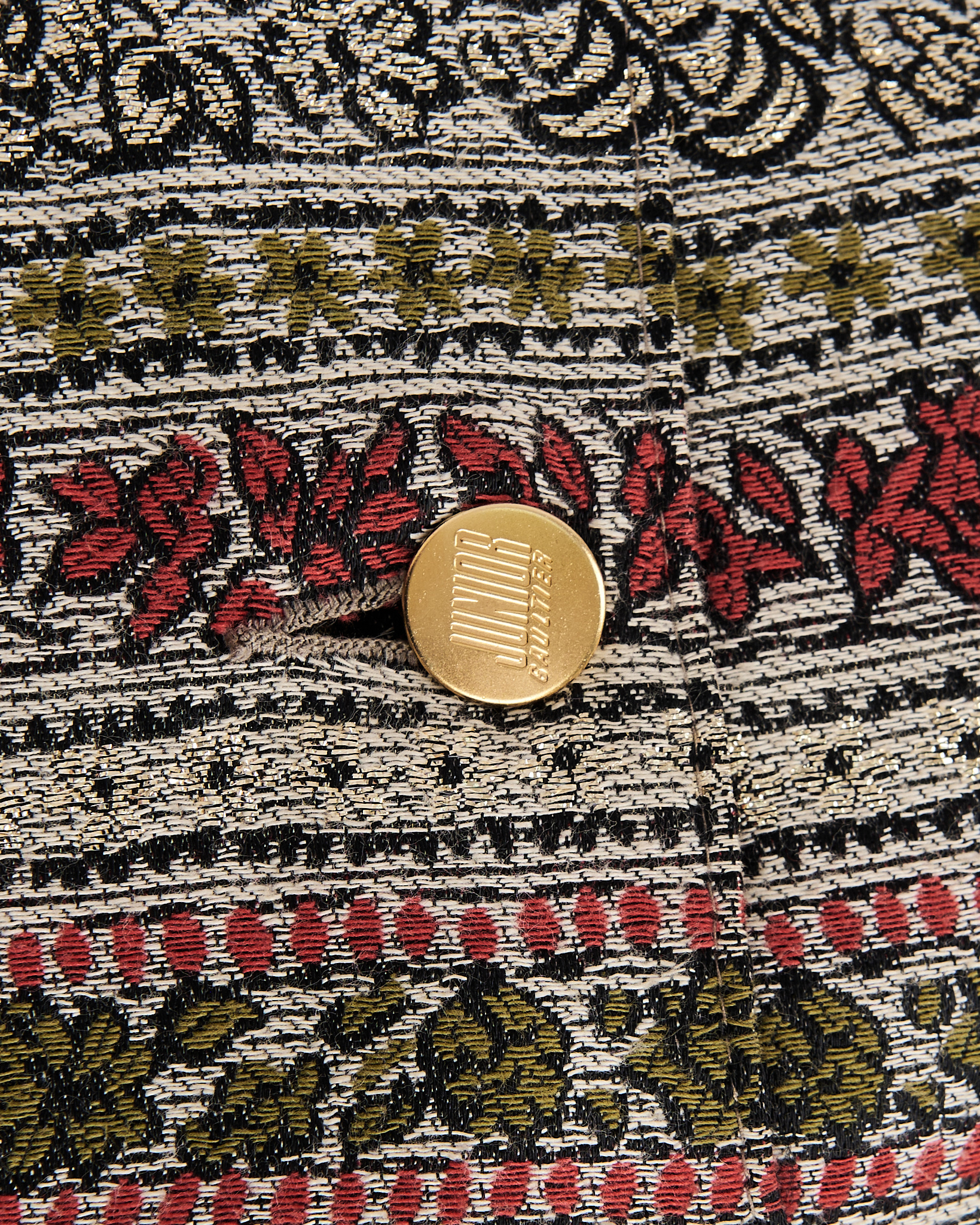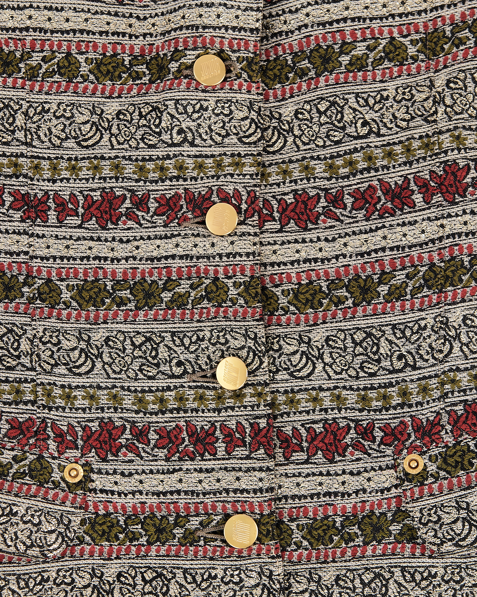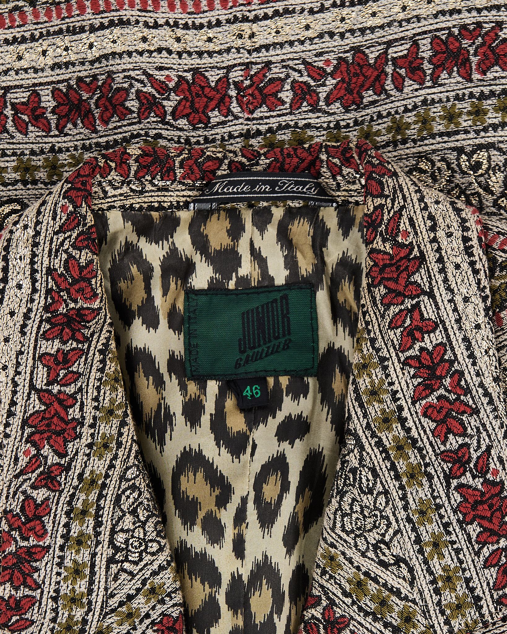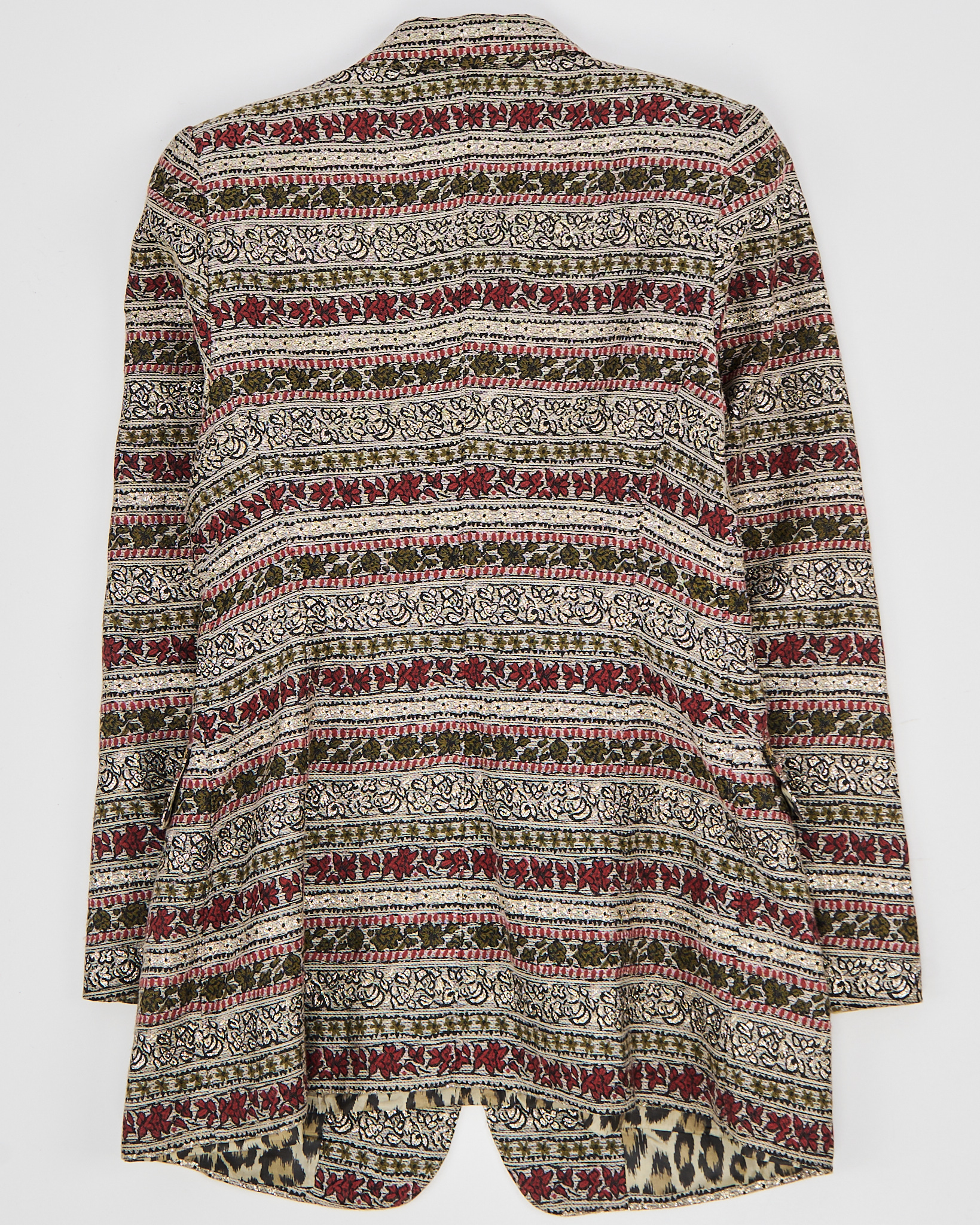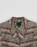 Жакет из плотного жаккарда с орнаментом и подкладкой с анималистичным принтом. Модель мягко садится по фигуре, сохраняя чёткую линию плеч и аккуратный силуэт. Золотистые пуговицы с тиснением.