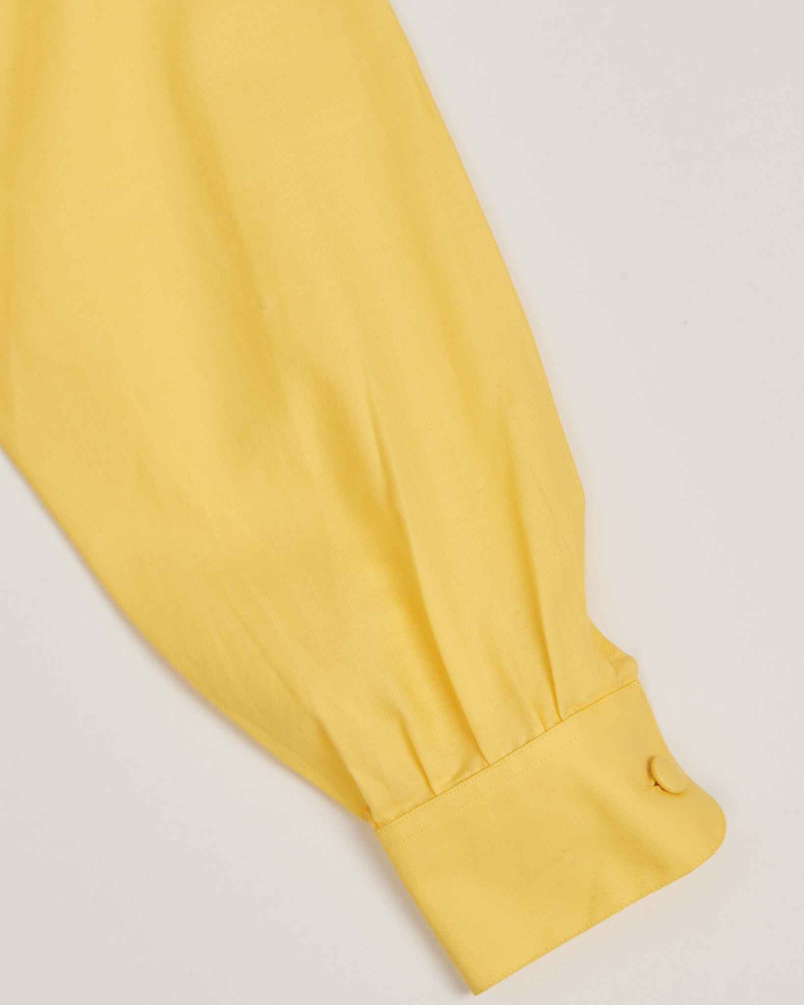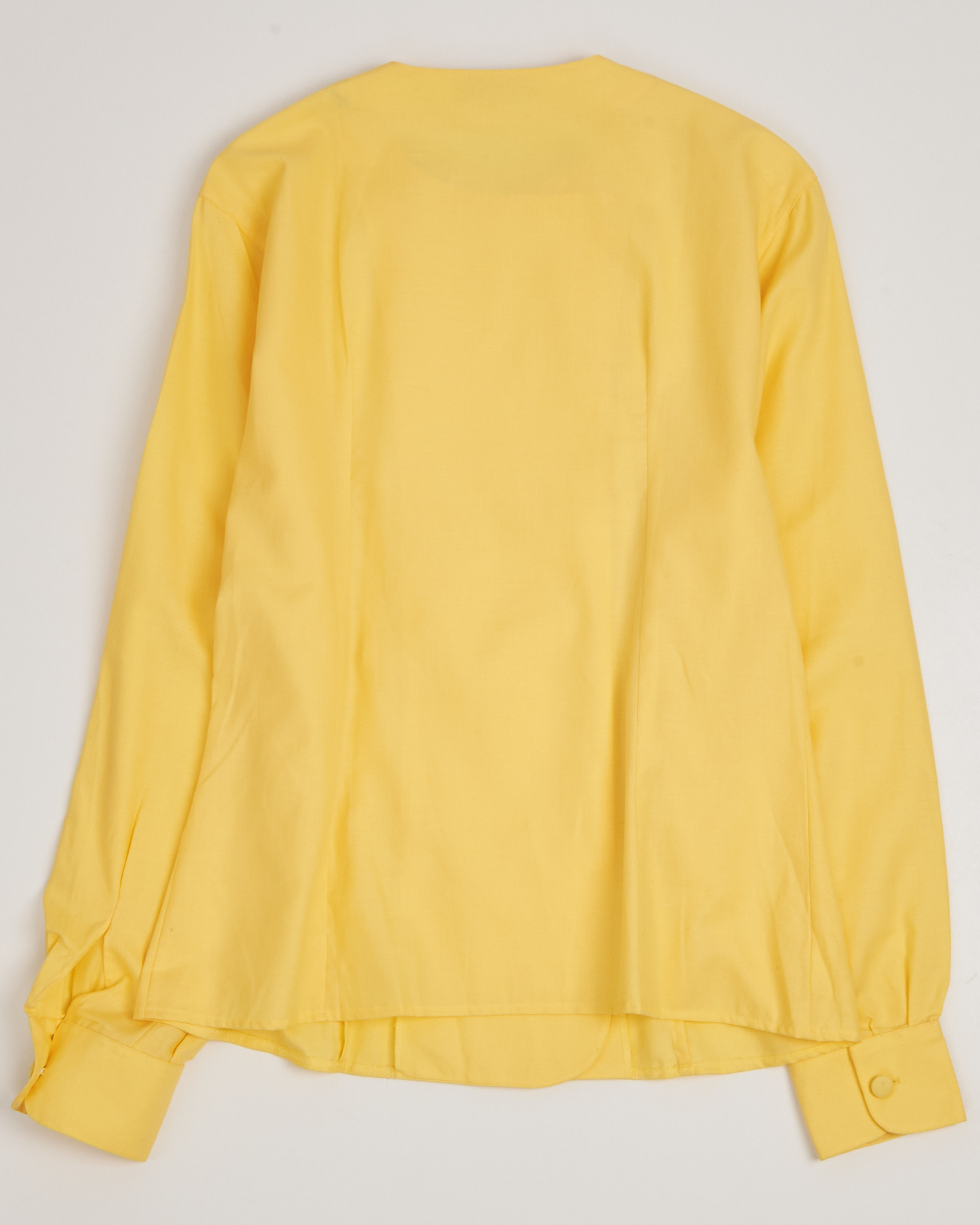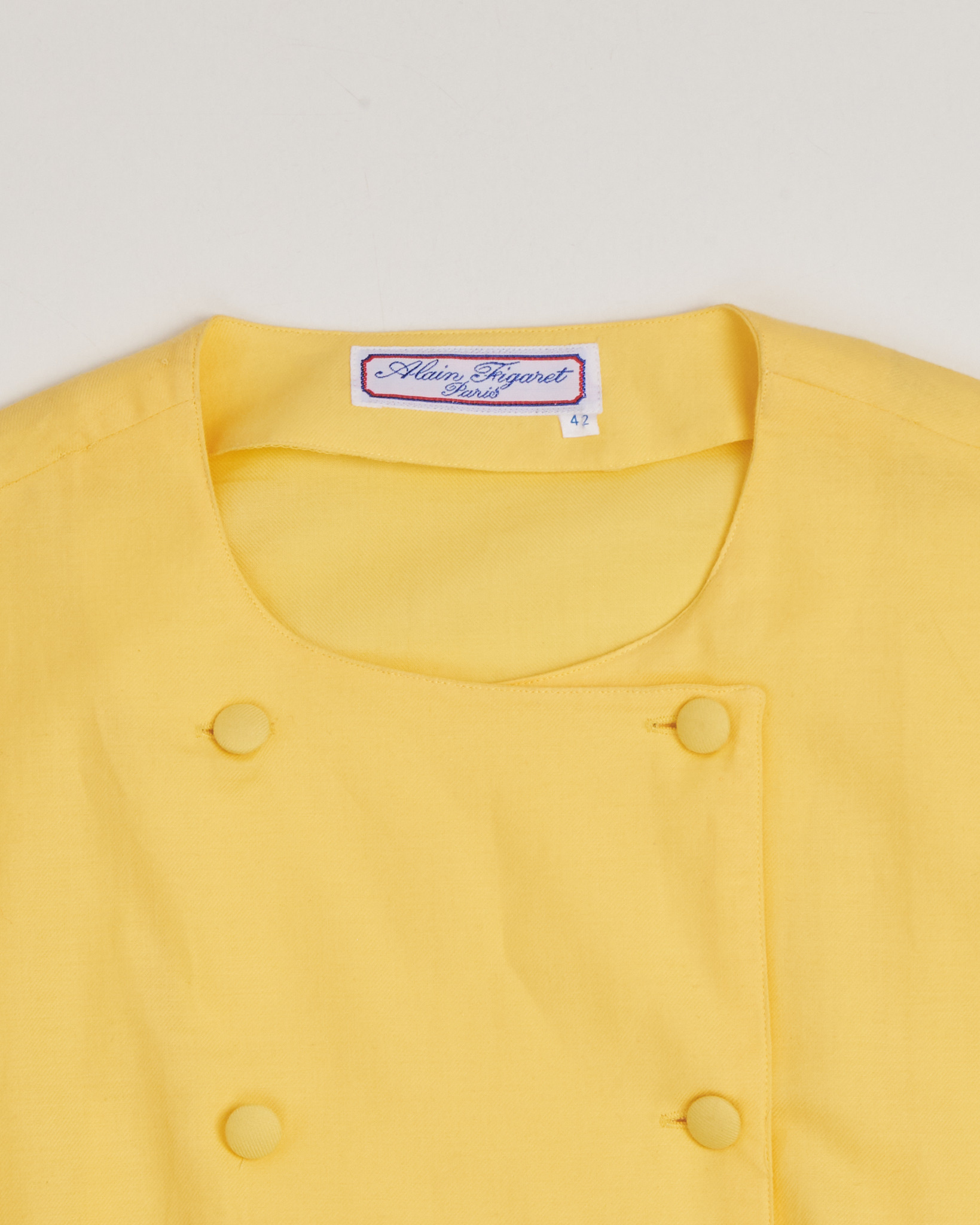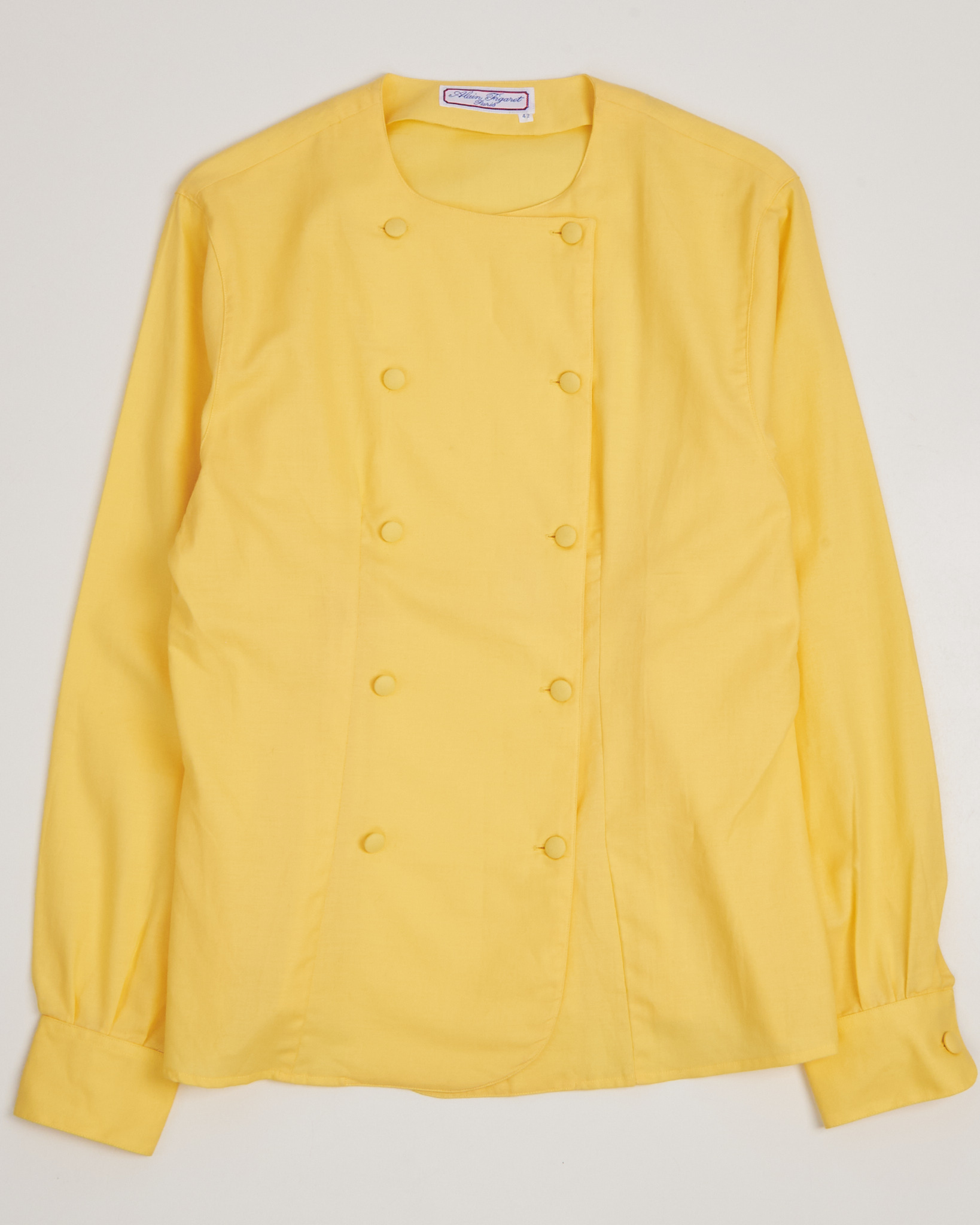 Яркая желтая блуза от Alain Figaret. Классический, удлиненный прямой крой, двубортная застёжка с симметрично расположенными обтяжными пуговицами, округлый вырез горловины без воротника, рукава с манжетами на пуговицах.  Сочетание французского качества, мастерства и культуры.