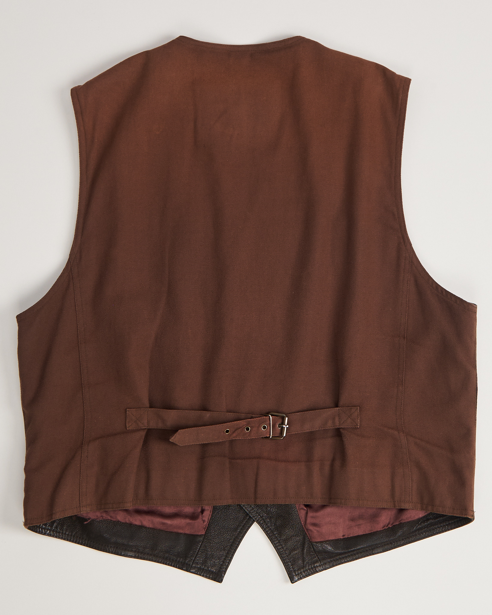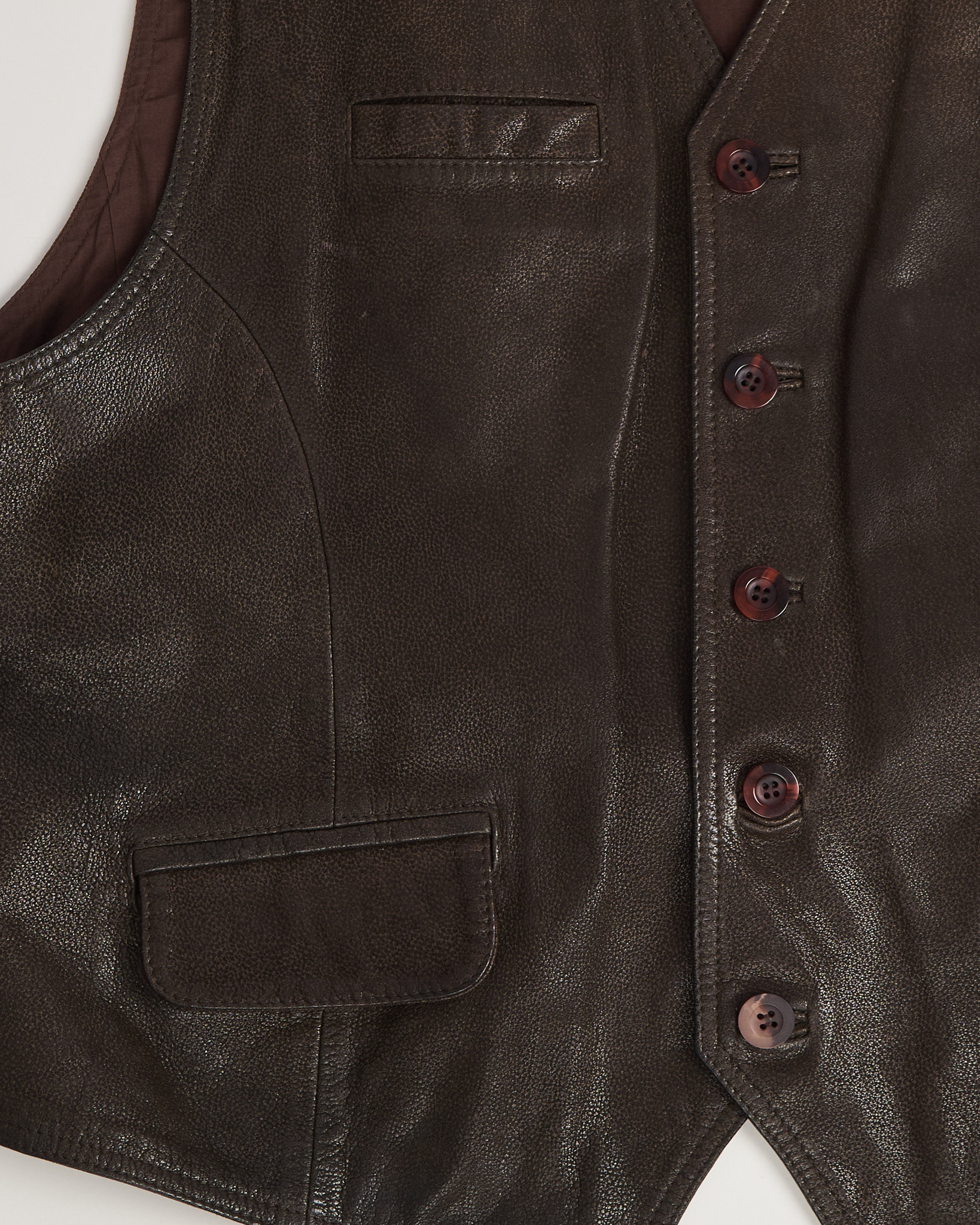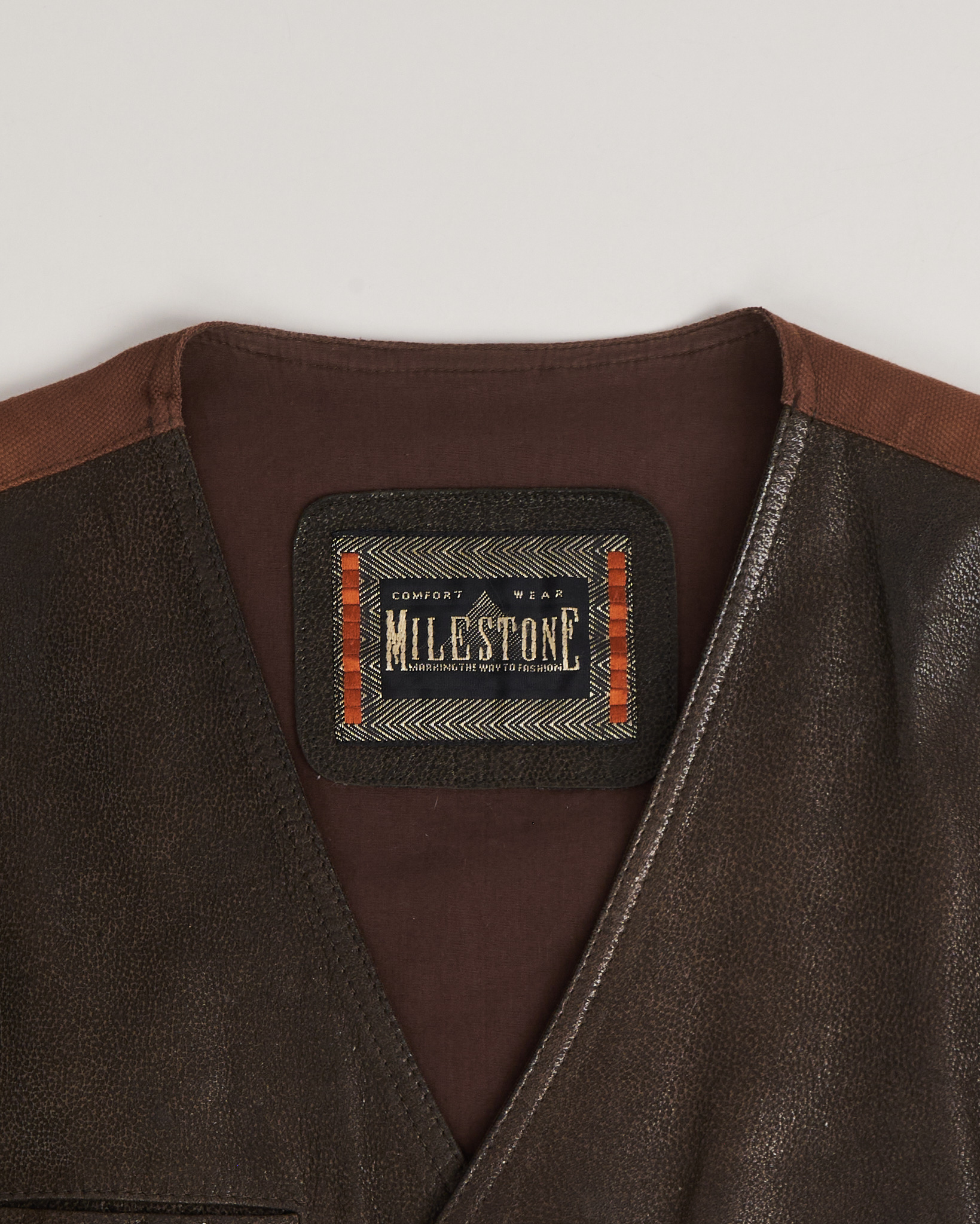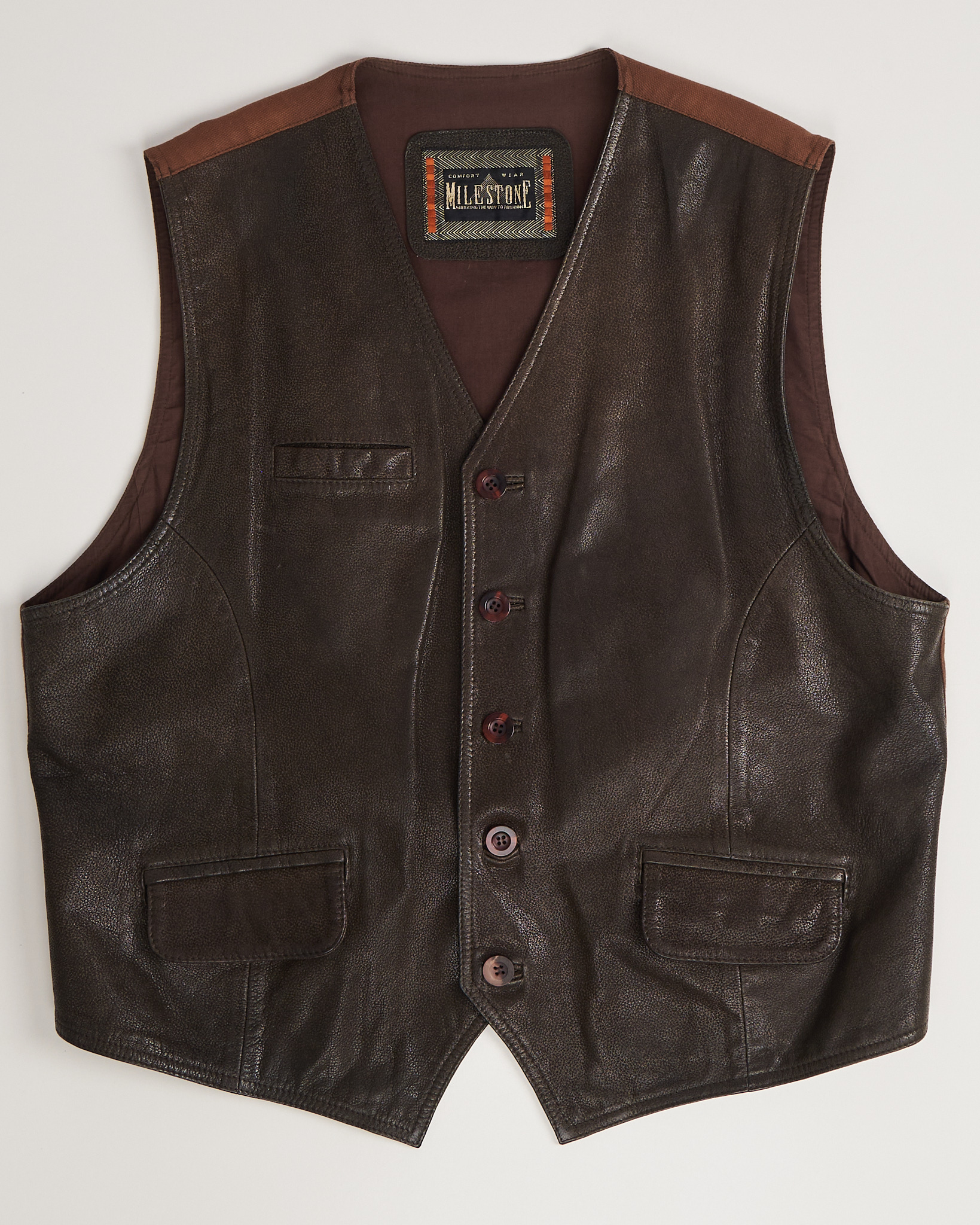Жилет из натуральной кожи Milestone коричневого цвета. Укороченная длина. Открытая линия плеч. Застежка на пуговицы. Три функциональных кармана. Спина дополнена регулируемым хлястиком с пряжкой.