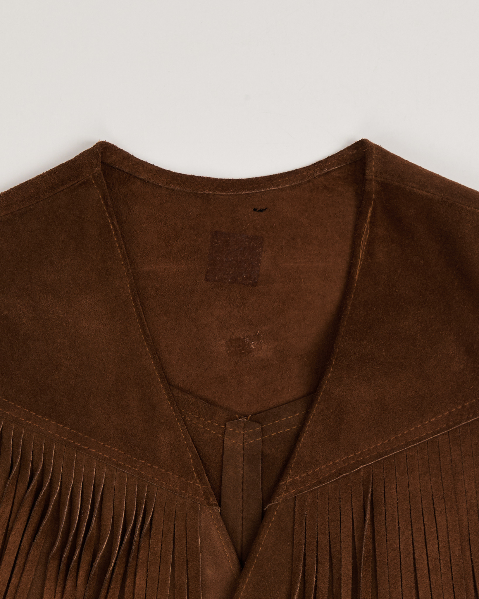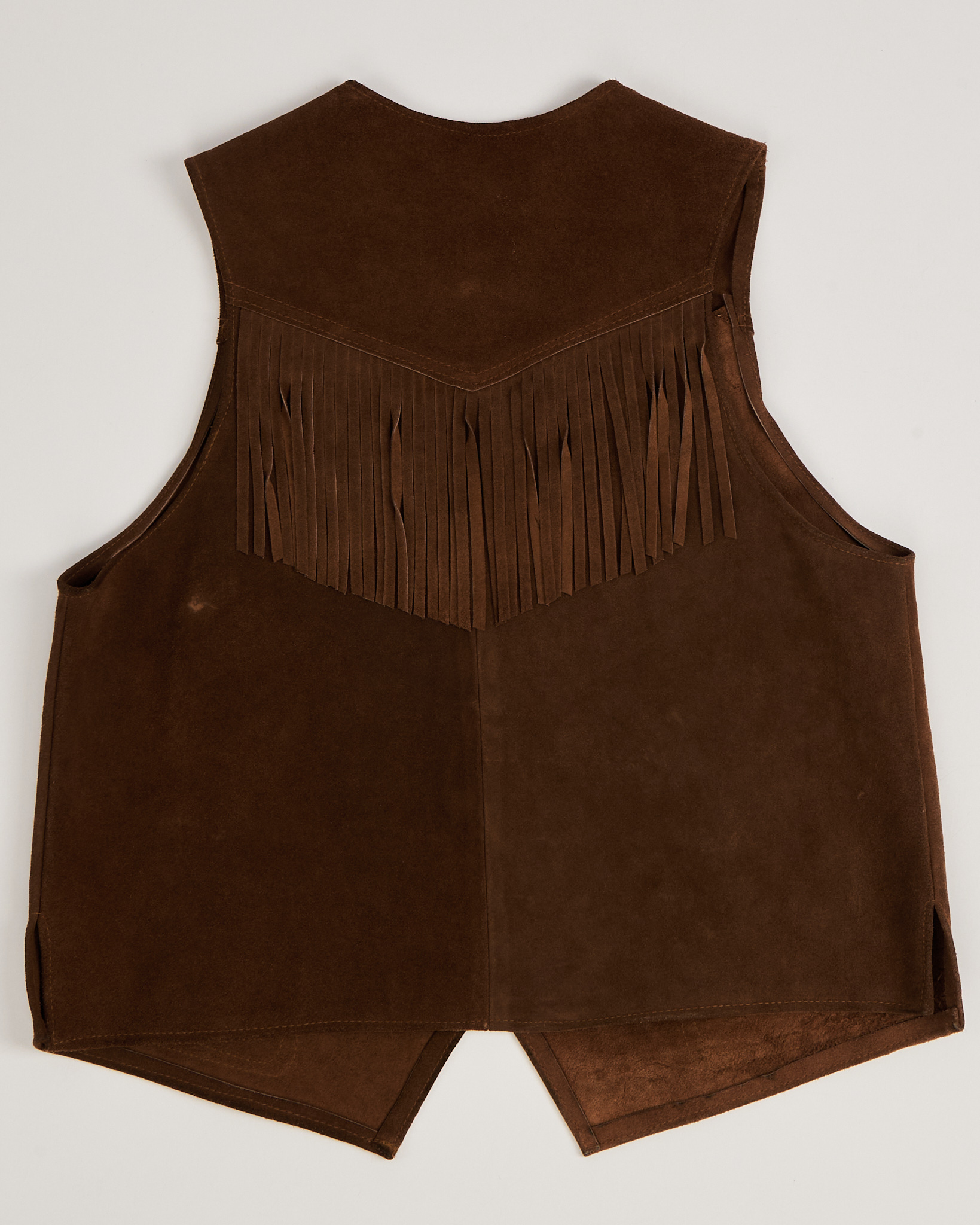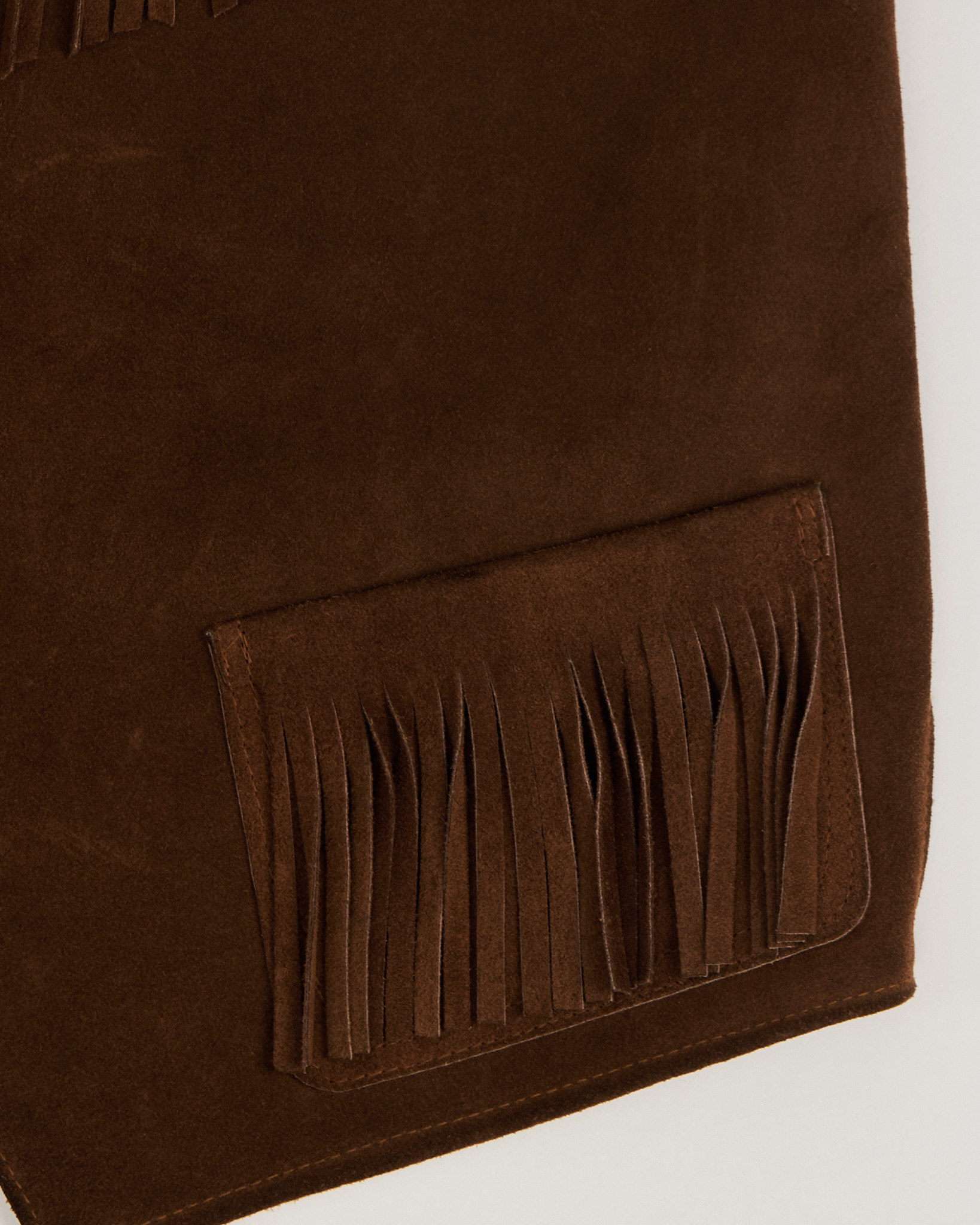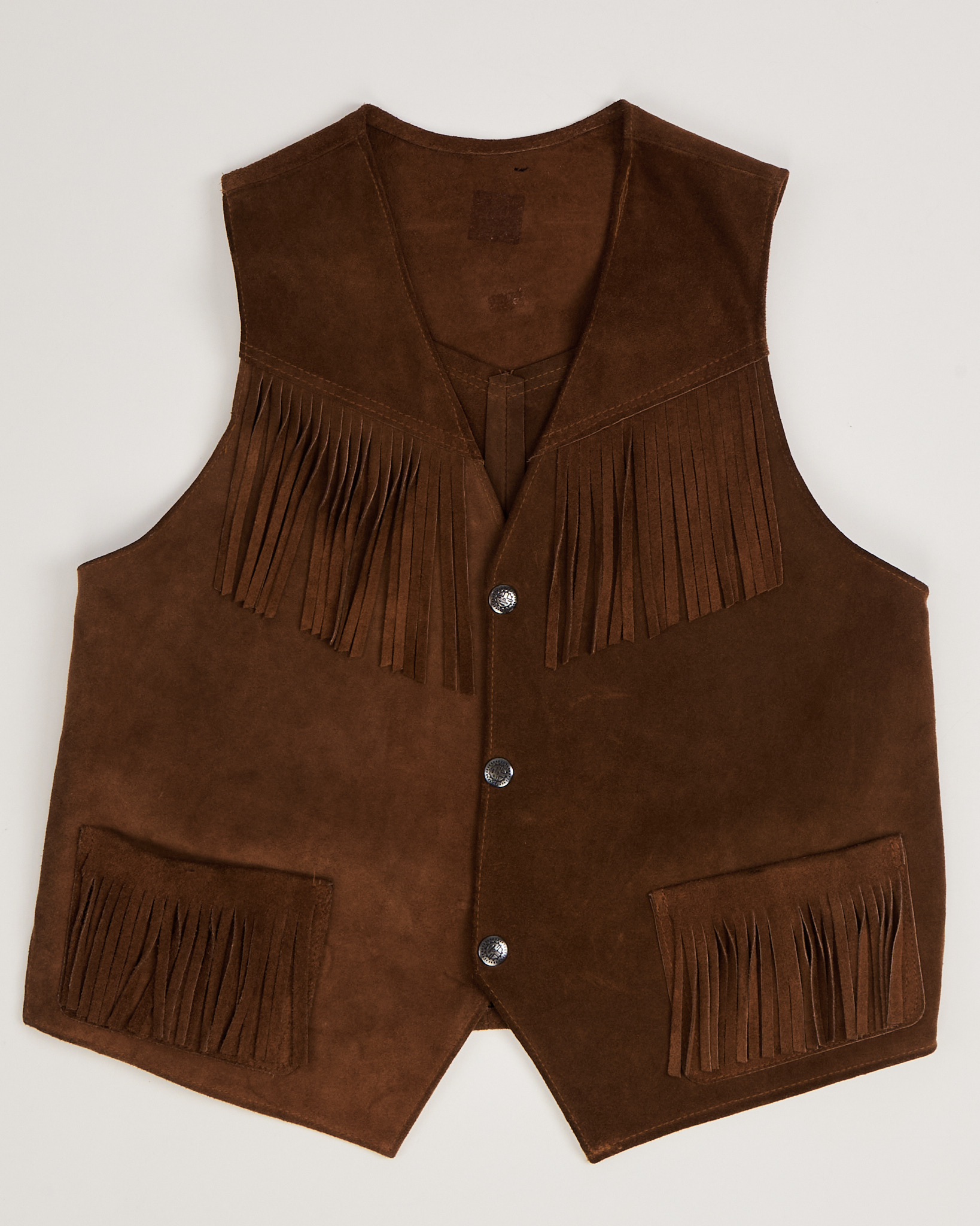 Жилет выполнен в тёплом коричневом оттенке, прямого силуэта с свободной посадкой по корпусу. С глубоким V-вырезом и металлическими кнопками. Бахрома на кокетке и карманах.