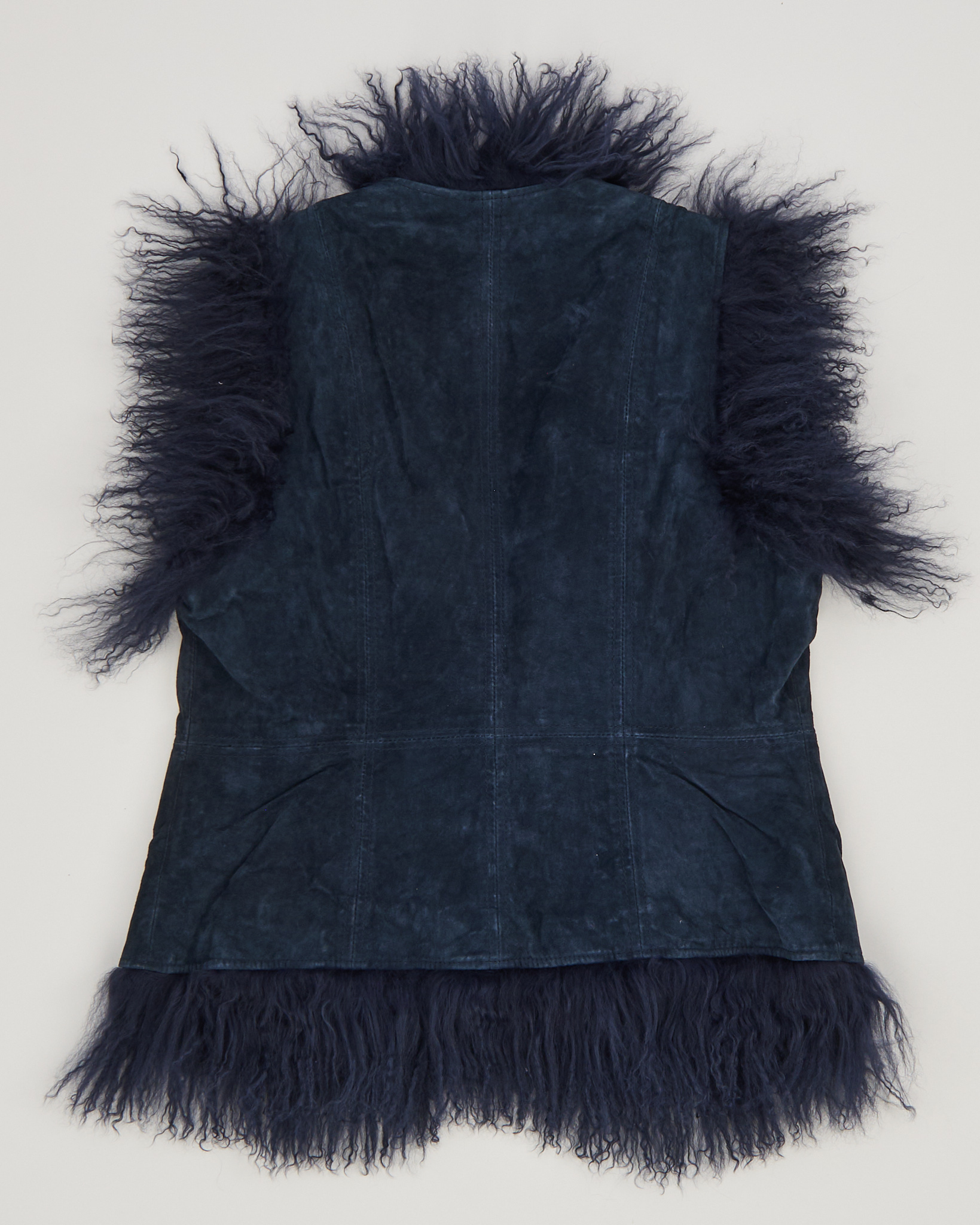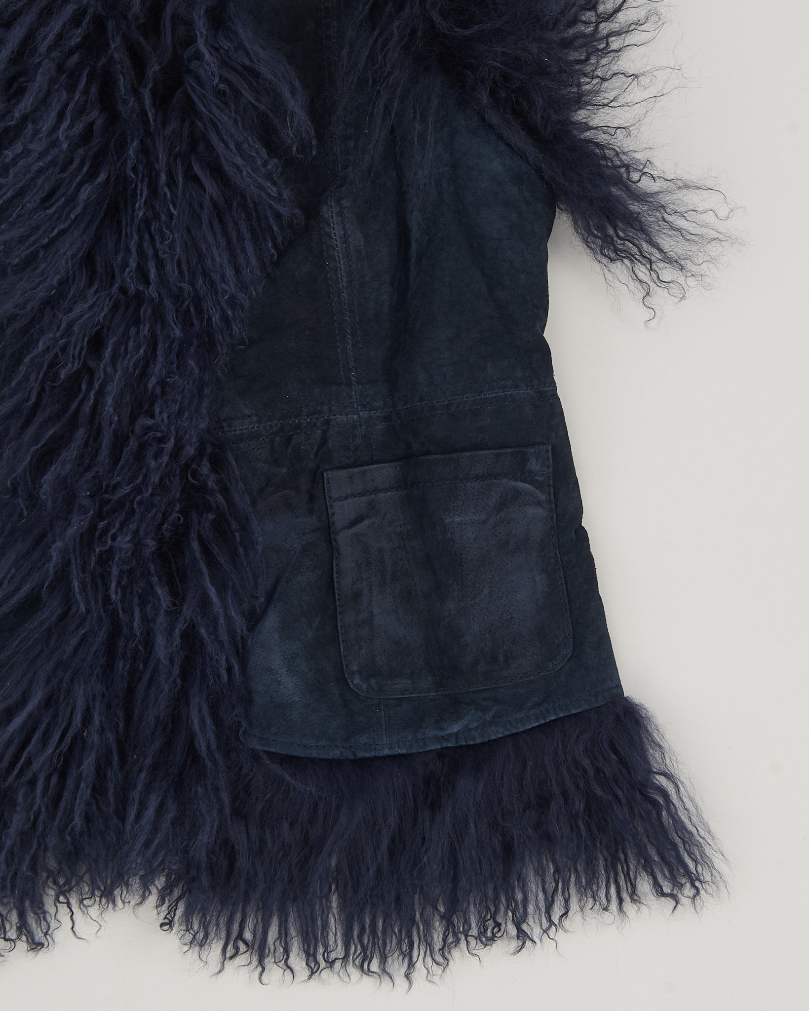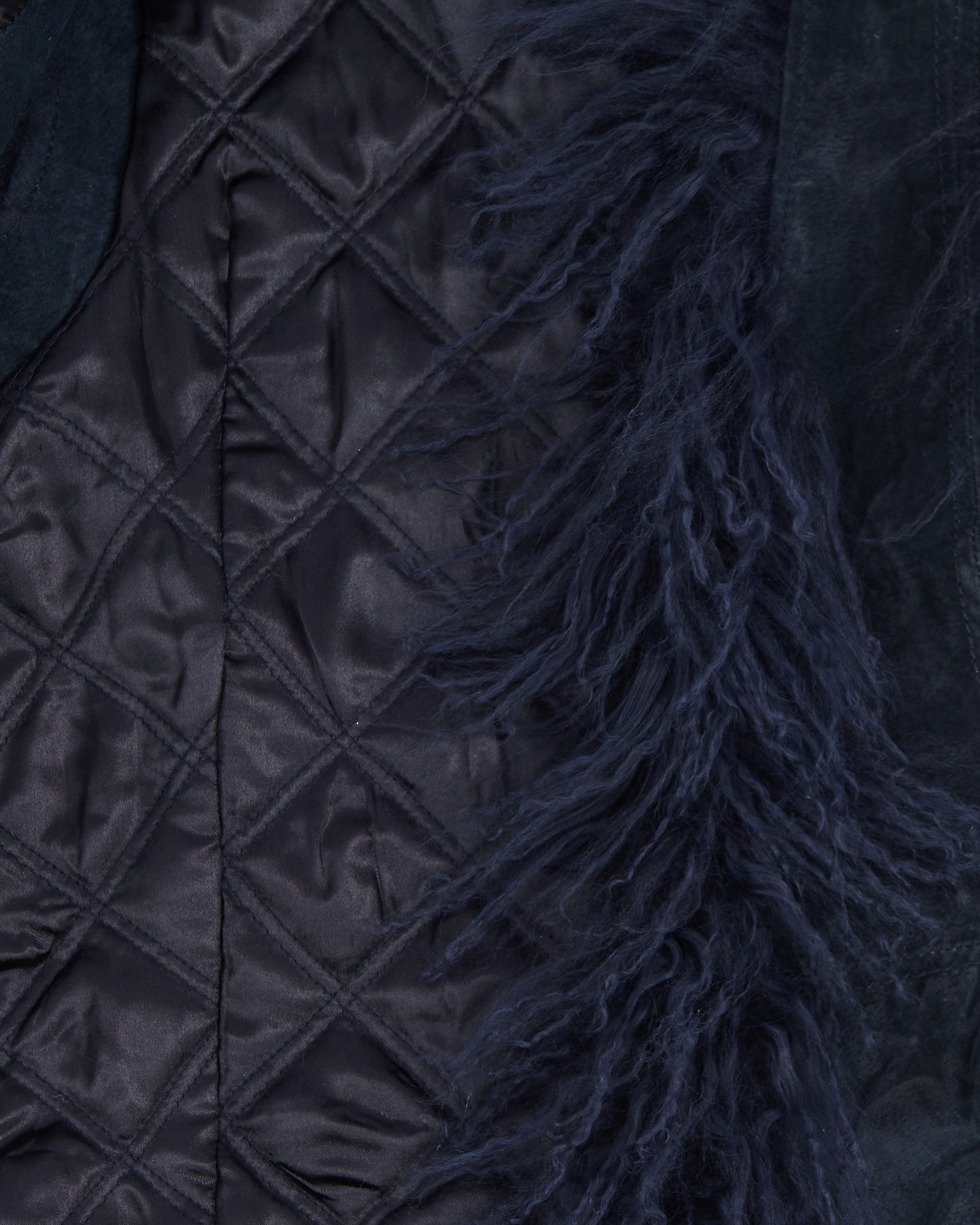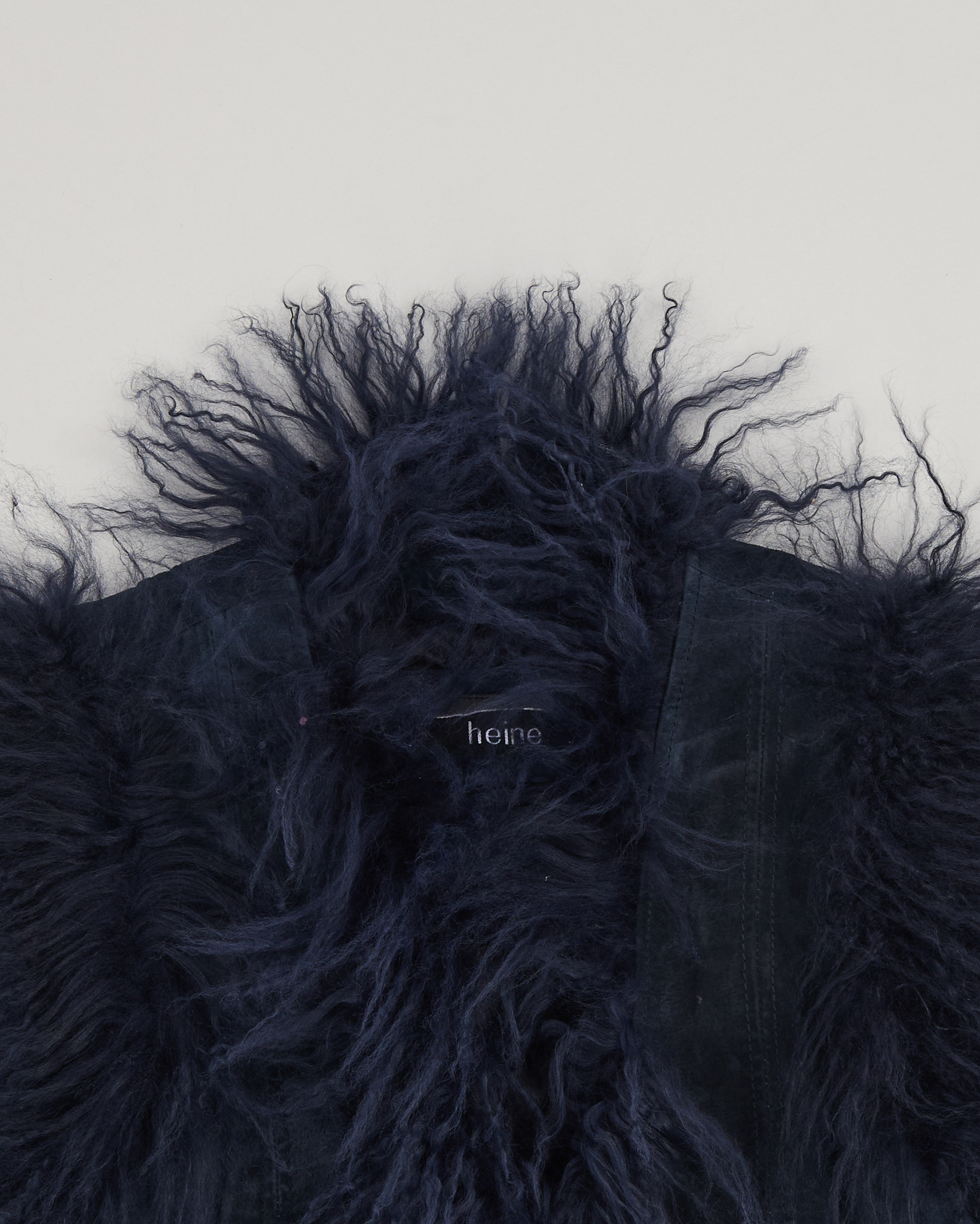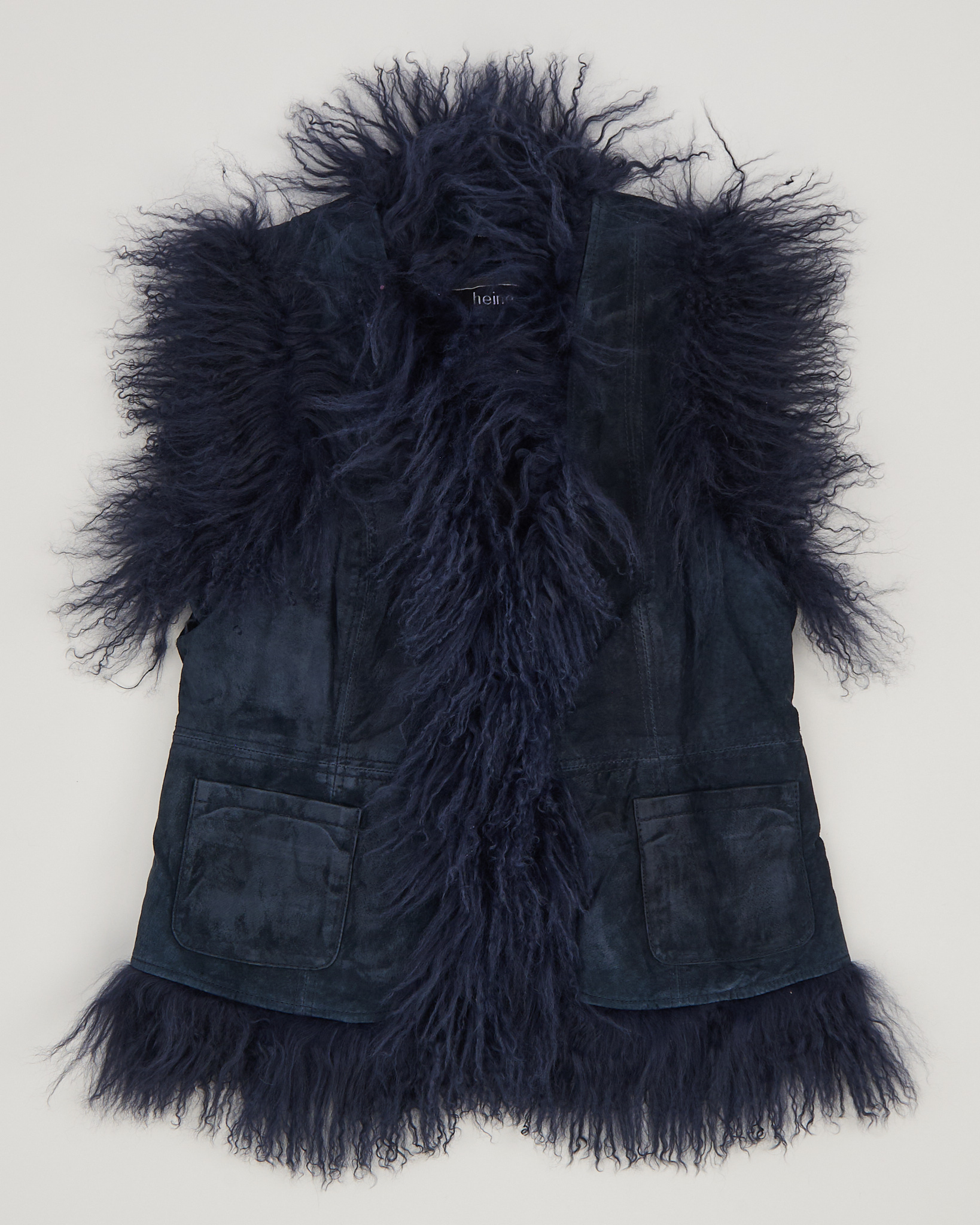 Жилет Heine из натуральной замши с отделкой мехом ламы по краю. Посадка приталенная, мех воздушный и объёмный. Внутри стёганая подкладка, по бокам функциональные карманы, застежка на крючок.